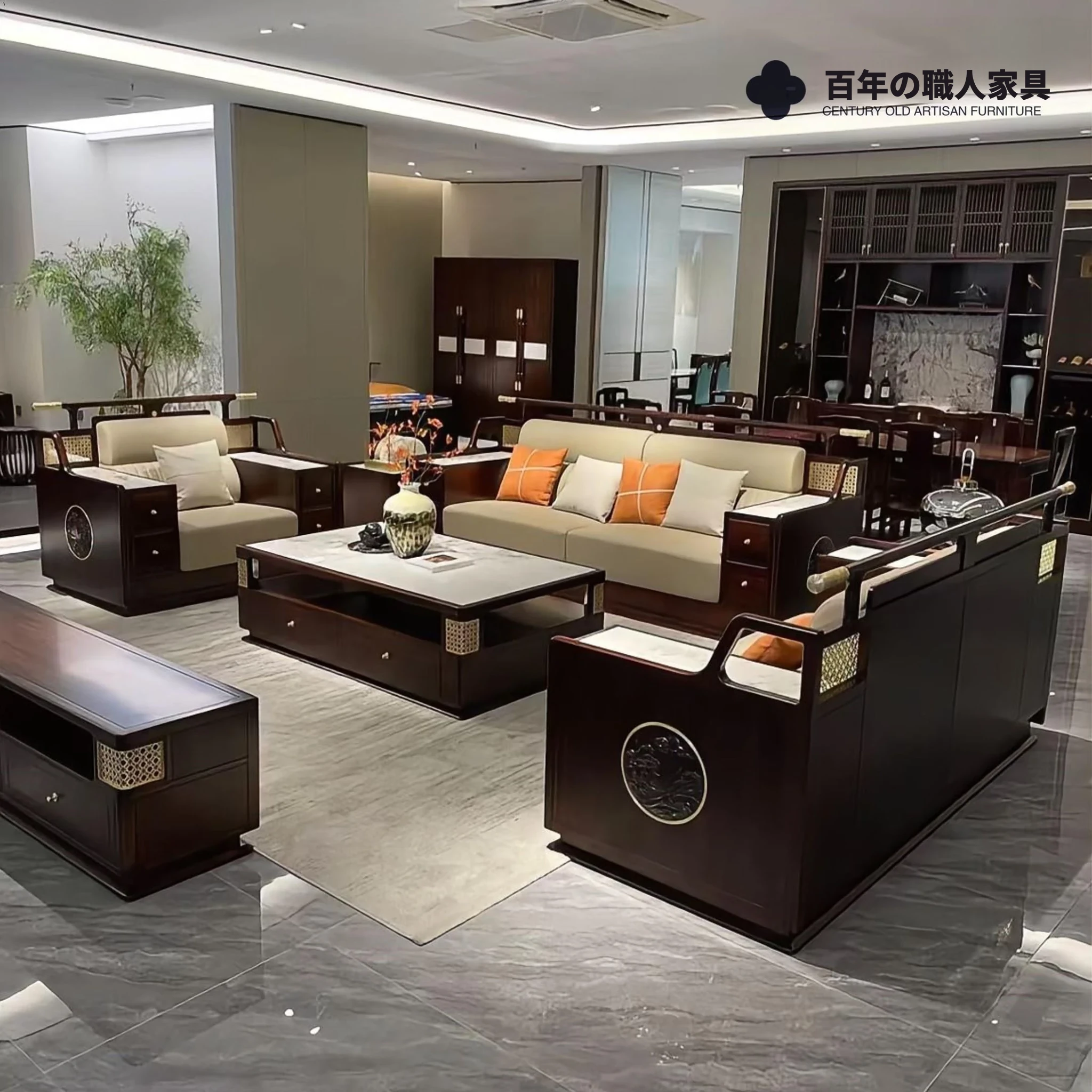 2024年新作!香樟木全実木製の現代中式ソファセット - 大小さまざまなお部屋にぴったりのアンティーク調彫刻デザインで、心地よいリビング空間を演出します!