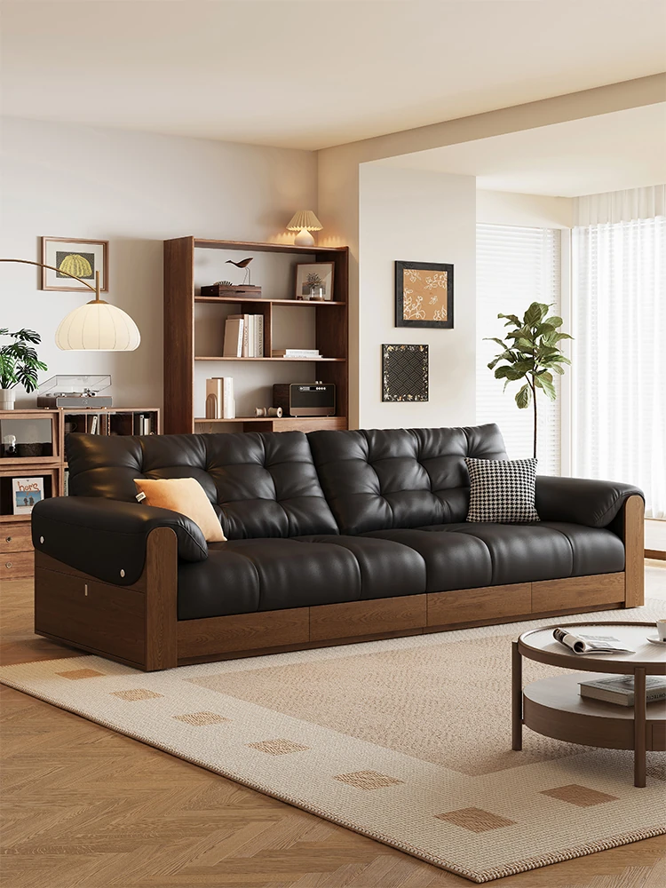 2025年新作!レトロな本革ソファ 三人掛け 中古風リビング用 無垢材ソファ ブラックカラーの洗練されたデザインで、あなたのリビングをスタイリッシュに演出します!