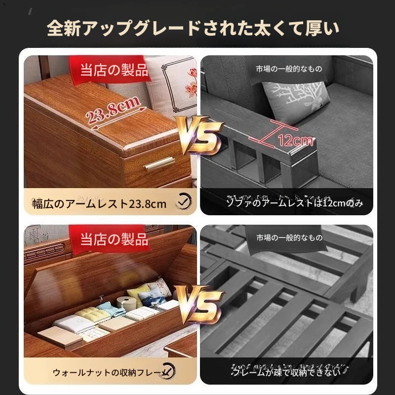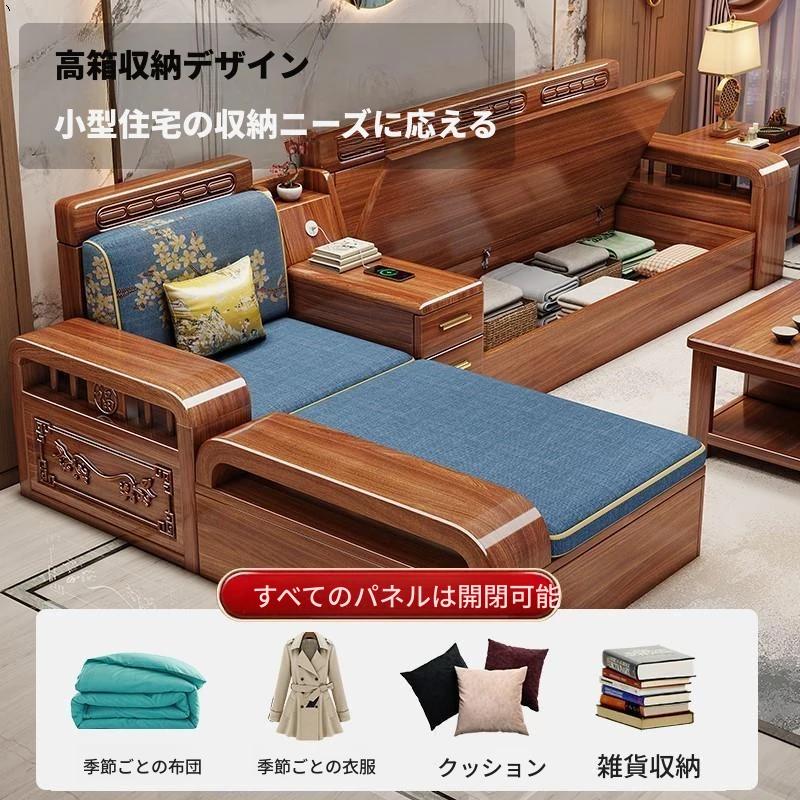 新中式スタイルのウォールナット無垢材ソファ|全木製|コンパクトなリビングに最適|冬夏両用の高収納ソファ|スタイリッシュなデザインで、空間を有効活用!