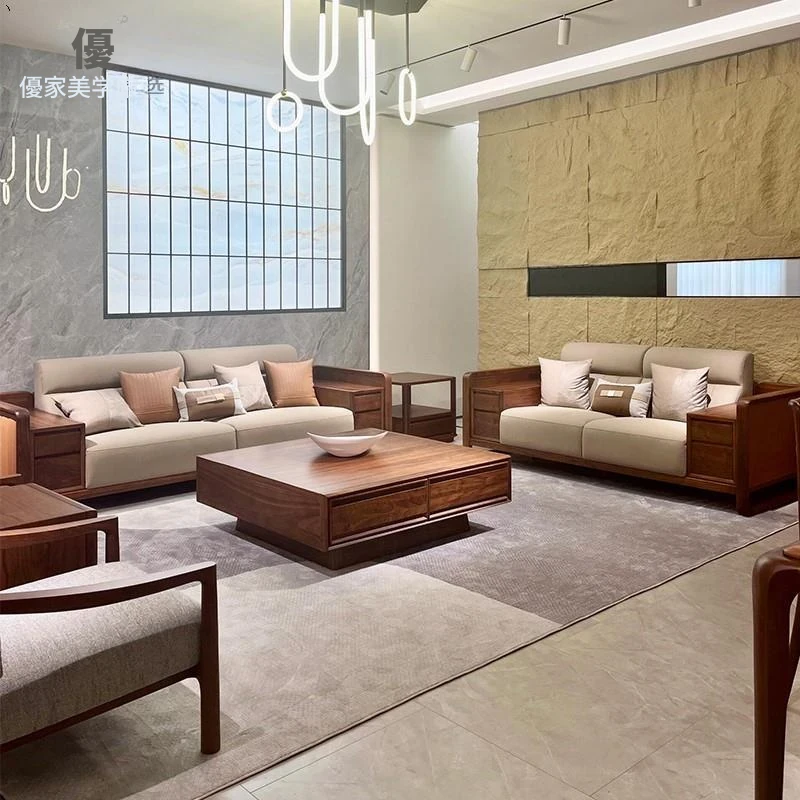 新中式デザインのブラックウォールナット無垢材ソファセット - 冬夏兼用、収納付き!狭いリビングにもぴったりのモダンでシンプルな家具。おしゃれで機能的な空間を演出します!