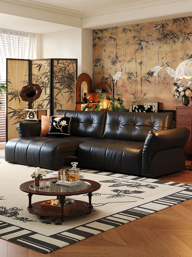 2025 New Vintage Solid Wood Sofa - Retro Black Leather Three-Seat Living Room Couch for a Timeless Elegance