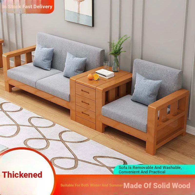 Elegant New Chinese Style Solid Wood 3-Seater Sofa Set with Drawers - Modern Minimalist Design for Small Spaces, Perfect for Cozy Living Rooms