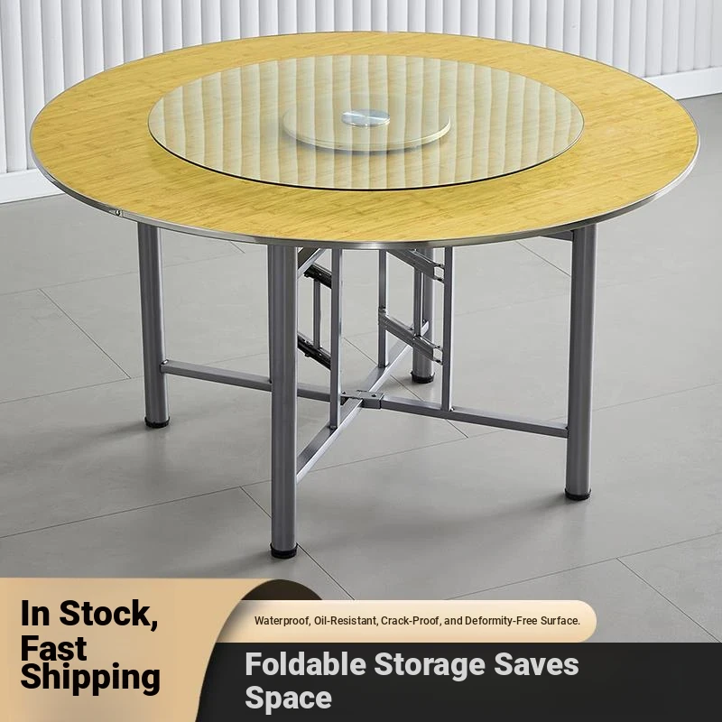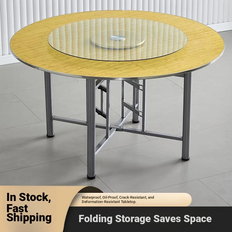 Foldable Large Round Dining Table for Home, Hotels, and Restaurants - Simple Design with Wooden Top and Rotating Tray, Perfect for Banquets and Gatherings