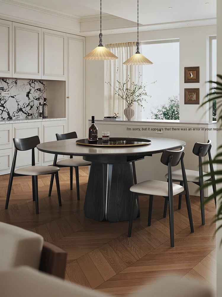 French Cream Vintage Solid Wood Dining Table Set with Black Elegant Round Walnut Table and Chairs - Perfect for Stylish Home Dining Experience