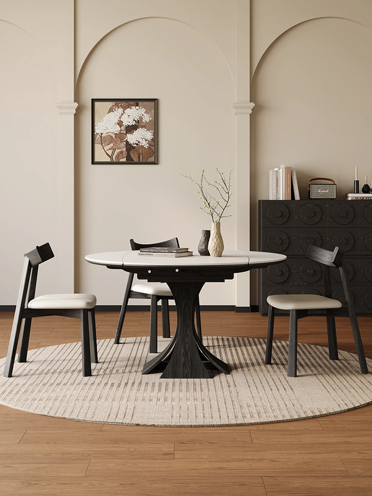 Expandable Round Folding Rock Plate Solid Wood Dining Table with Hidden Induction Stove - Versatile Design for Both Round and Square Use, Perfect for Modern Living Spaces!