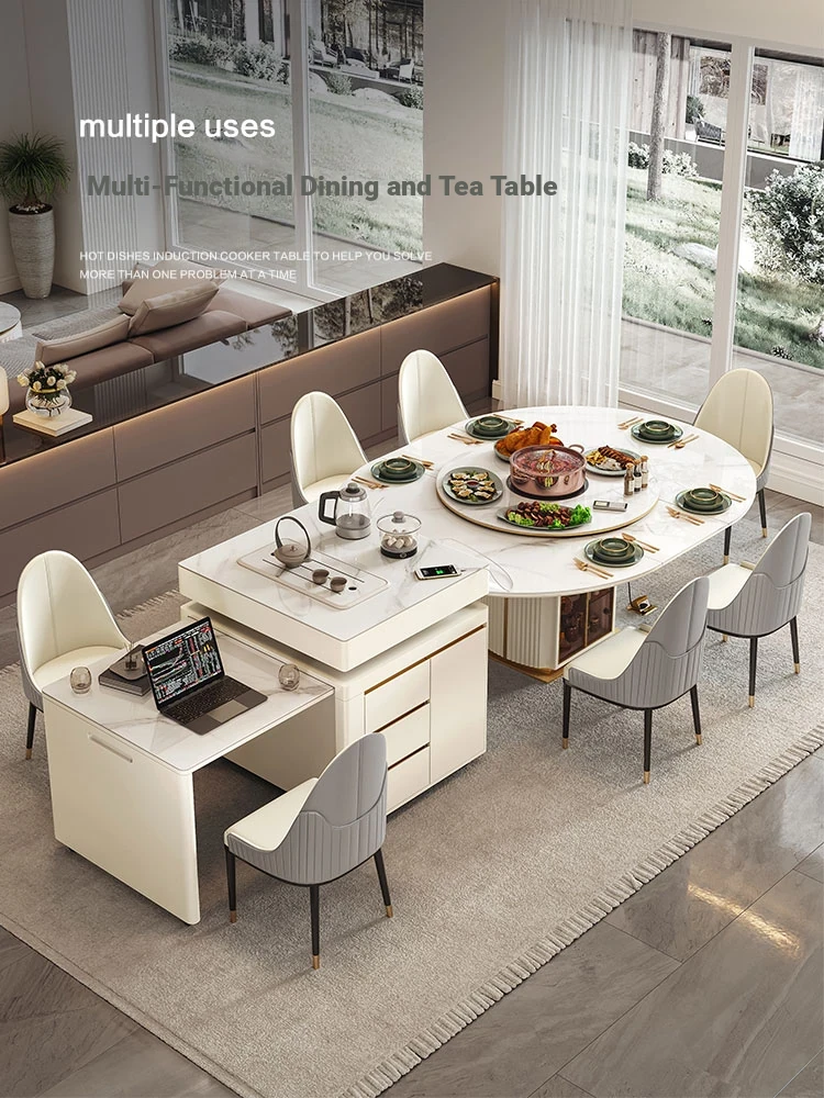 Transformable Round Dining Table with Hidden Induction Cooker – Modern Multi-Functional Design for Small Spaces, Perfect for Home Use in a Chic and Luxurious Style.