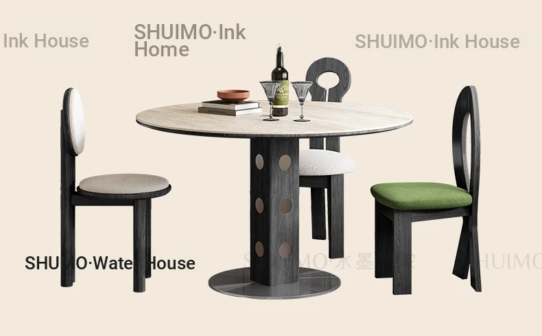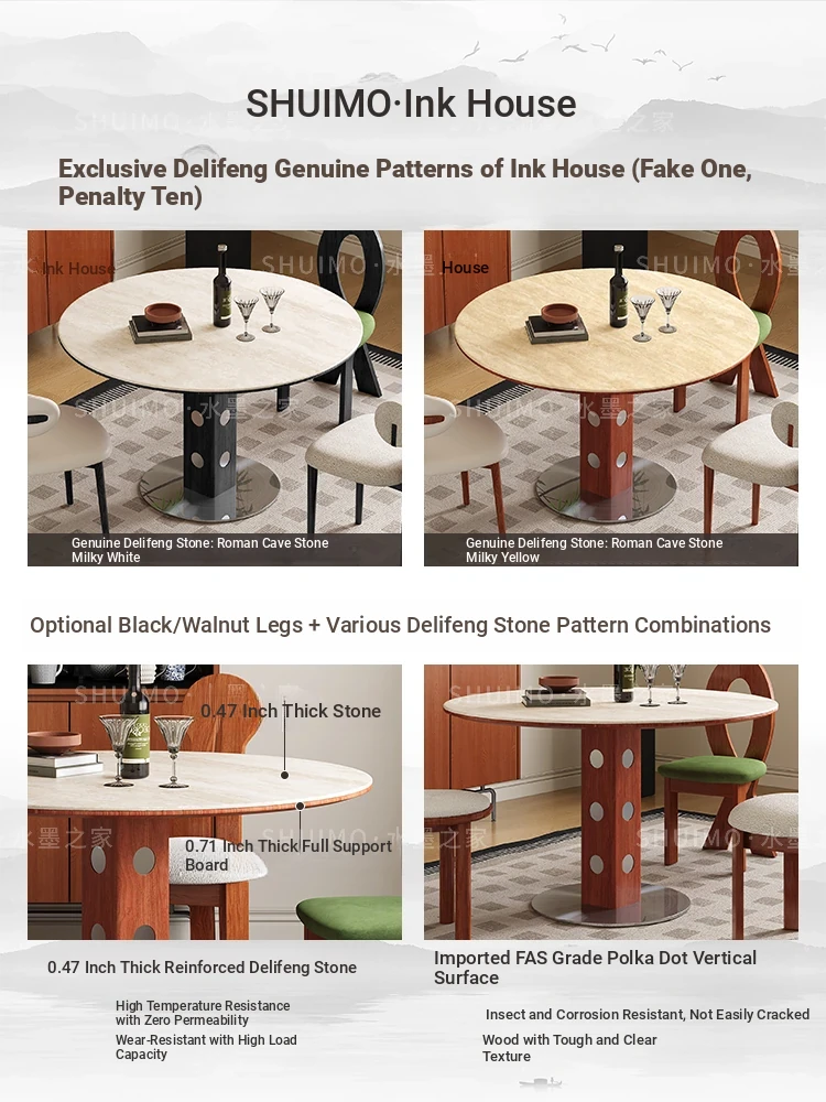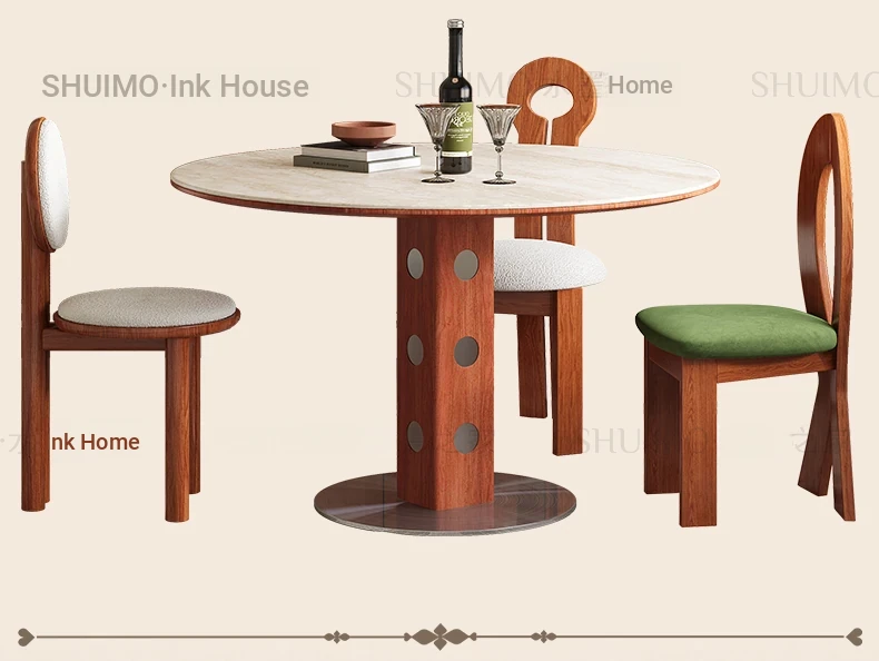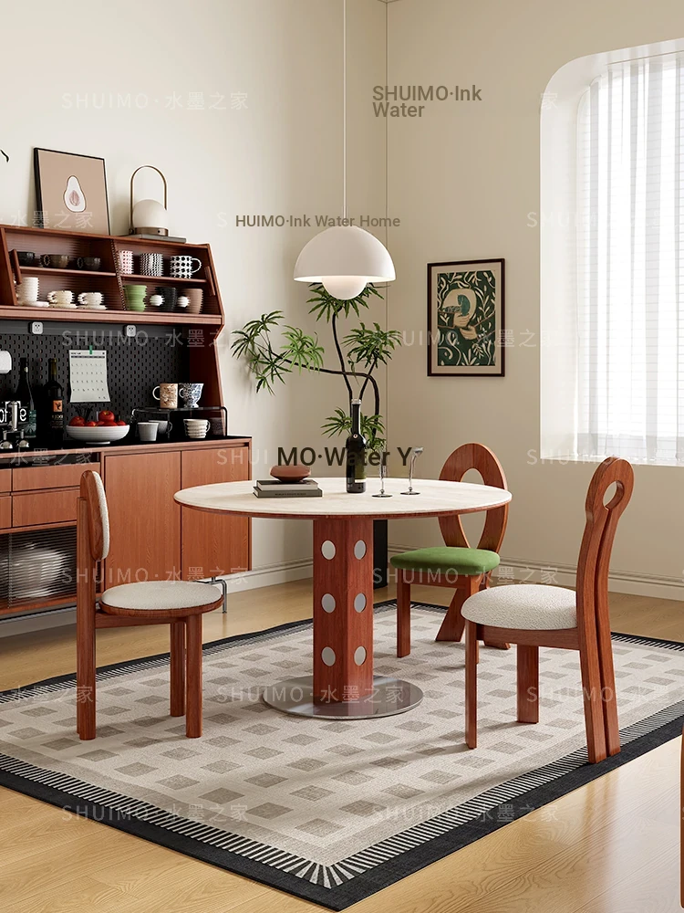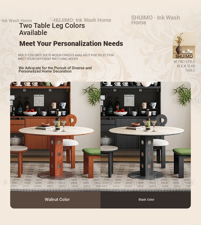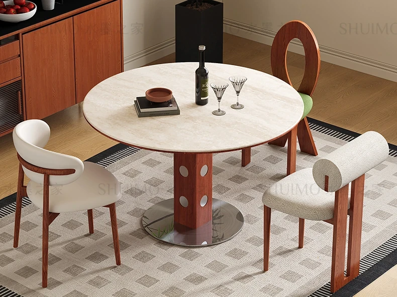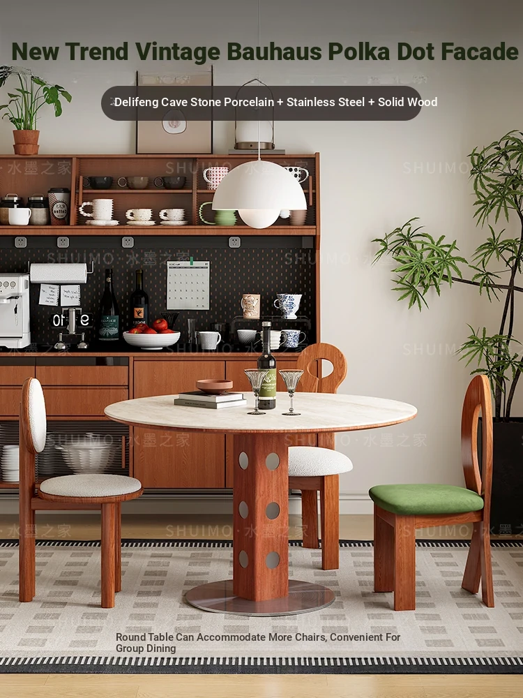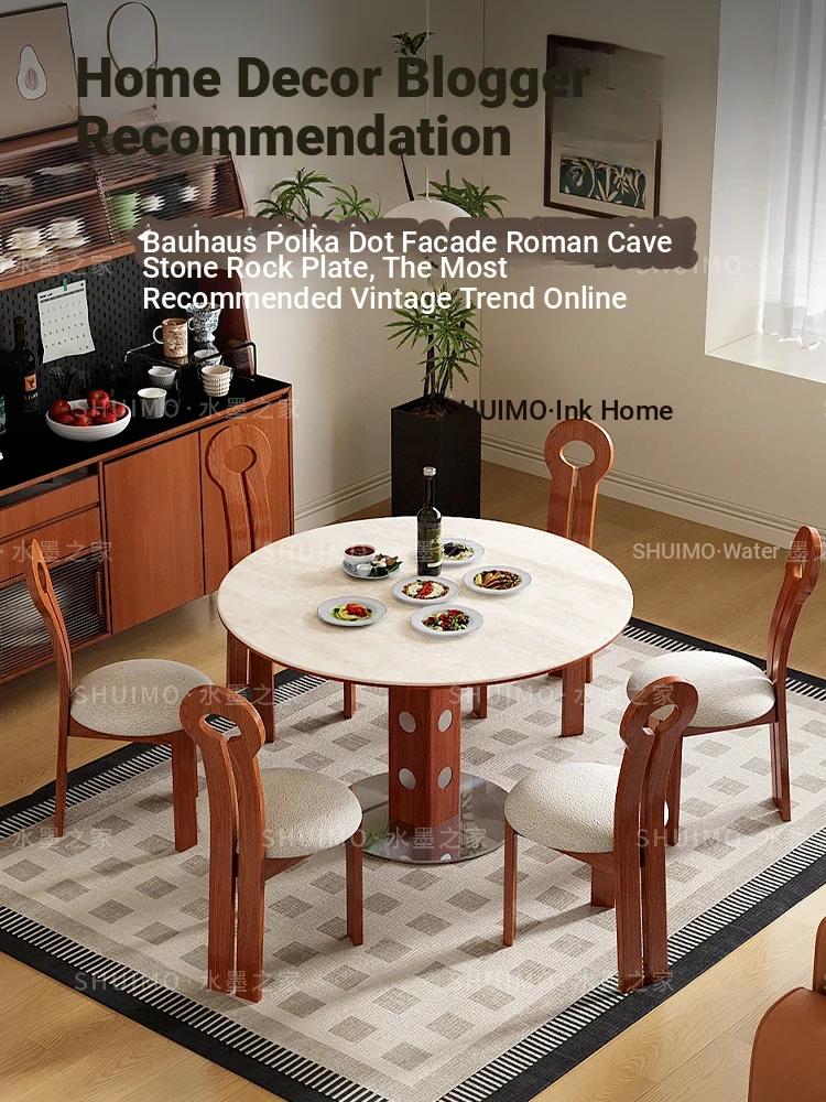 Delifeng Vintage Round Dining Table with Rock Slab Top and Metal Legs - French Bauhaus Style Solid Wood Table for a Chic Dining Experience