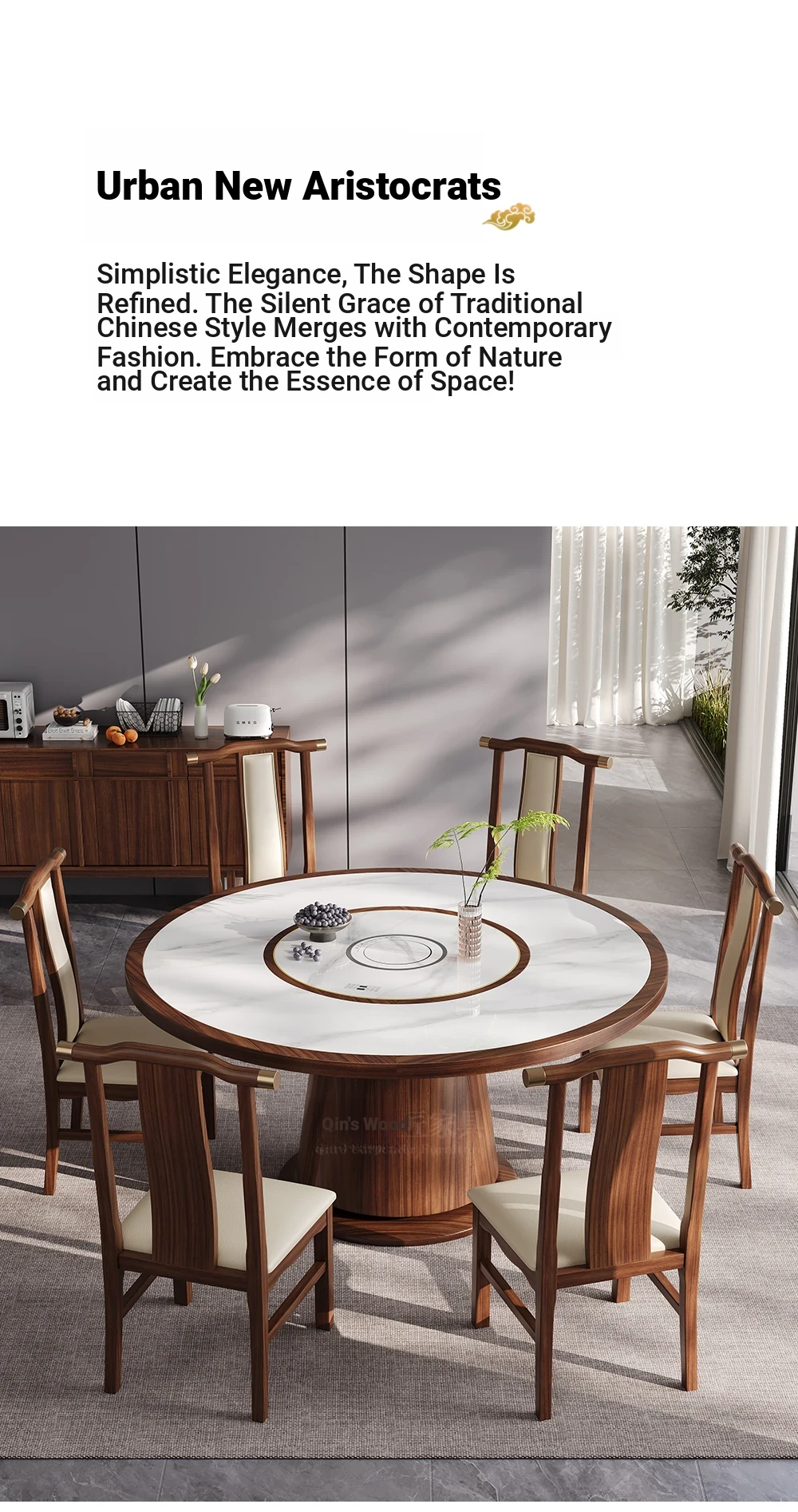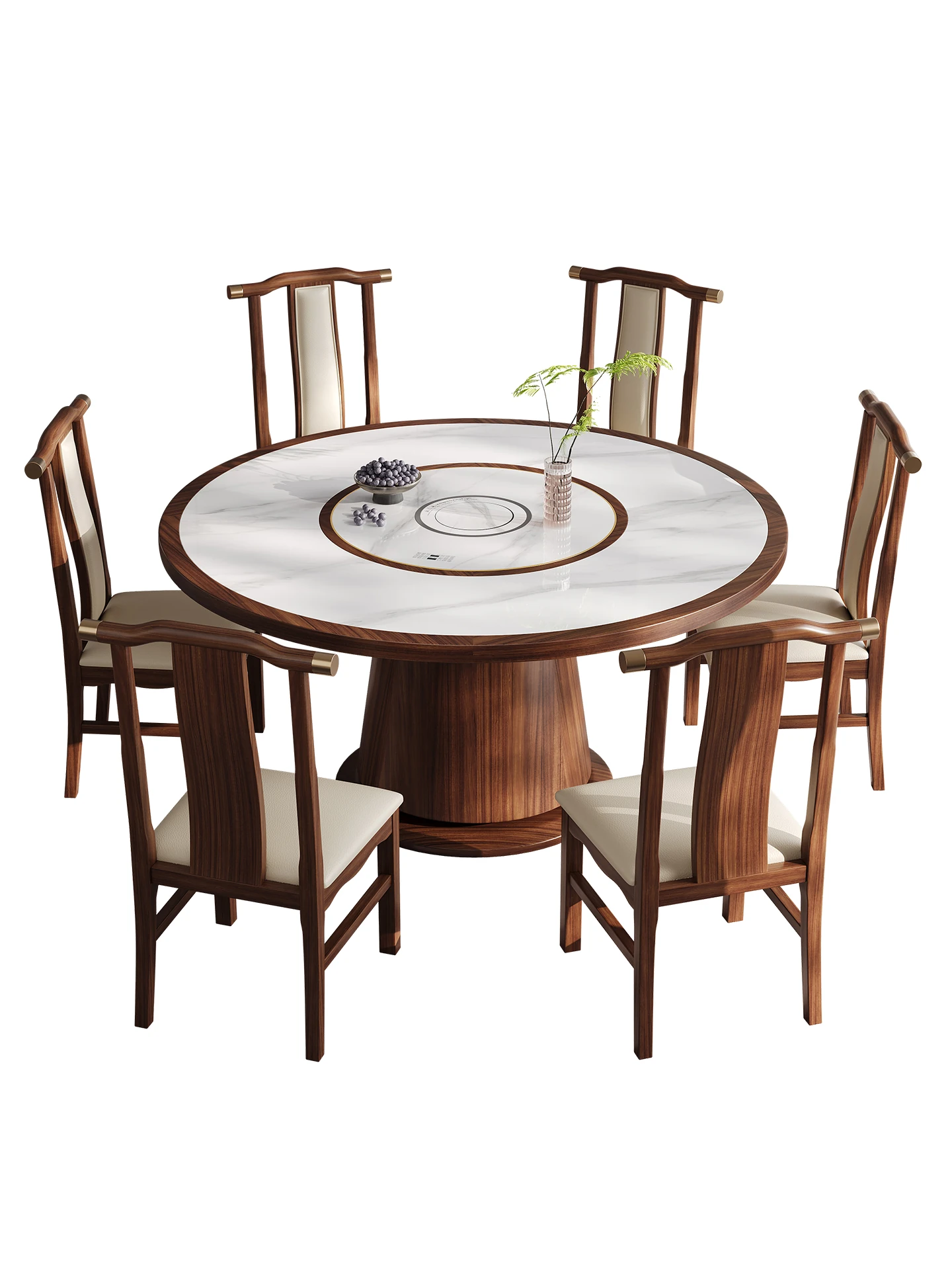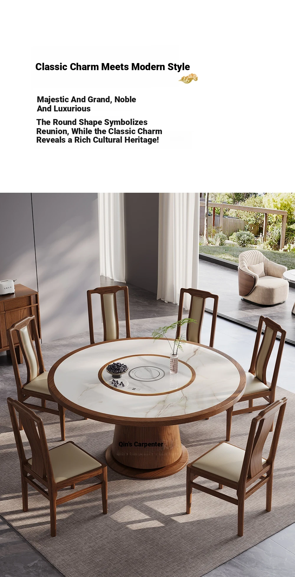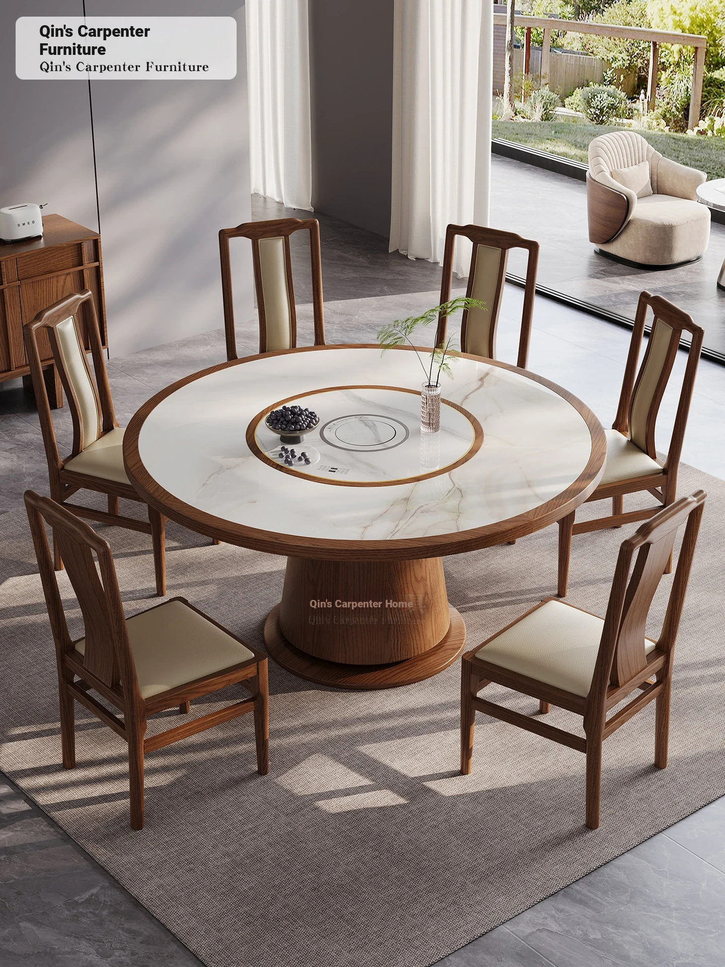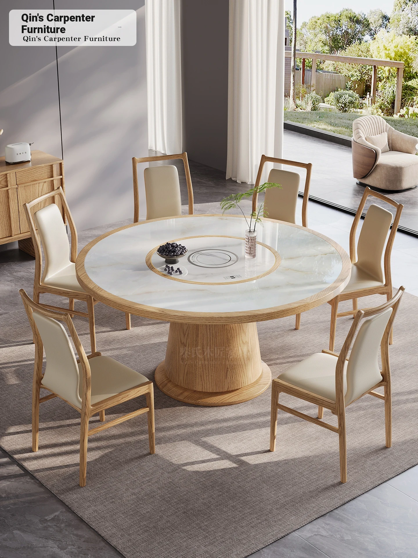 Elegant Solid Wood Multi-Functional Dining Table Set with Induction Cooker and Electric Warming Plate - Modern Chinese Style Round Table for Home Use