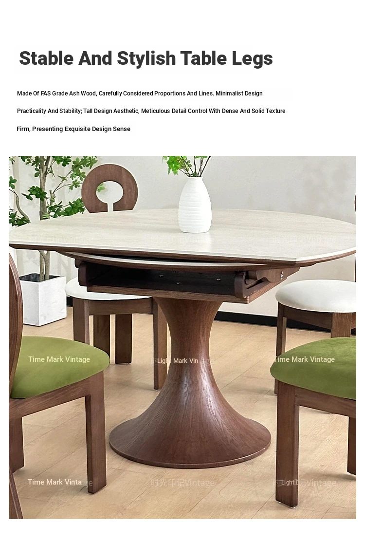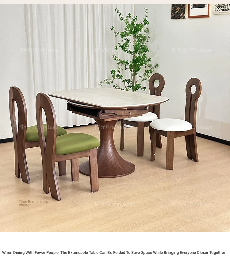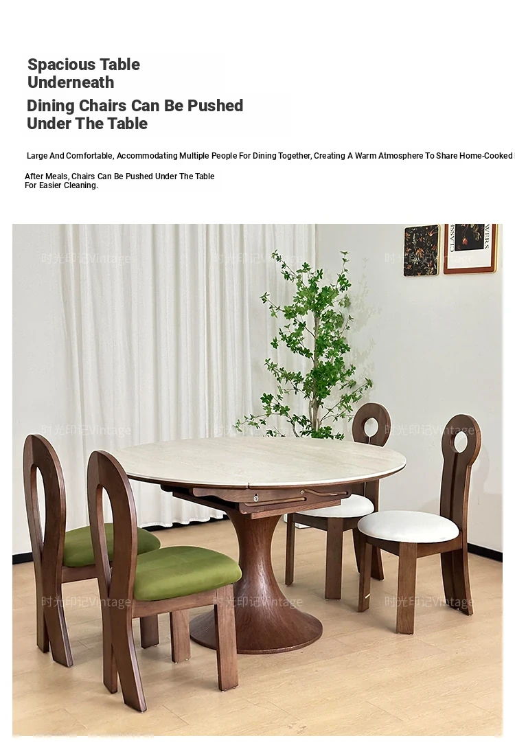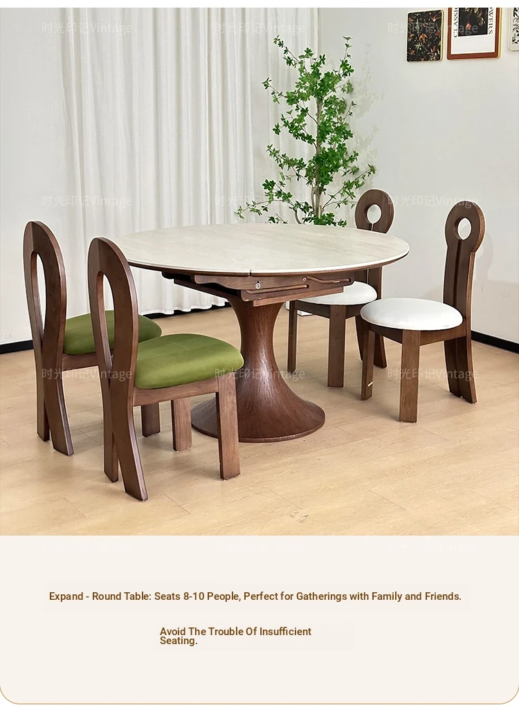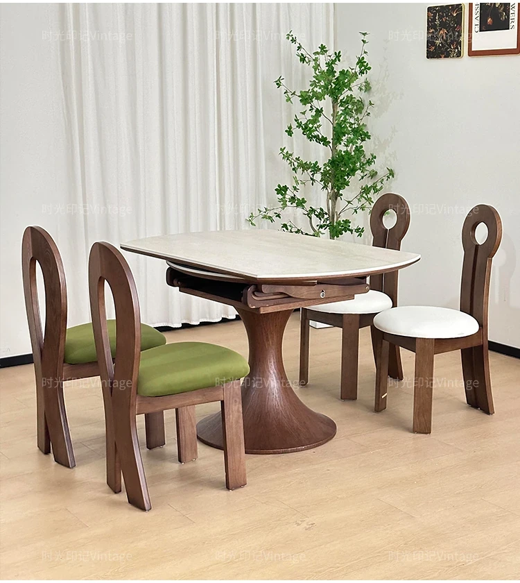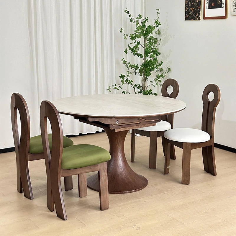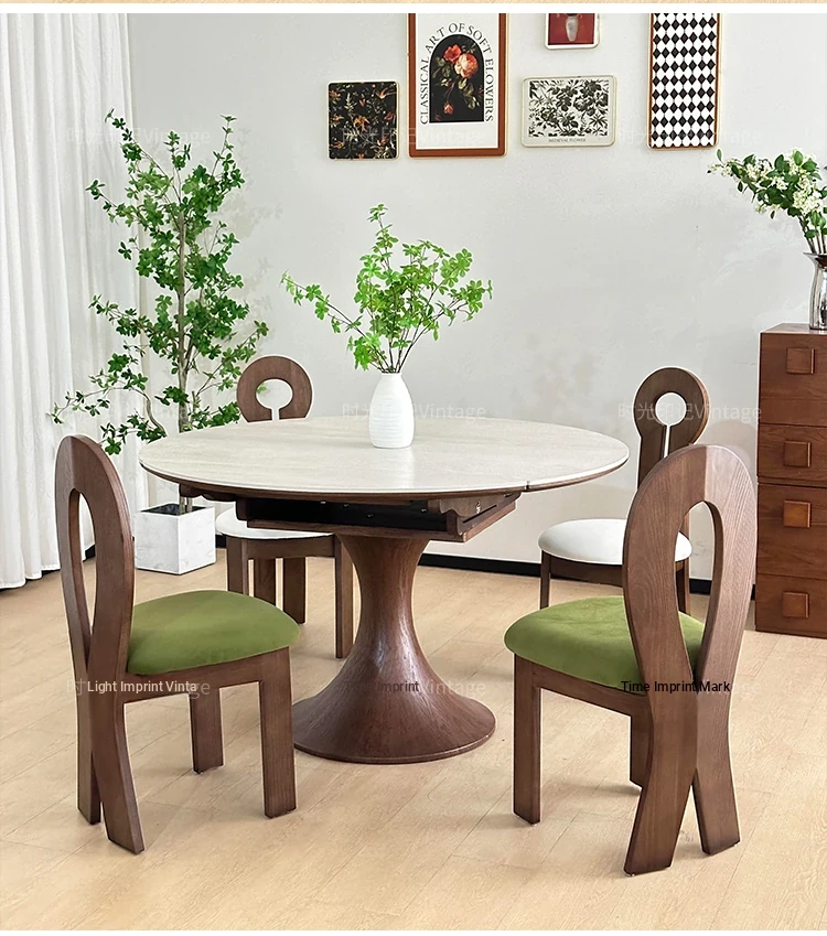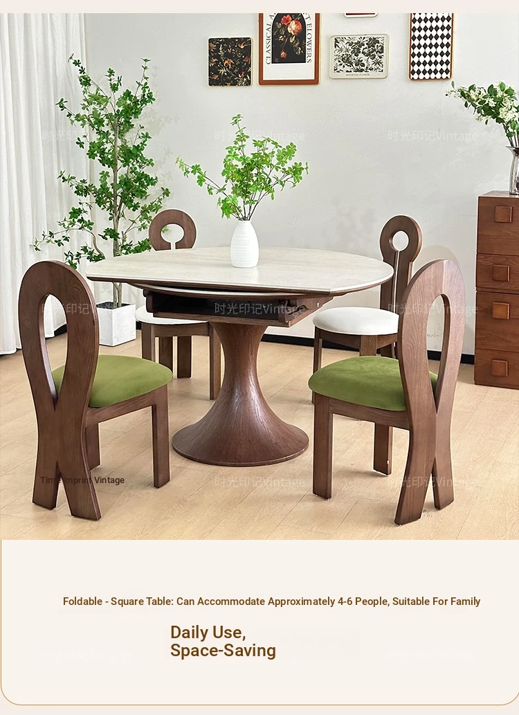 French Vintage Style Retractable Round Dining Table and Chair Set - Foldable Ash Wood Home Use with Unique Stone Design for Elegant Dining Experience