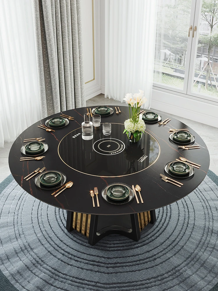 Modern Luxury Solid Wood Rock Plate Dining Table with Electric Induction Cooker Turntable - 1.5m Round Black Table for 6 People, Minimalist Design