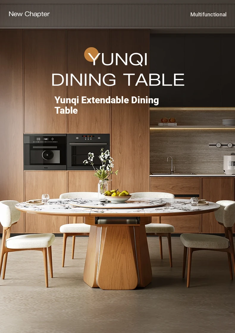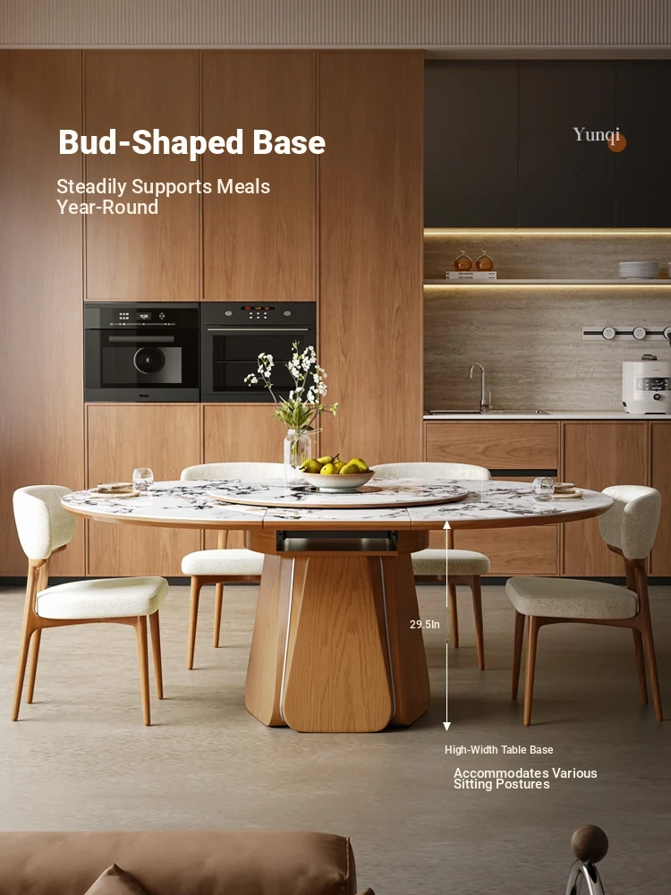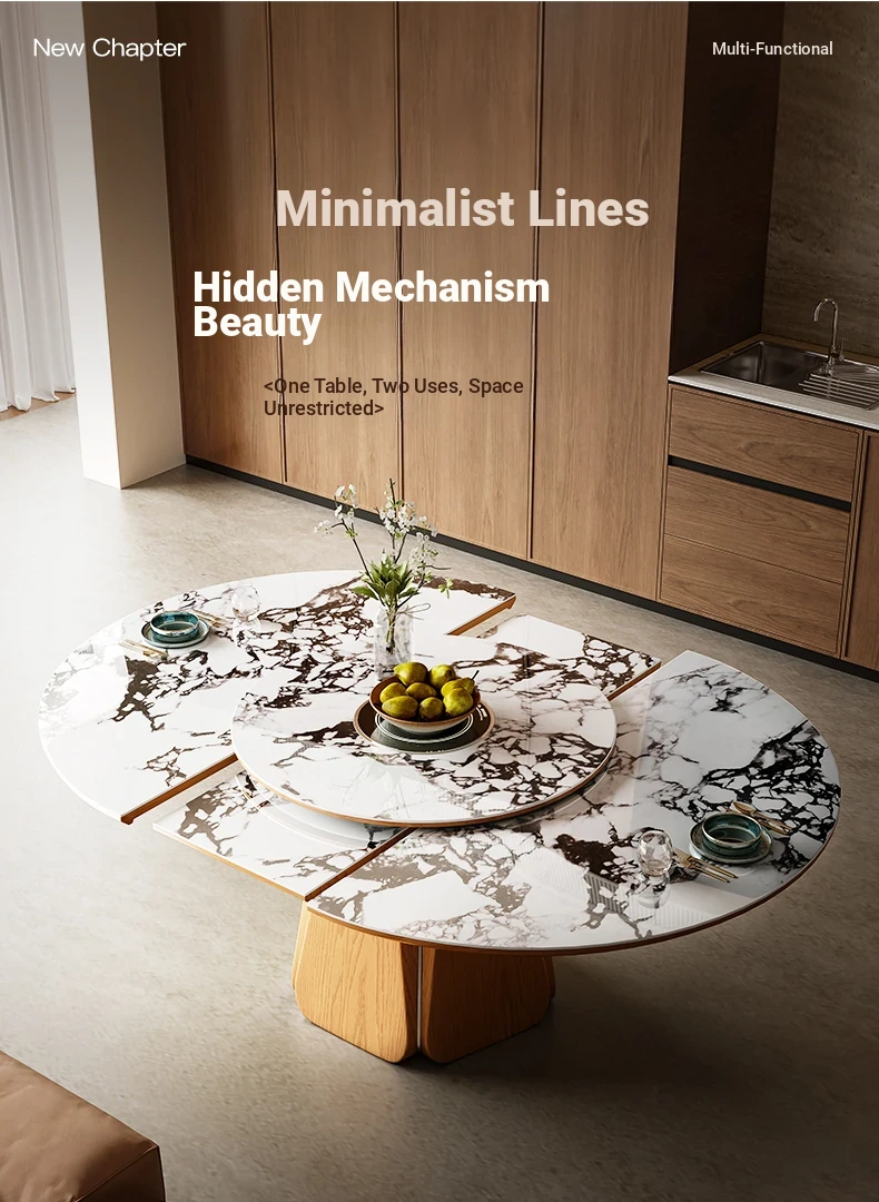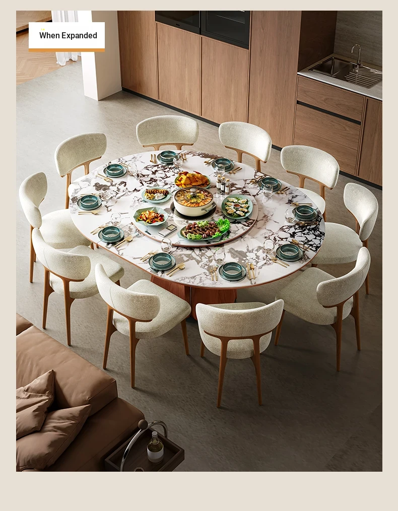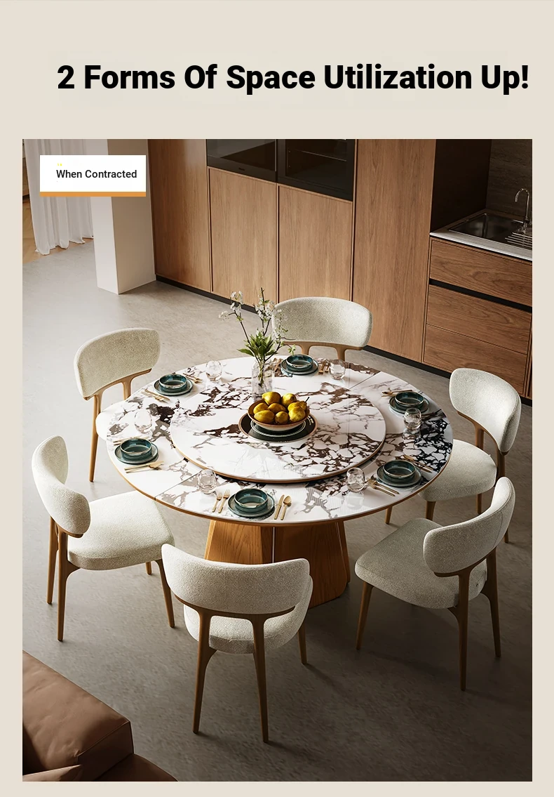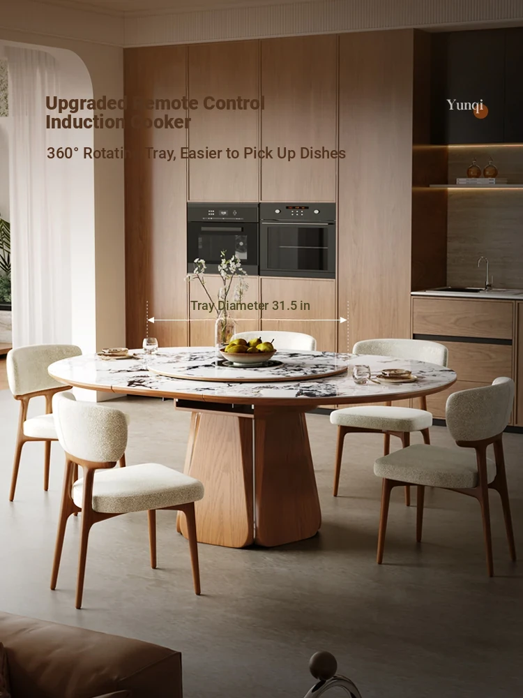 Modern Vintage Extendable Round Dining Table with Rotating Tray - High-End Integrated Induction Cooktop and Solid Wood Dining Chair Set for Home Use