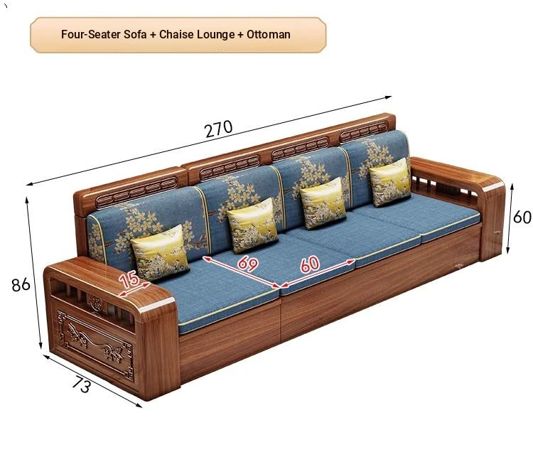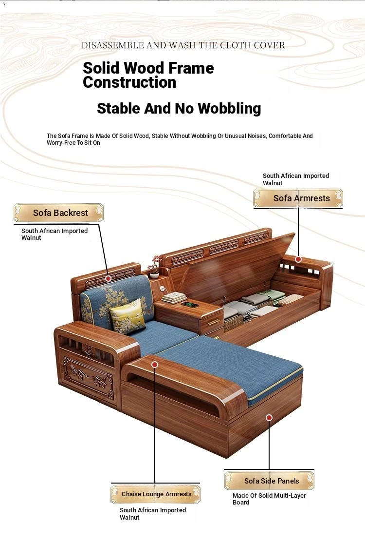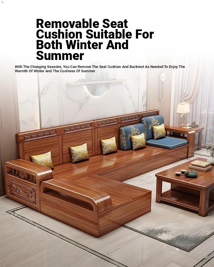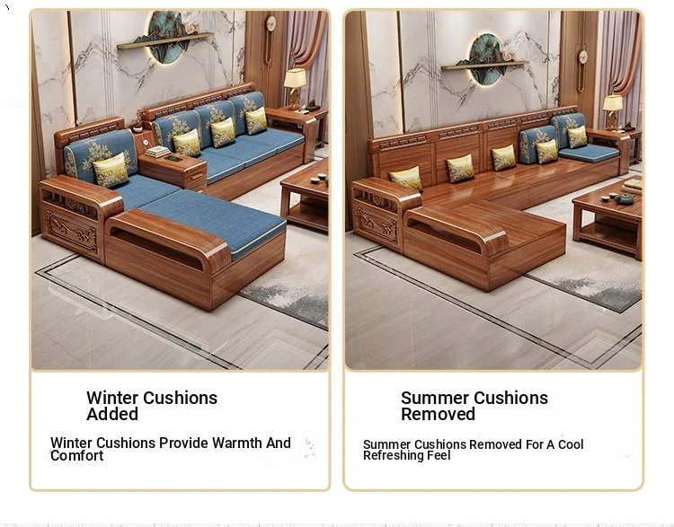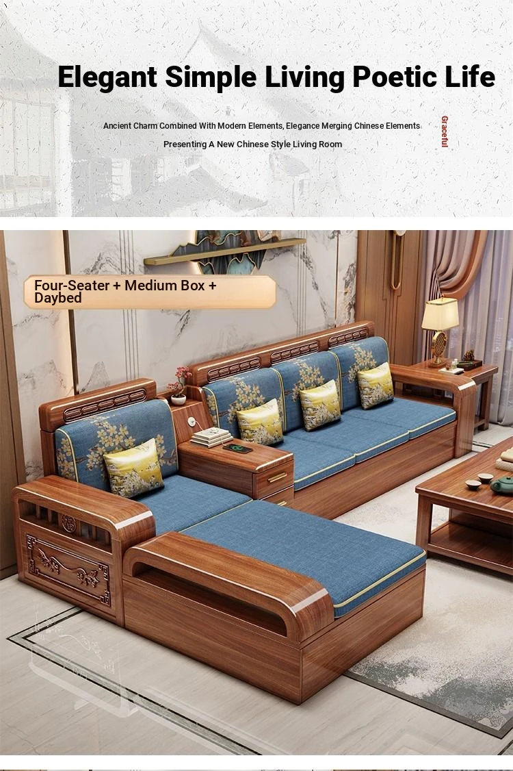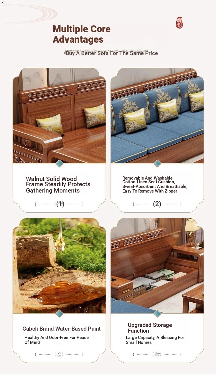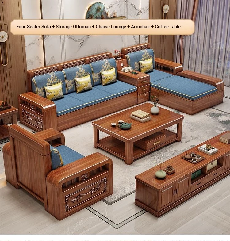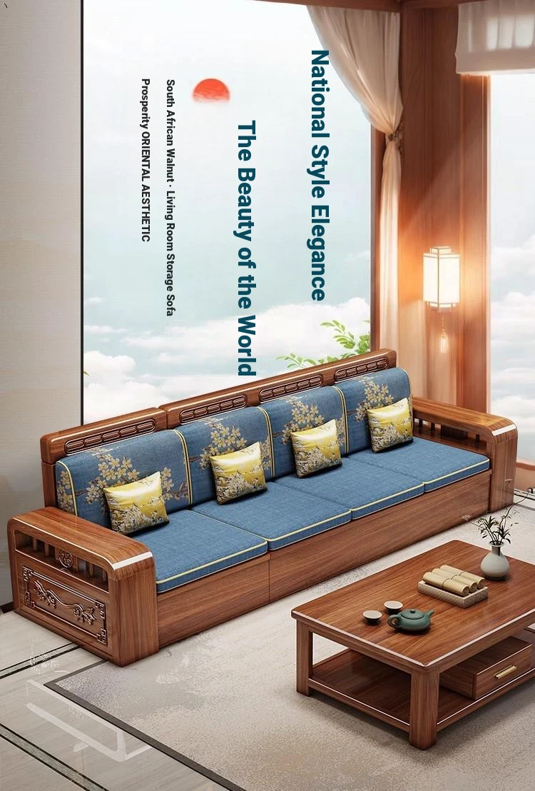 Walnut Wood New Chinese Style Solid Wood Sofa - 3-Seater Space-Saving Storage Sofa for Small Living Rooms, Perfect for Year-Round Comfort and Versatile Use