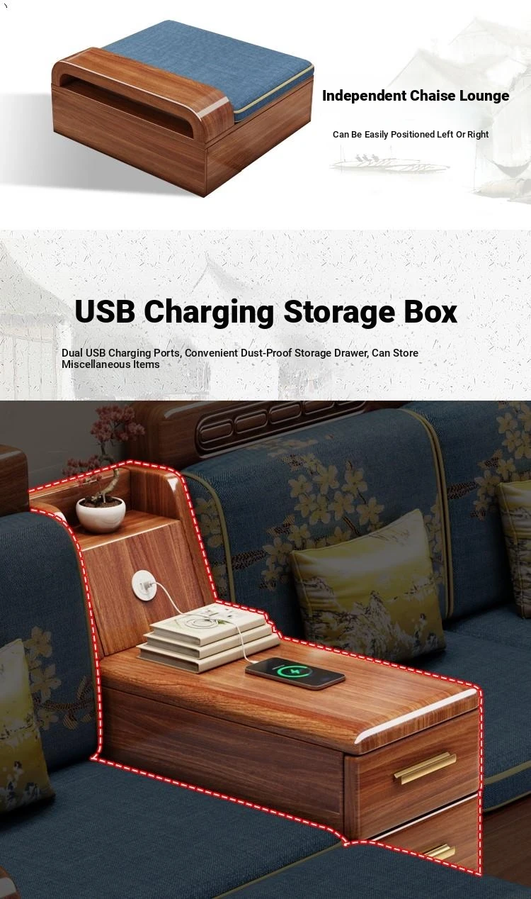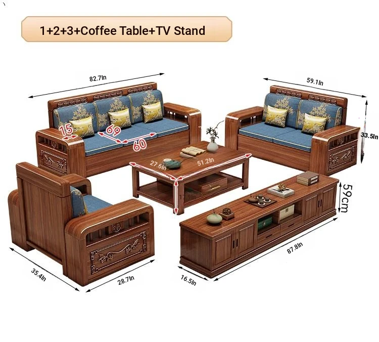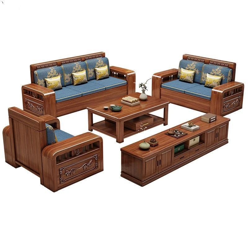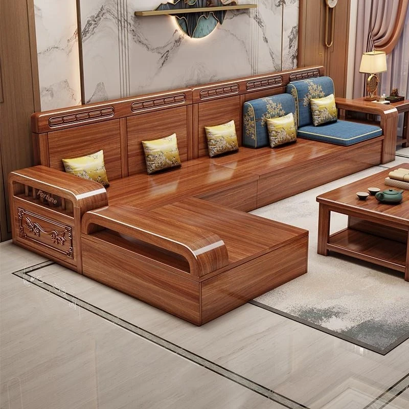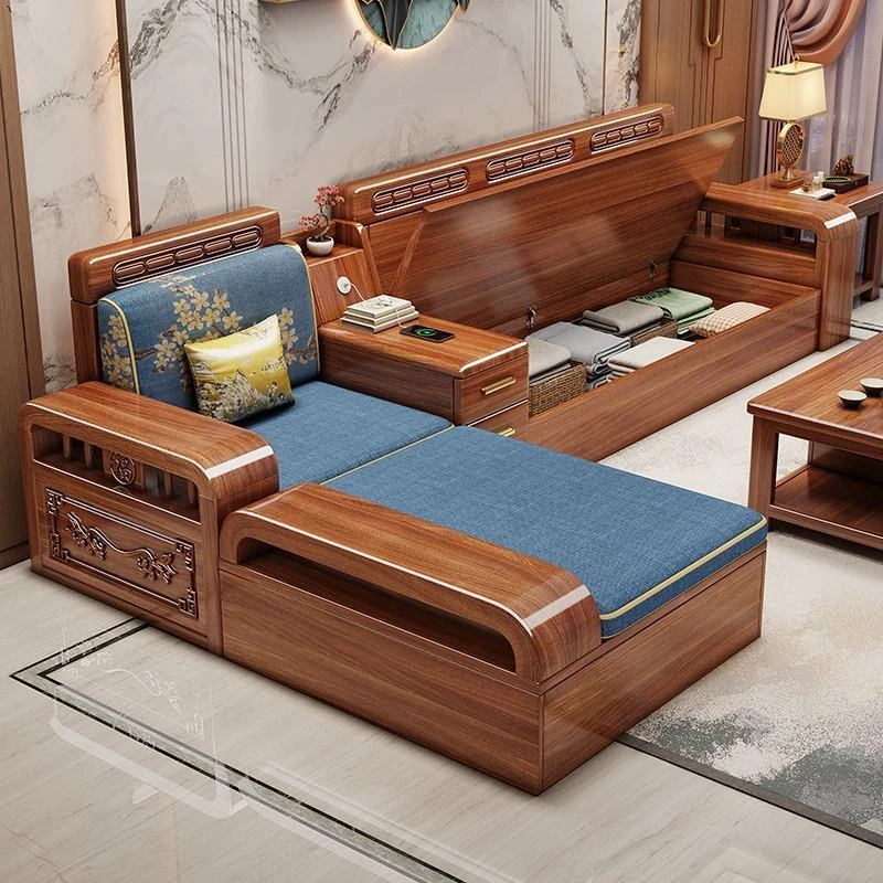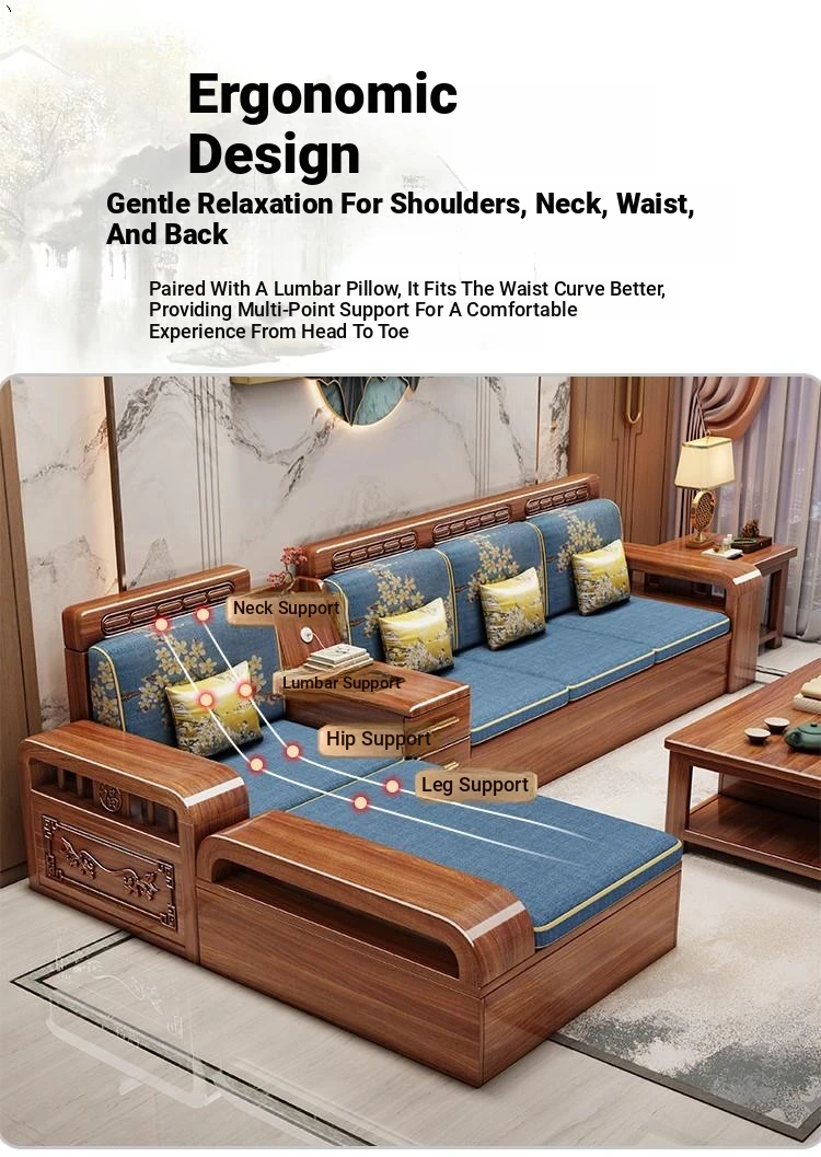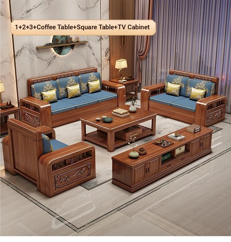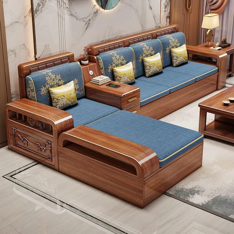 Walnut Wood New Chinese Style Solid Wood Sofa - 3-Seater Space-Saving Storage Sofa for Small Living Rooms, Perfect for Year-Round Comfort and Versatile Use
