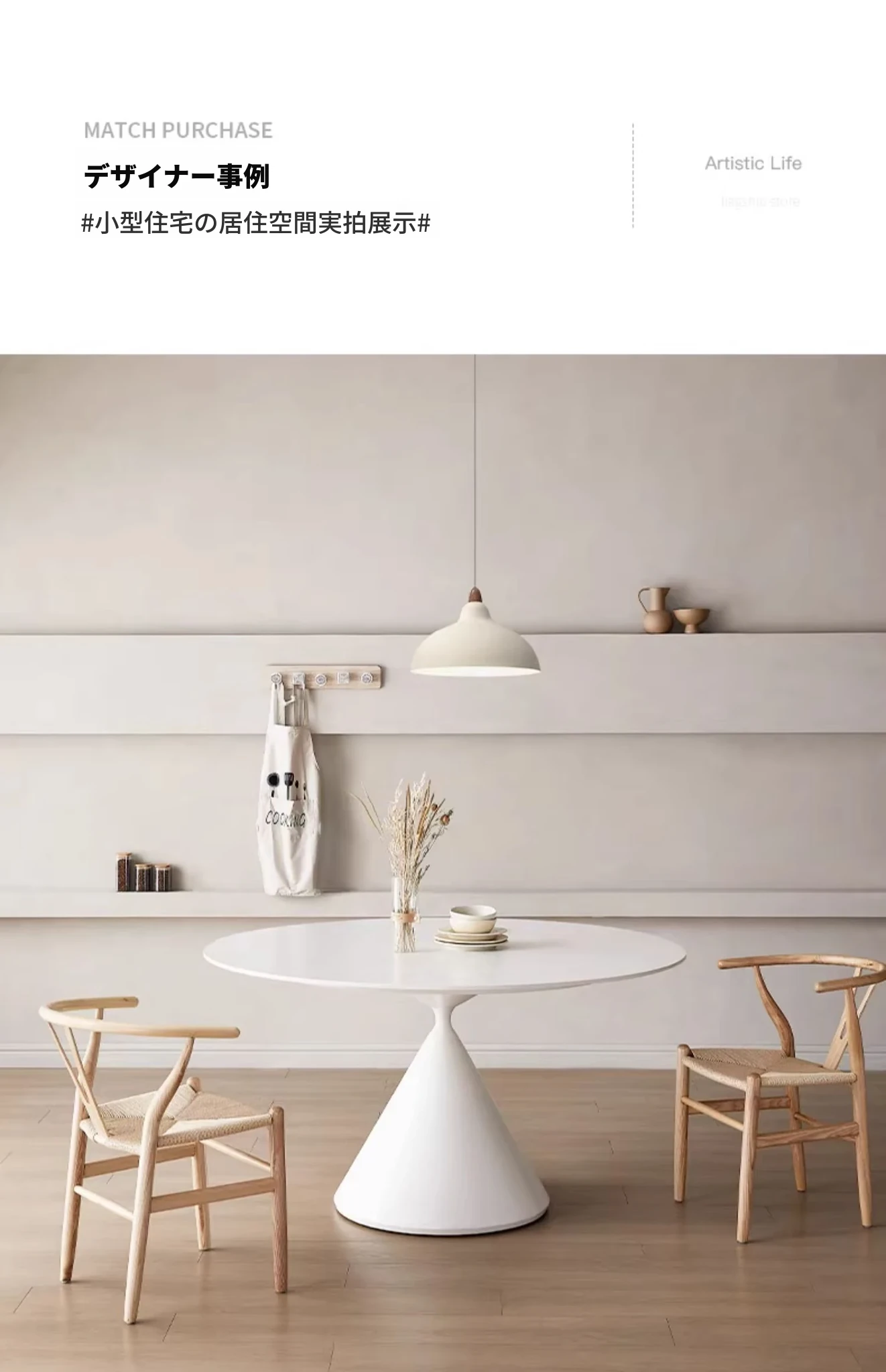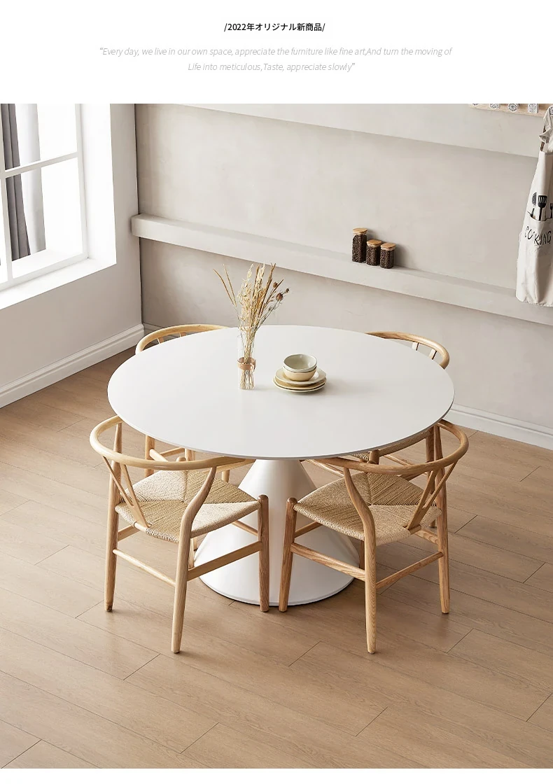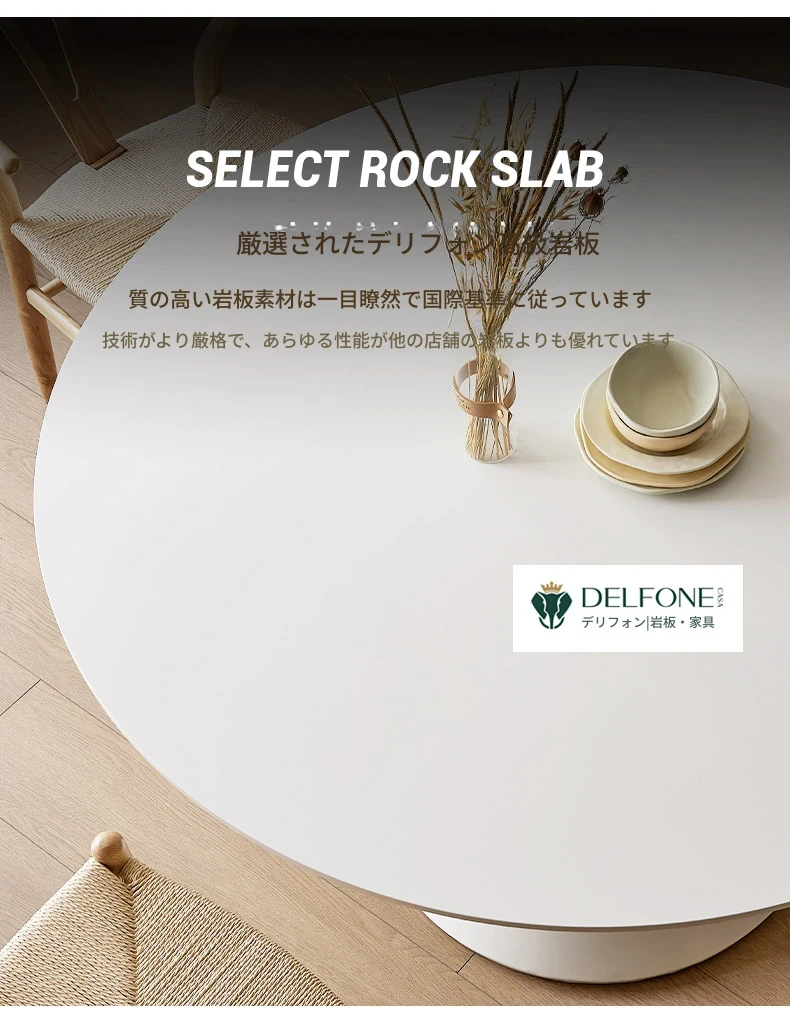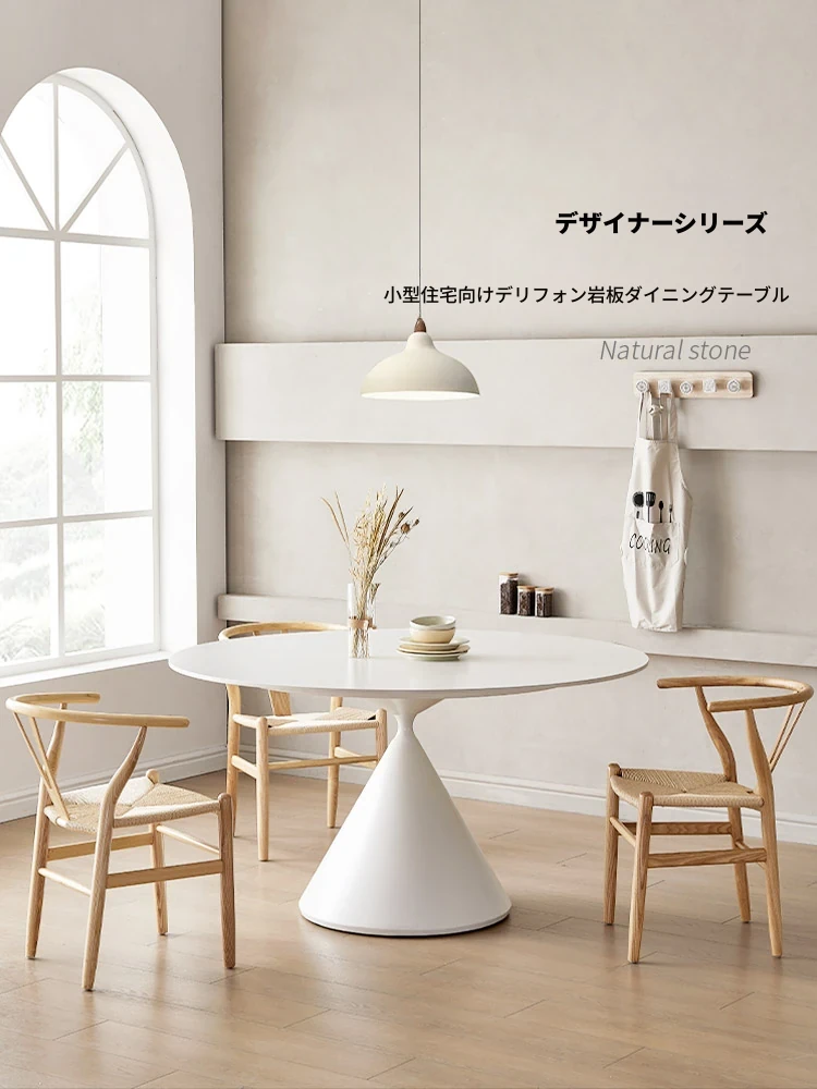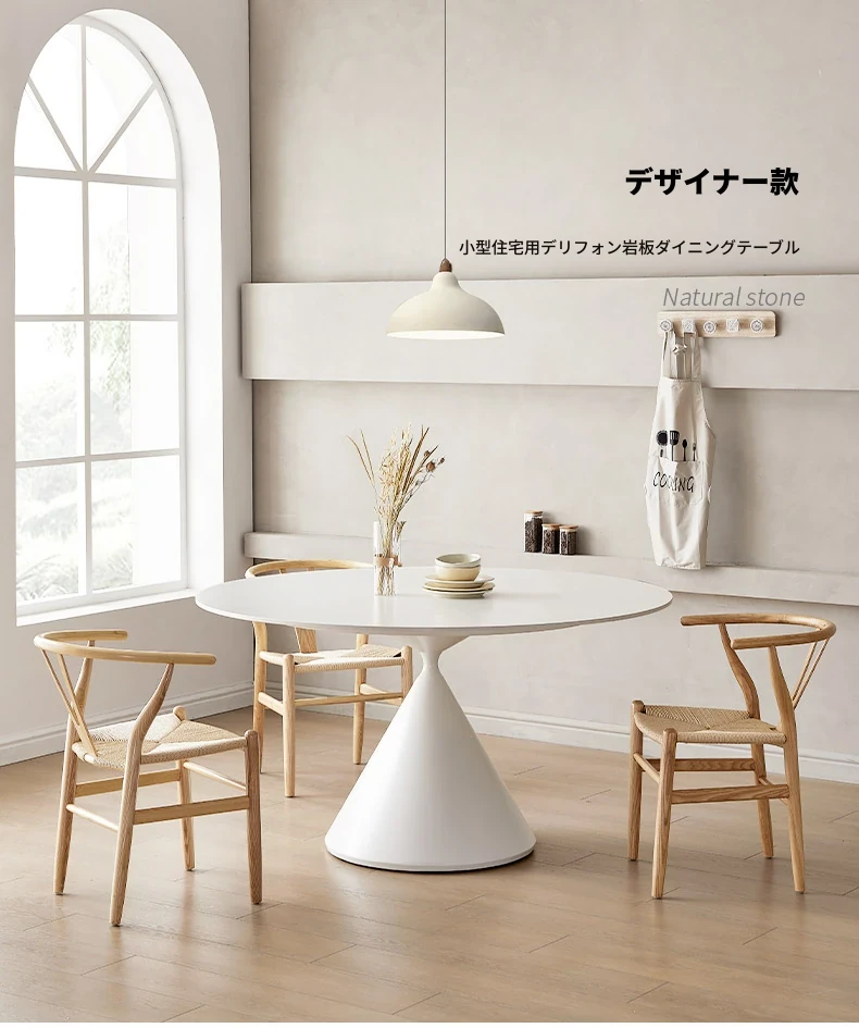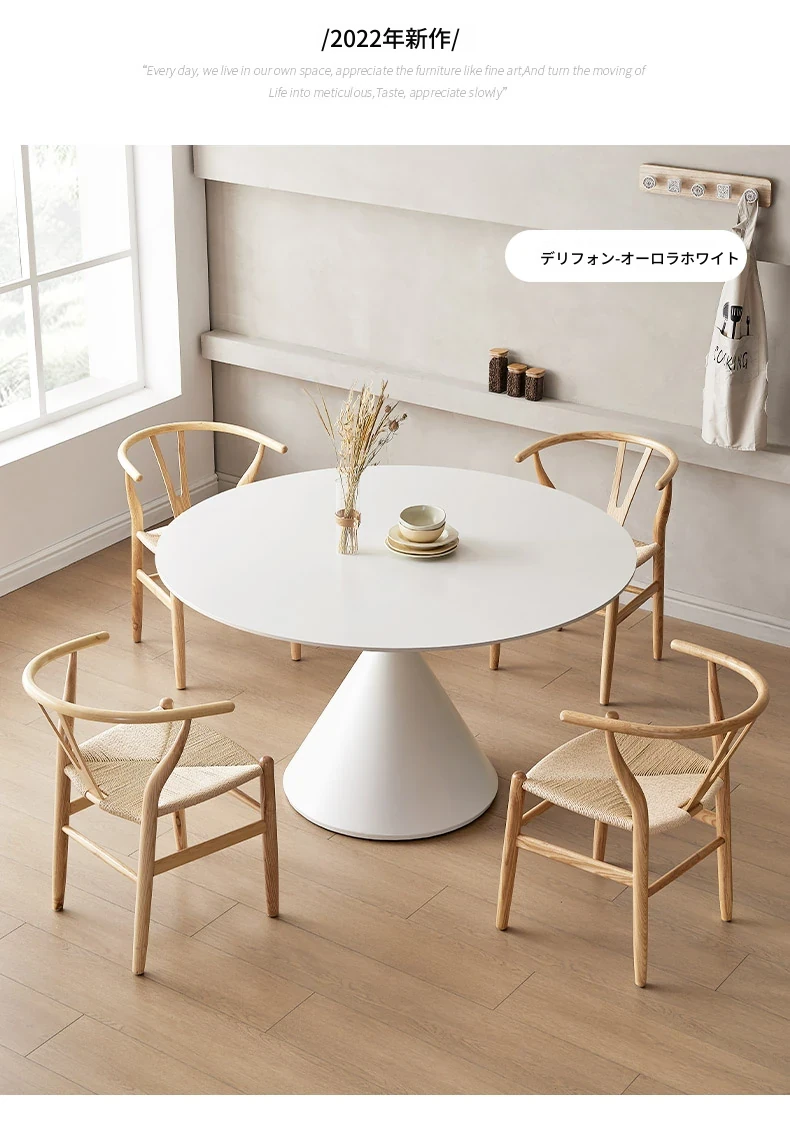 デリフォンのラウンドテーブル - 小型アパートにぴったりな純白色の侘び寂びデザイン。1.1メートルの円形岩板ダイニングテーブルで、スタイリッシュな食事空間を演出!