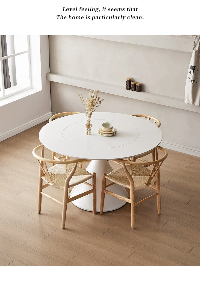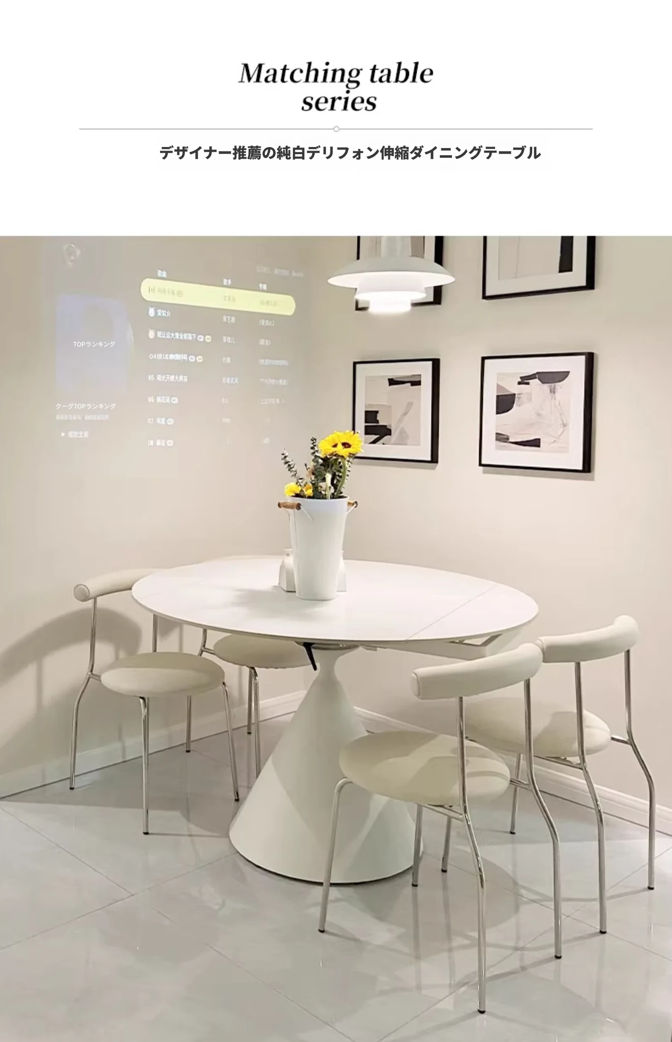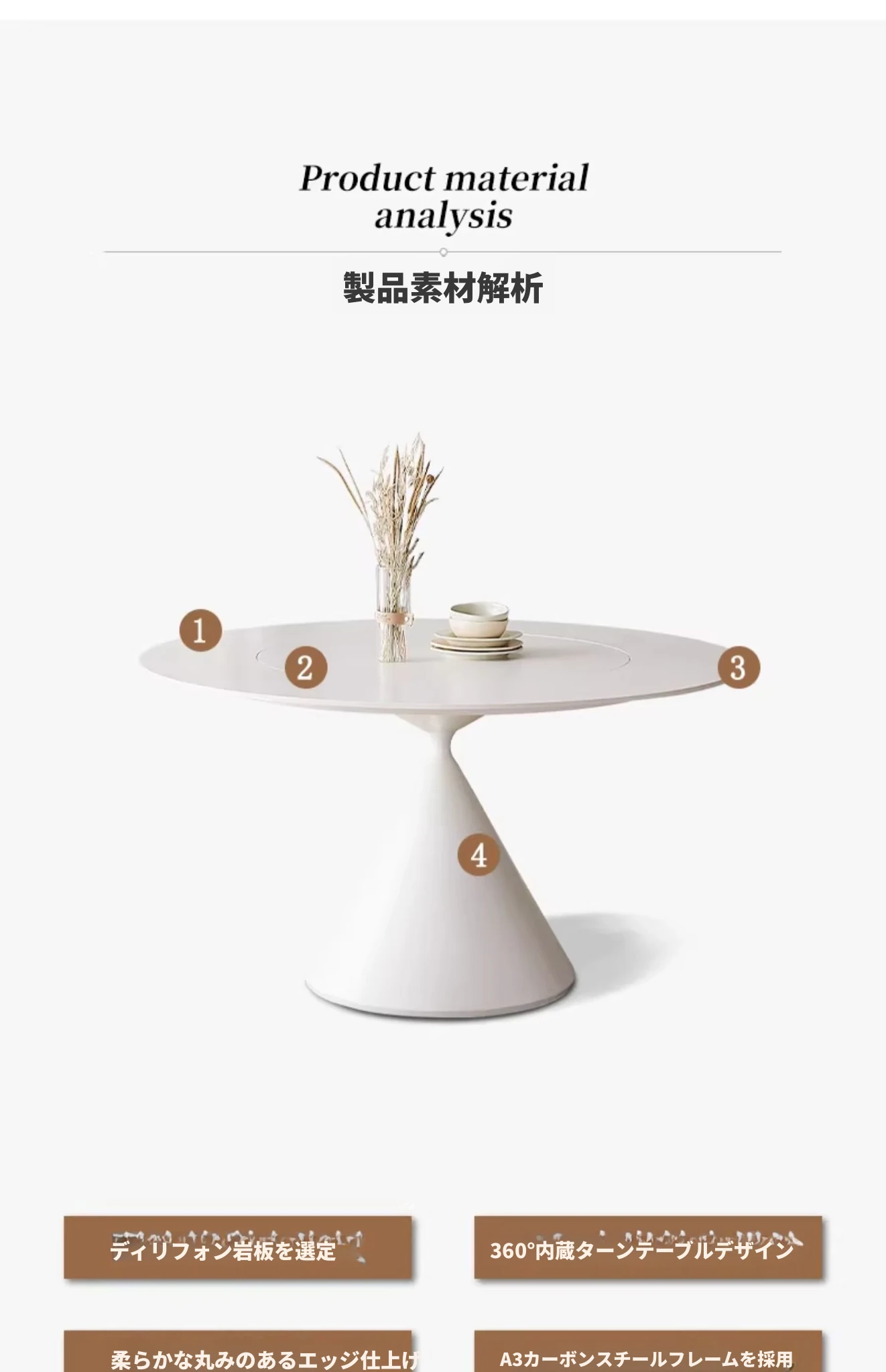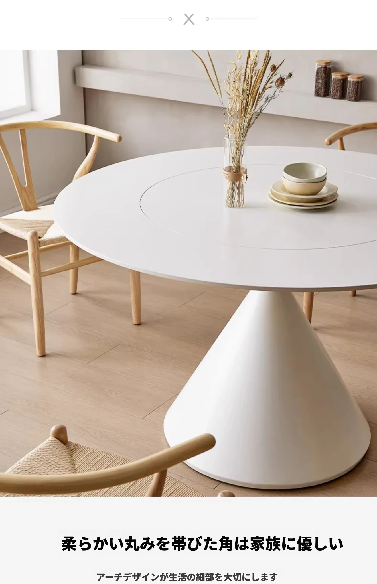 デリフォンのラウンドテーブル - フレンチクリーム仕上げの純白色、人気の小型家用デザイン。おしゃれな岩板使用で、どんなインテリアにもマッチ!お洒落な食卓を演出する、理想的な一品です。