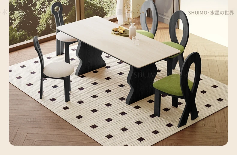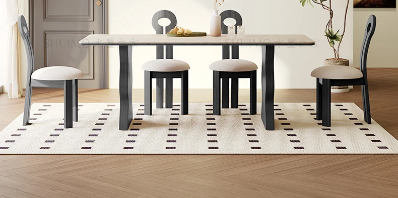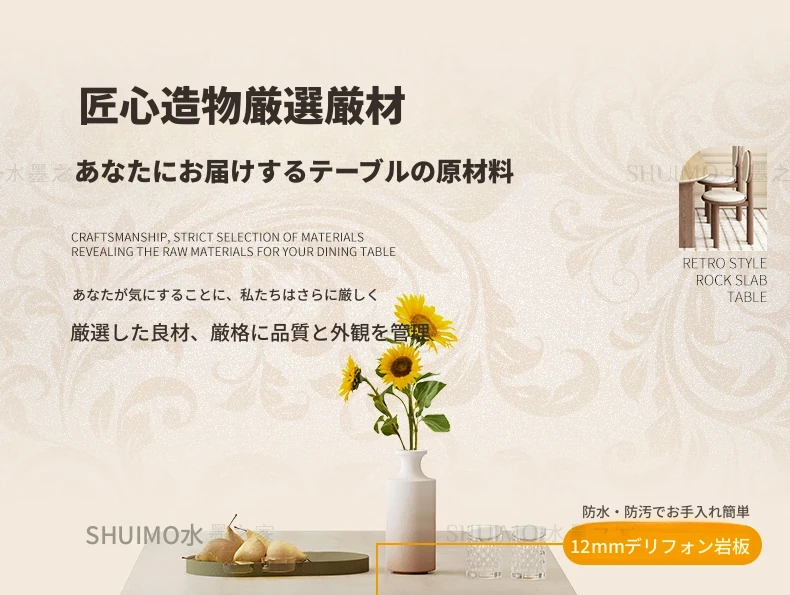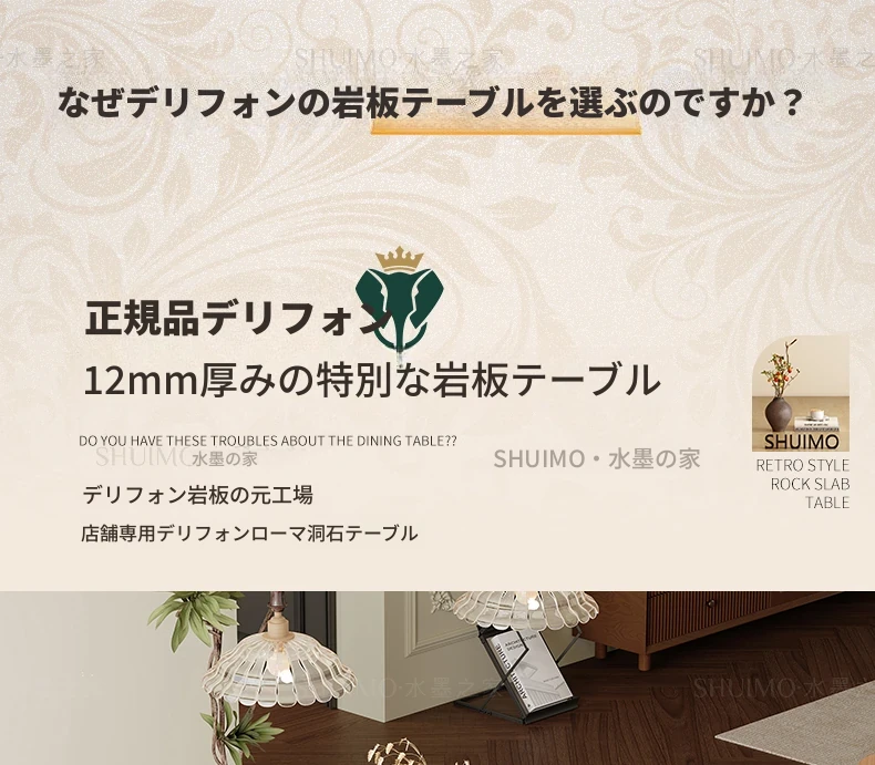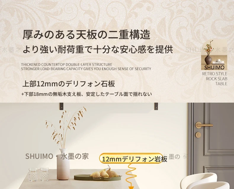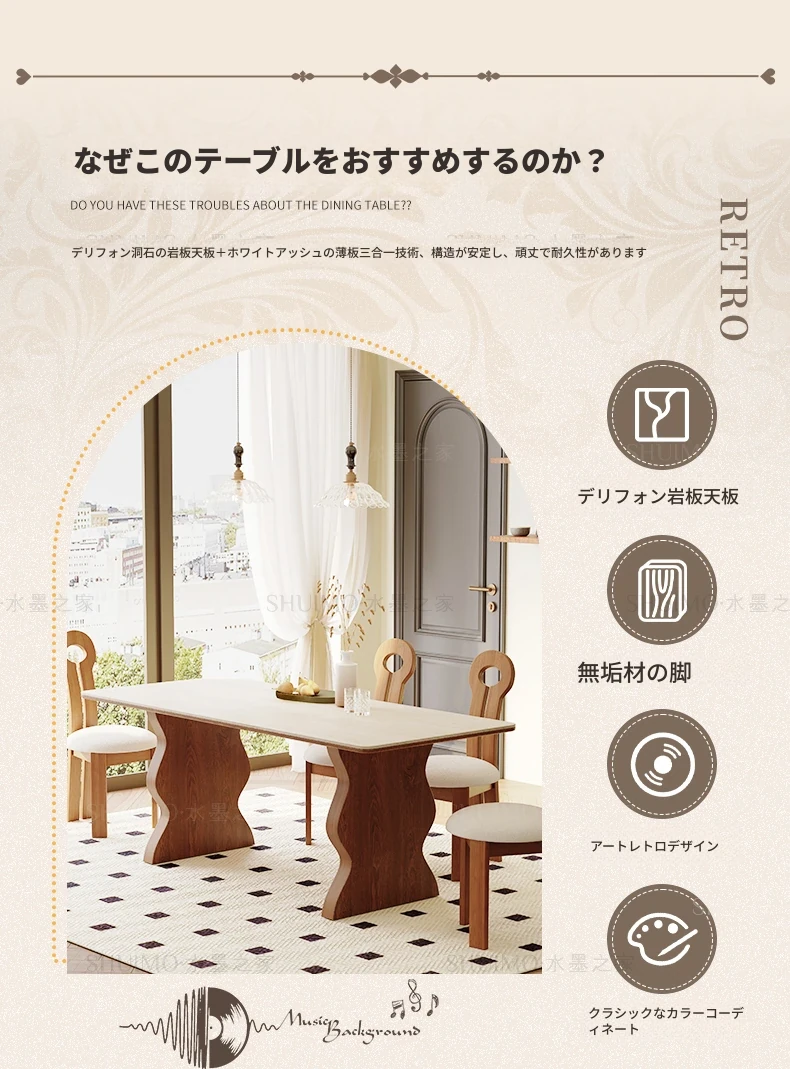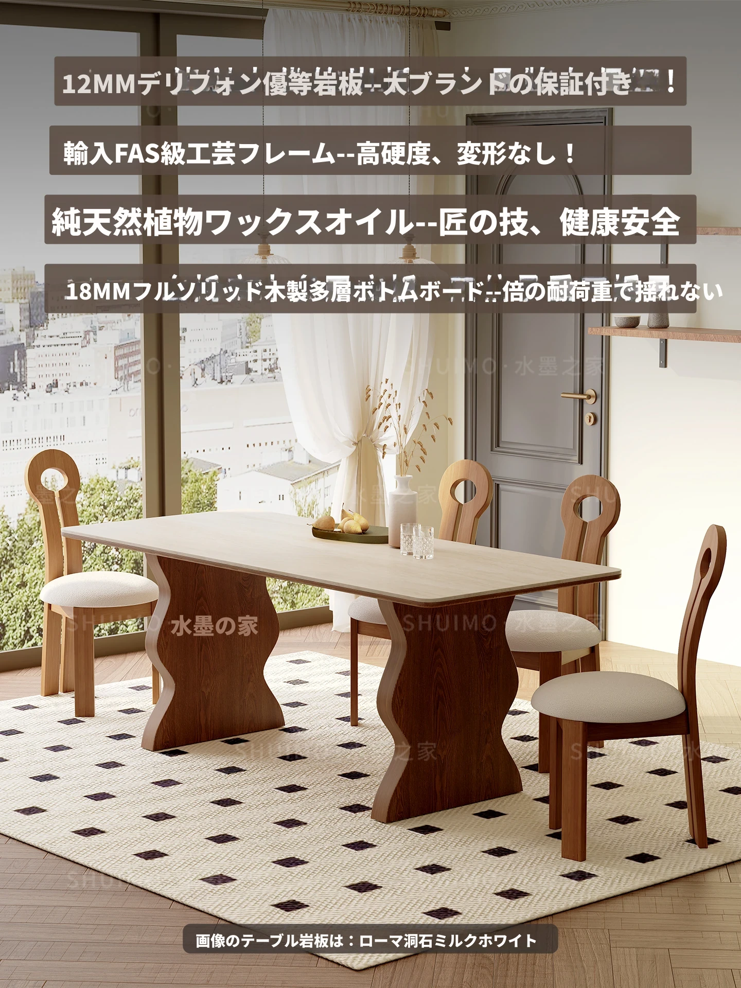 デリフォンの岩板ダイニングテーブル - フレンチスタイルのクリーミーな半円形ロングテーブル。小さな家でも贅沢感を楽しめる、洗練されたデザインが魅力のリビング用食卓です。