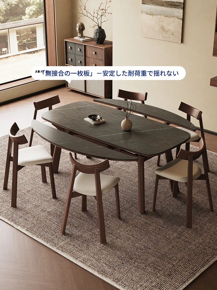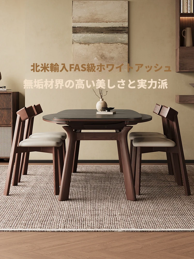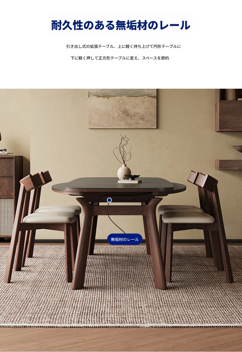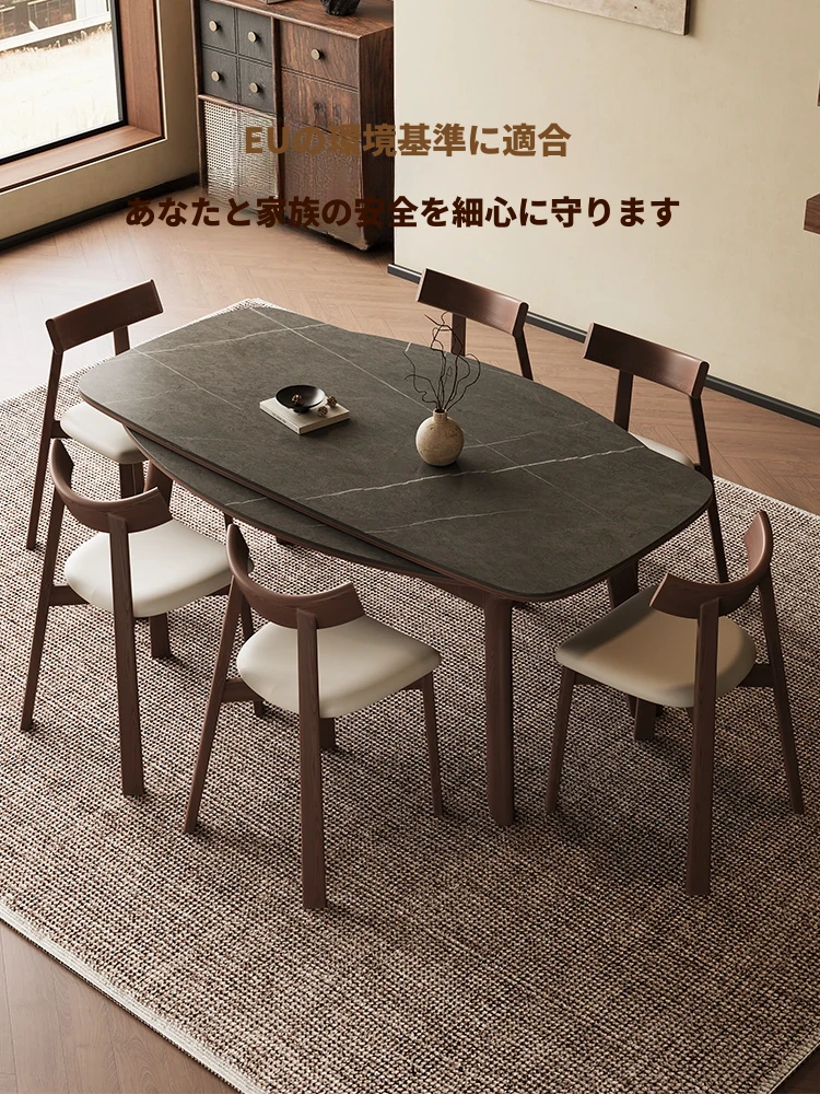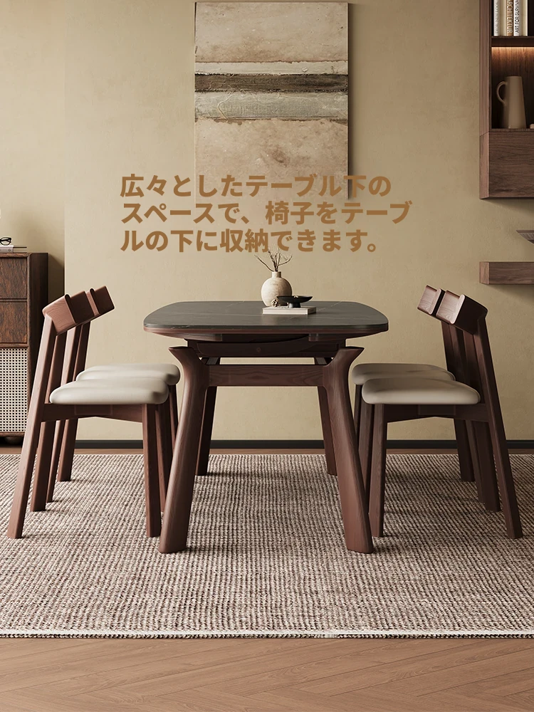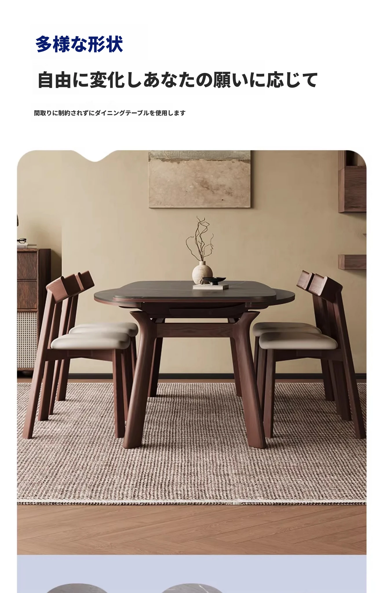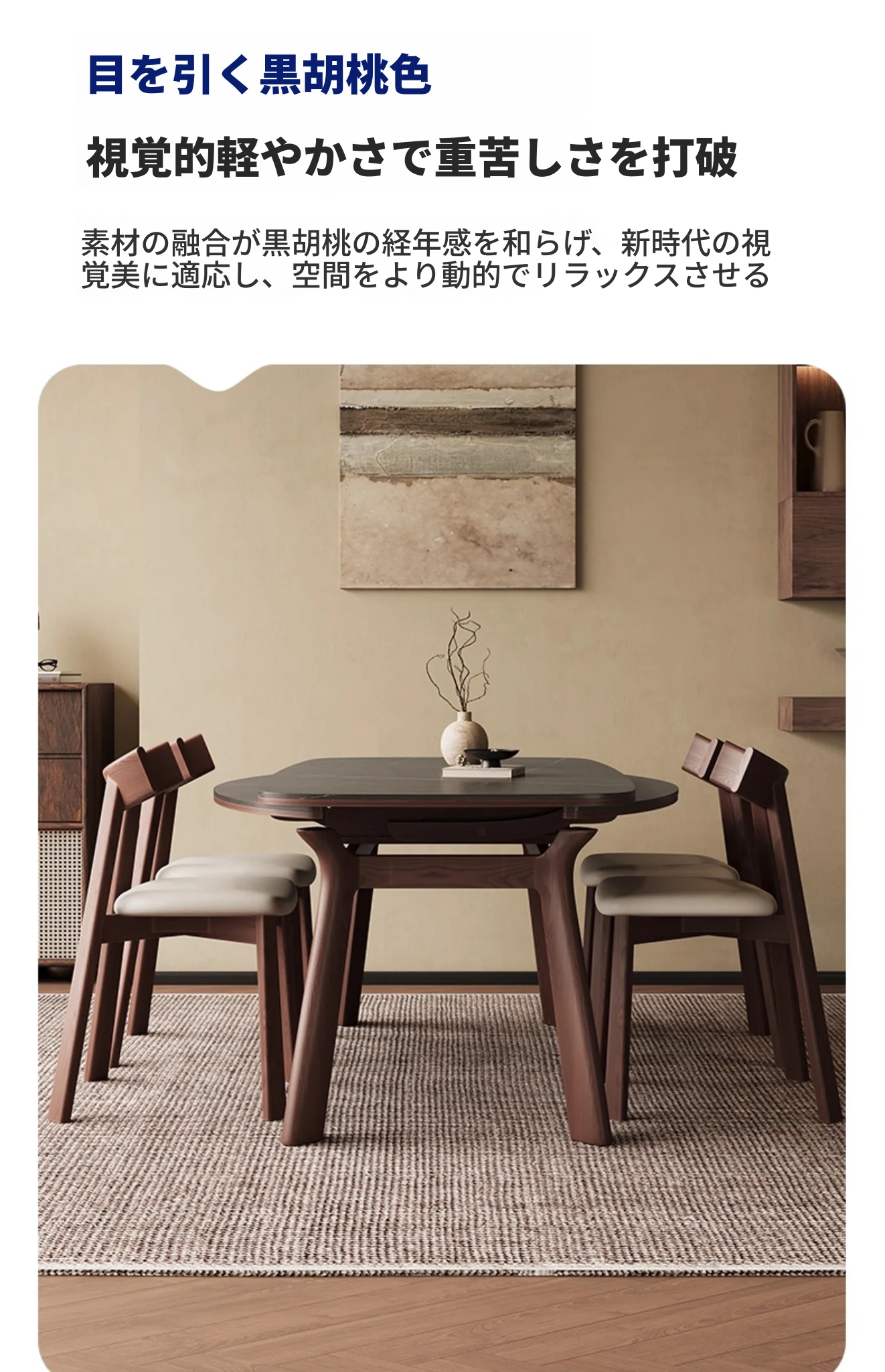 ブラックウォルナット色の侘寂風デザイン、伸縮式の天然木製テーブル&チェアセット。高級感あふれるシンプルな美しさで、家庭にぴったりの洗練されたダイニング空間を演出します。