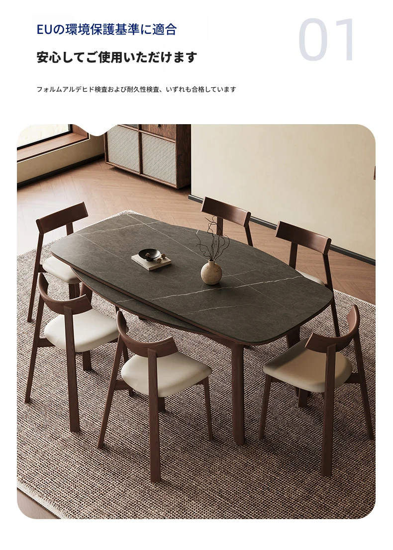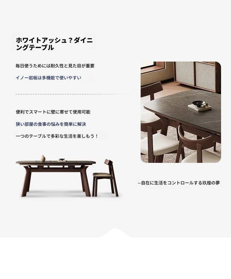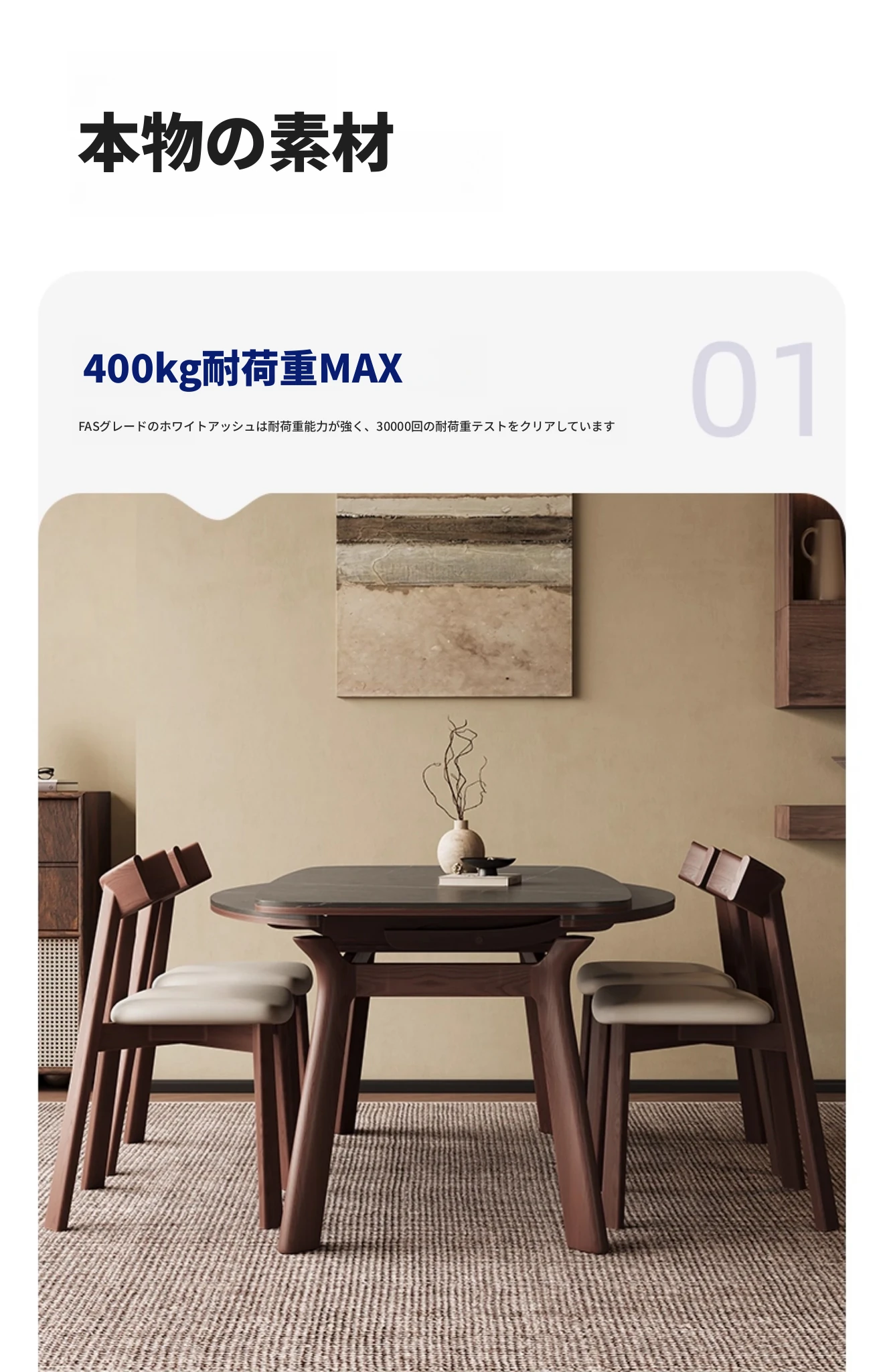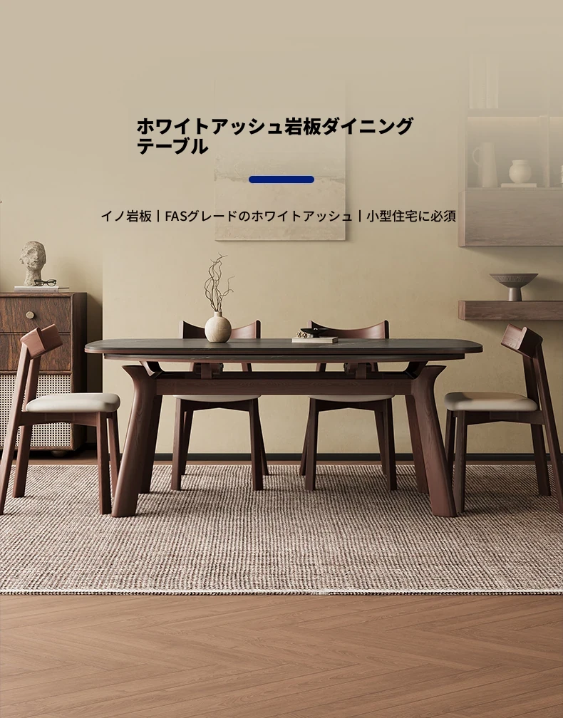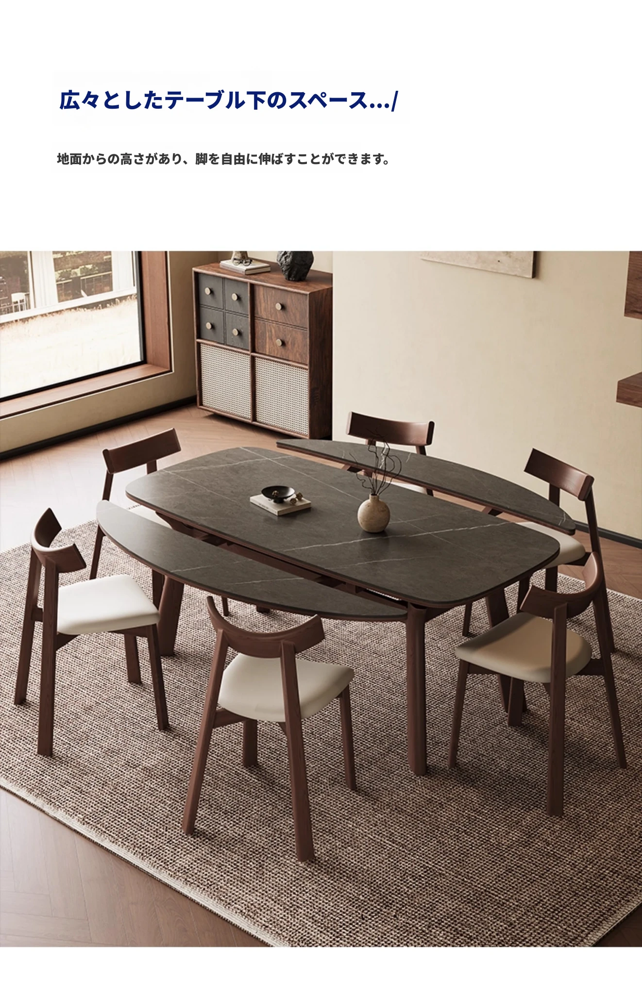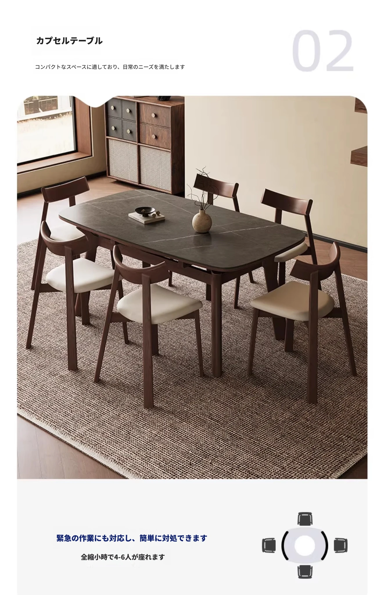 ブラックウォルナット色の侘寂風デザイン、伸縮式の天然木製テーブル&チェアセット。高級感あふれるシンプルな美しさで、家庭にぴったりの洗練されたダイニング空間を演出します。