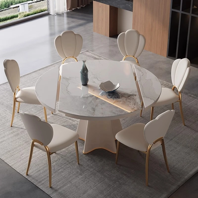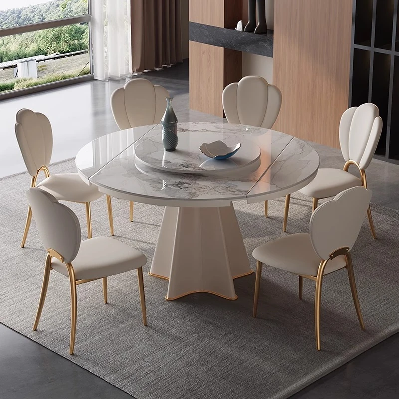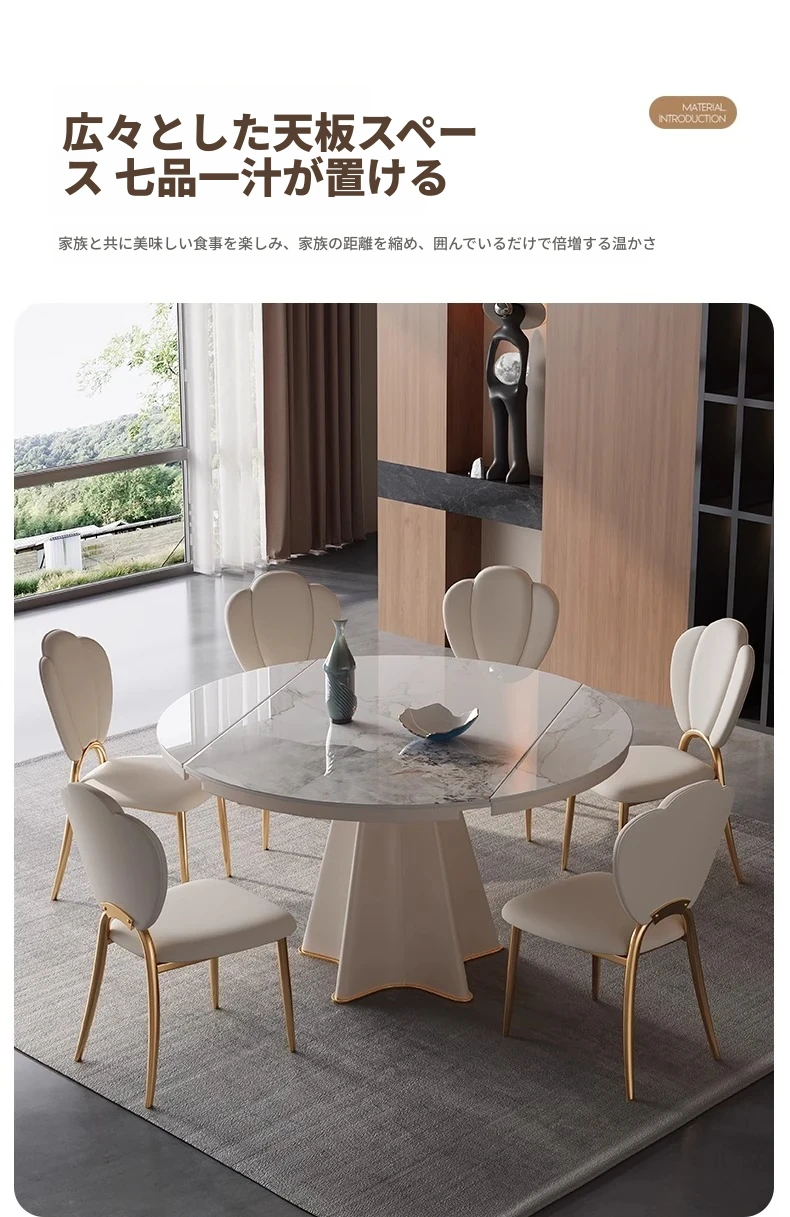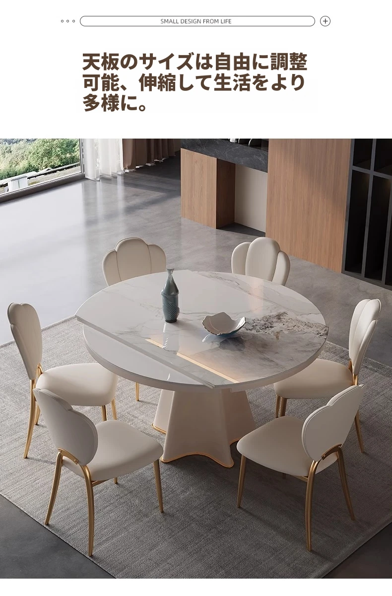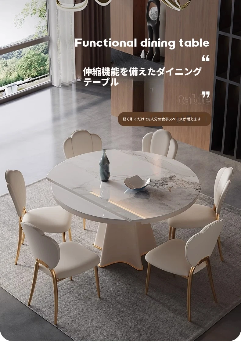 軽奢スタイルの伸縮可能なラウンドテーブル - 小型住宅に最適な機能的デザイン!シンプルで高級感あふれる別荘用ダイニングテーブル&チェアセット。お洒落で実用的な食卓で、特別なひとときを演出します。