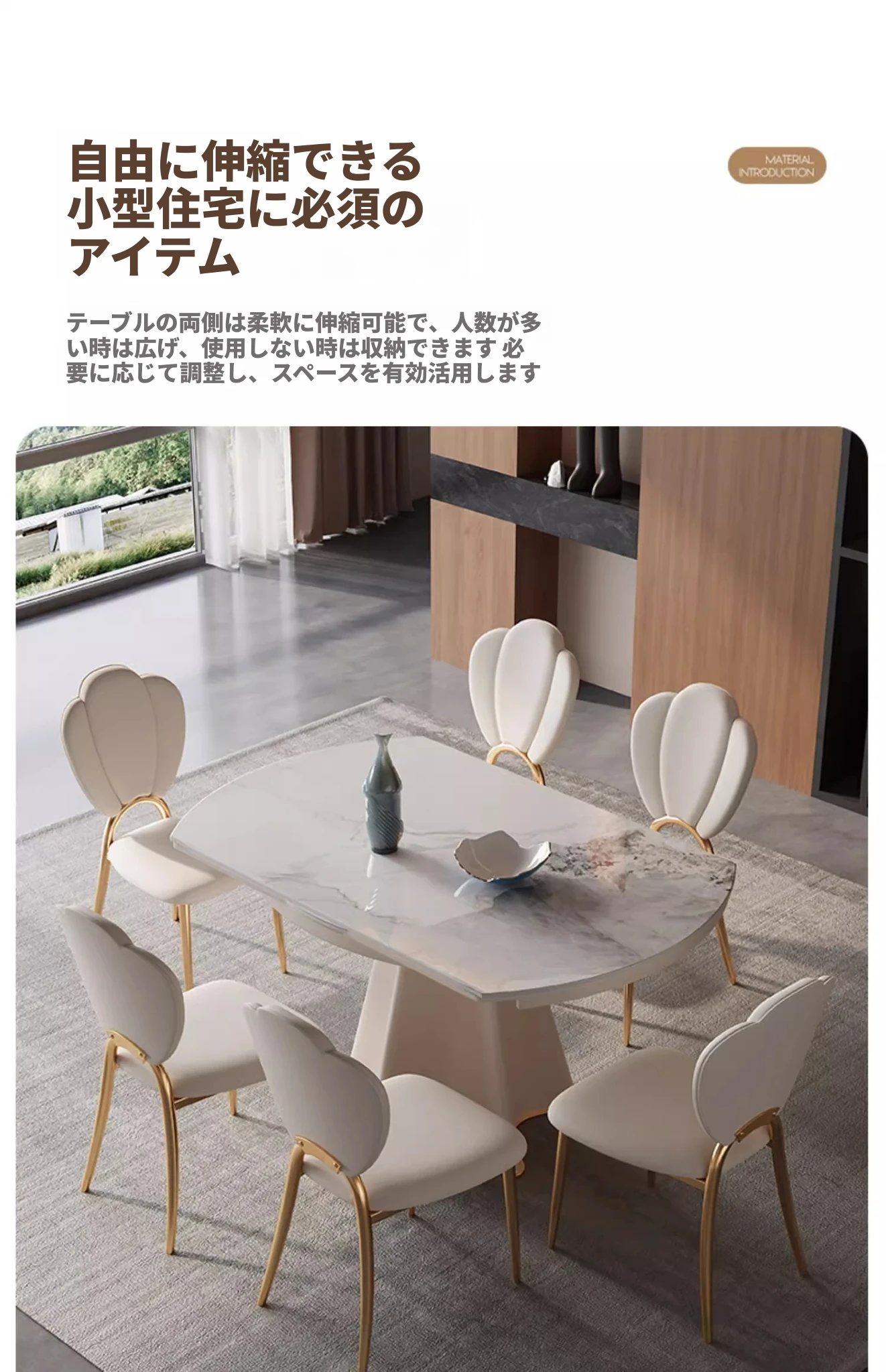 1.5メートル四角から円形に変わるダイニングテーブル+6椅子