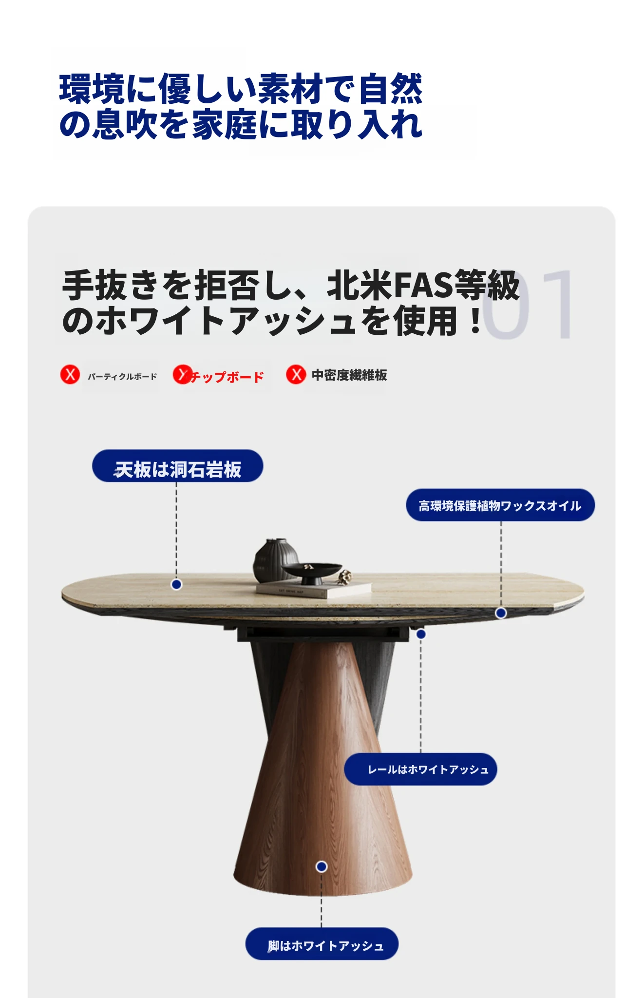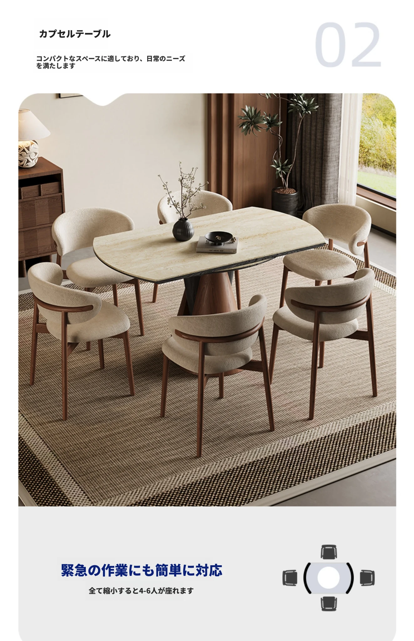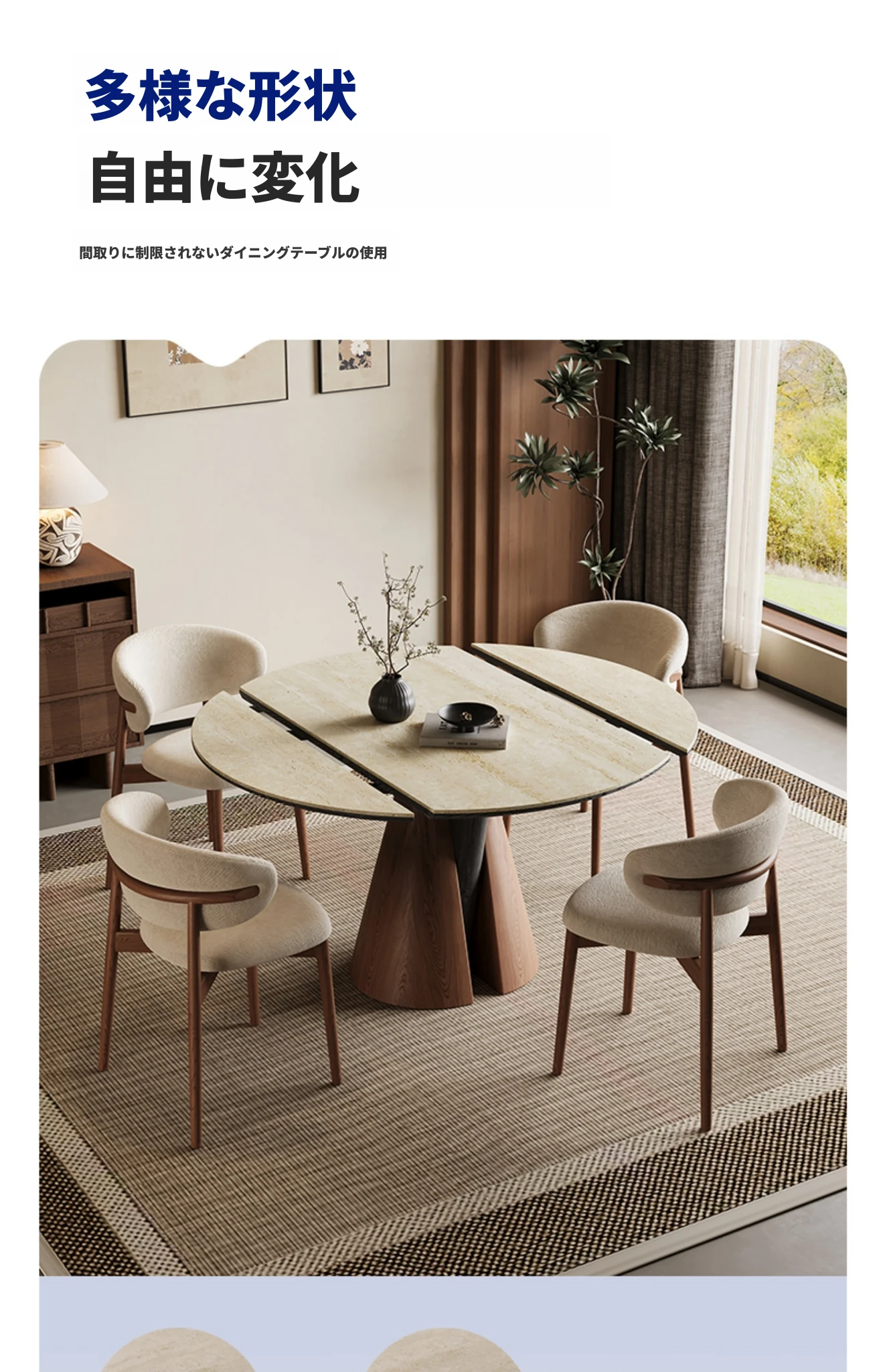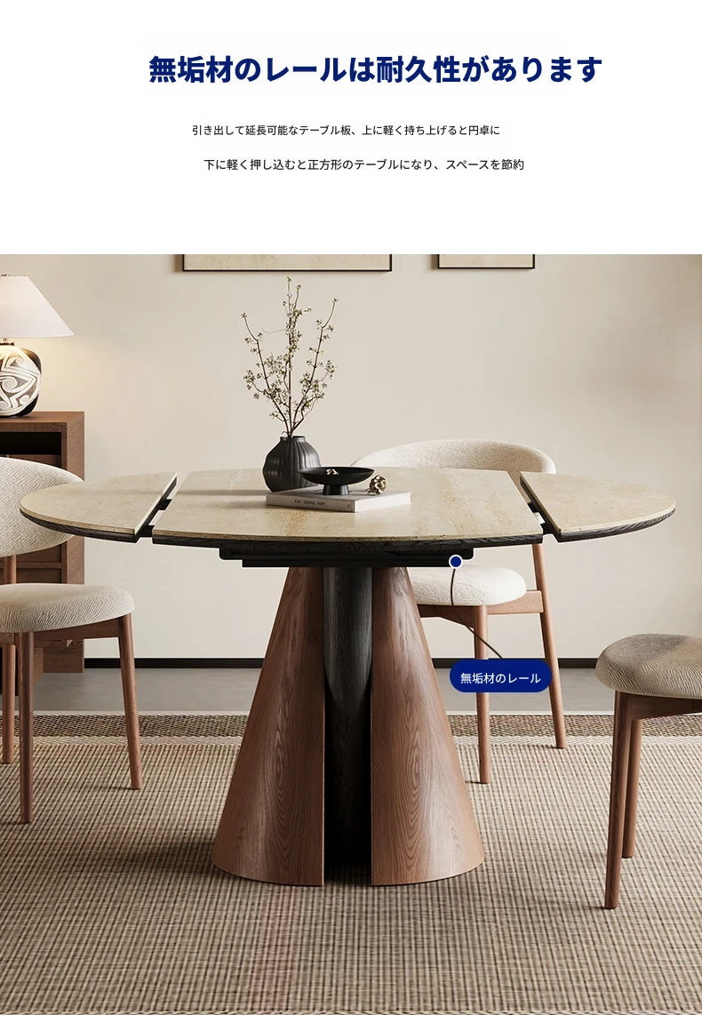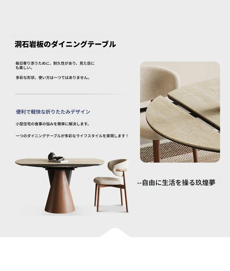 最新デザイン!洞石岩板&無垢材の伸縮式ダイニングテーブル - シンプルでモダンな高級感、折りたたみ可能で使い勝手抜群!2025年新作、家庭にぴったりのスタイリッシュな一品。