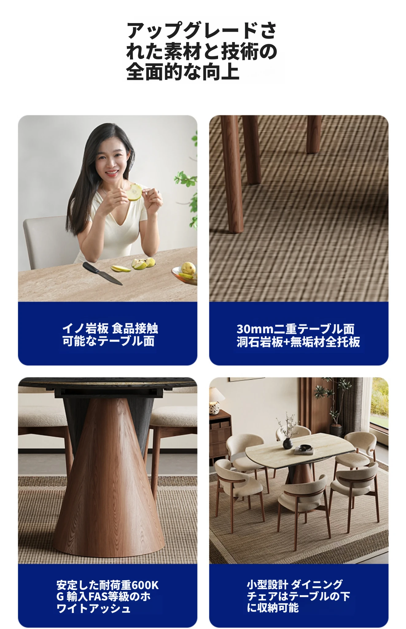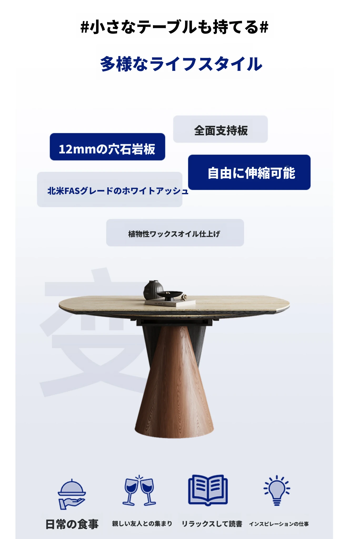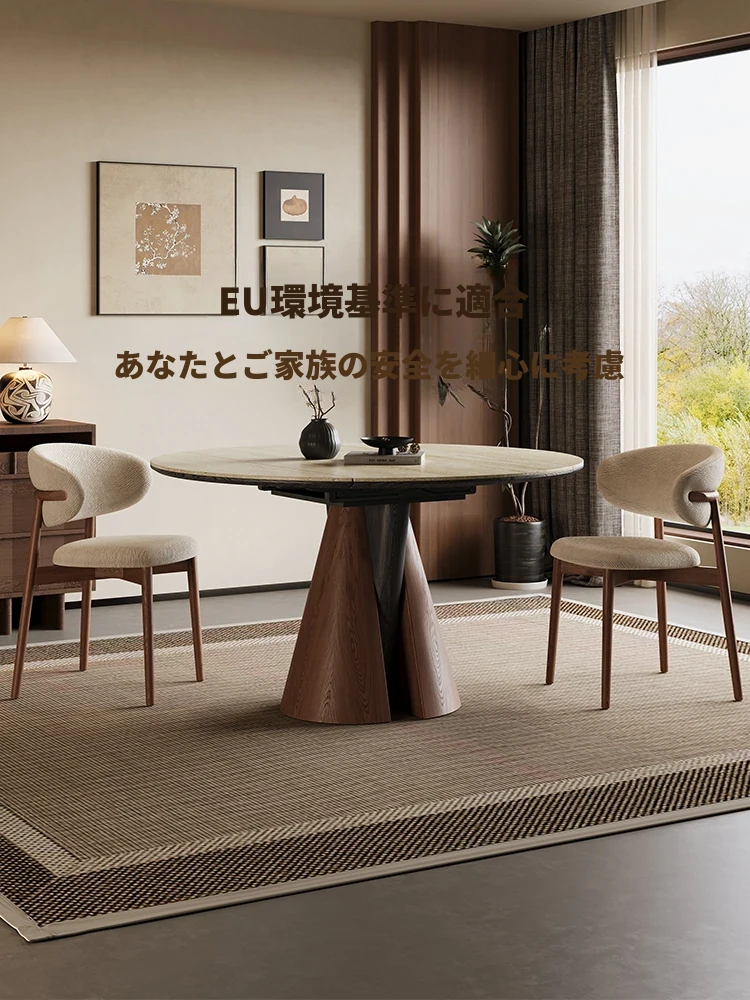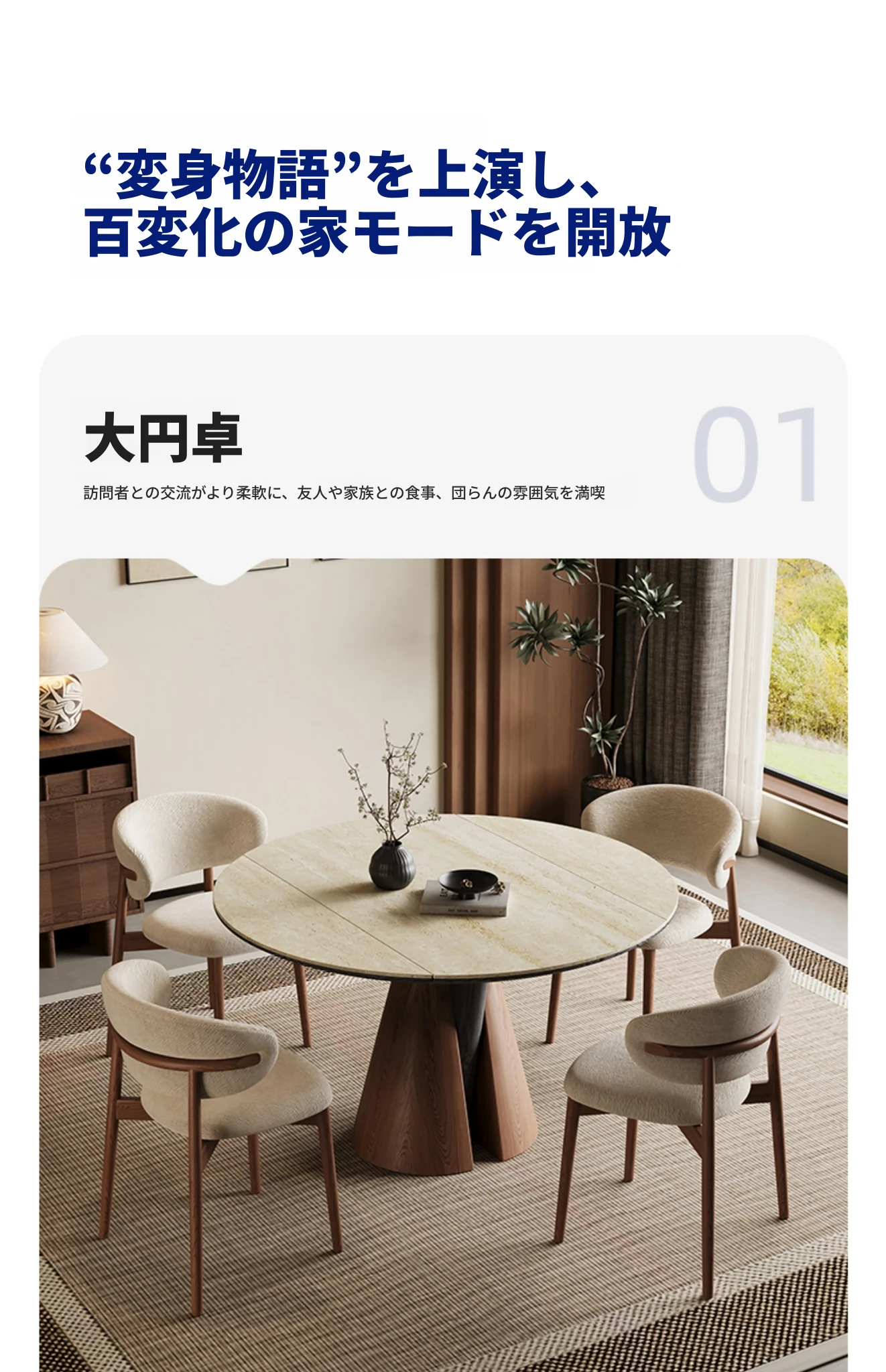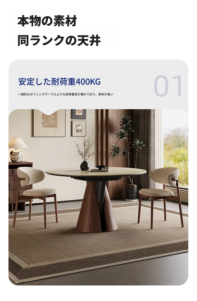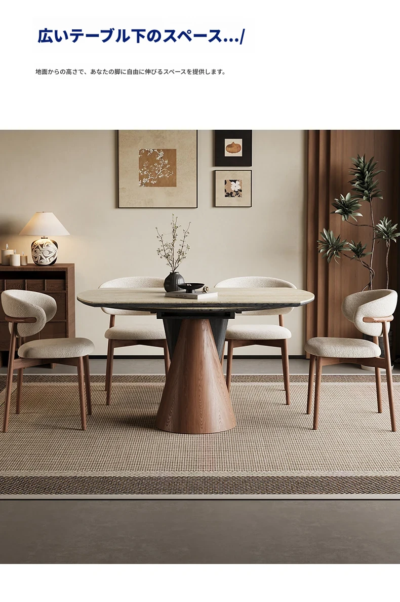 最新デザイン!洞石岩板&無垢材の伸縮式ダイニングテーブル - シンプルでモダンな高級感、折りたたみ可能で使い勝手抜群!2025年新作、家庭にぴったりのスタイリッシュな一品。