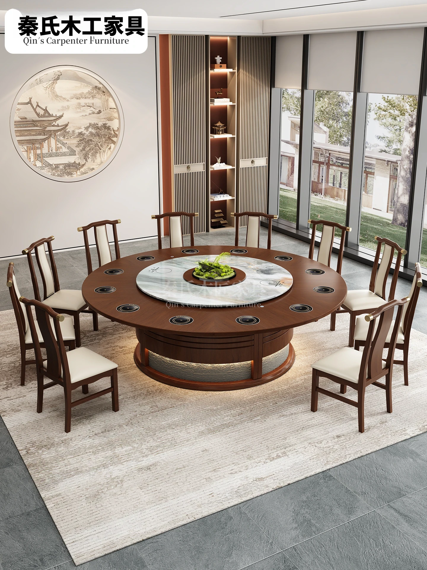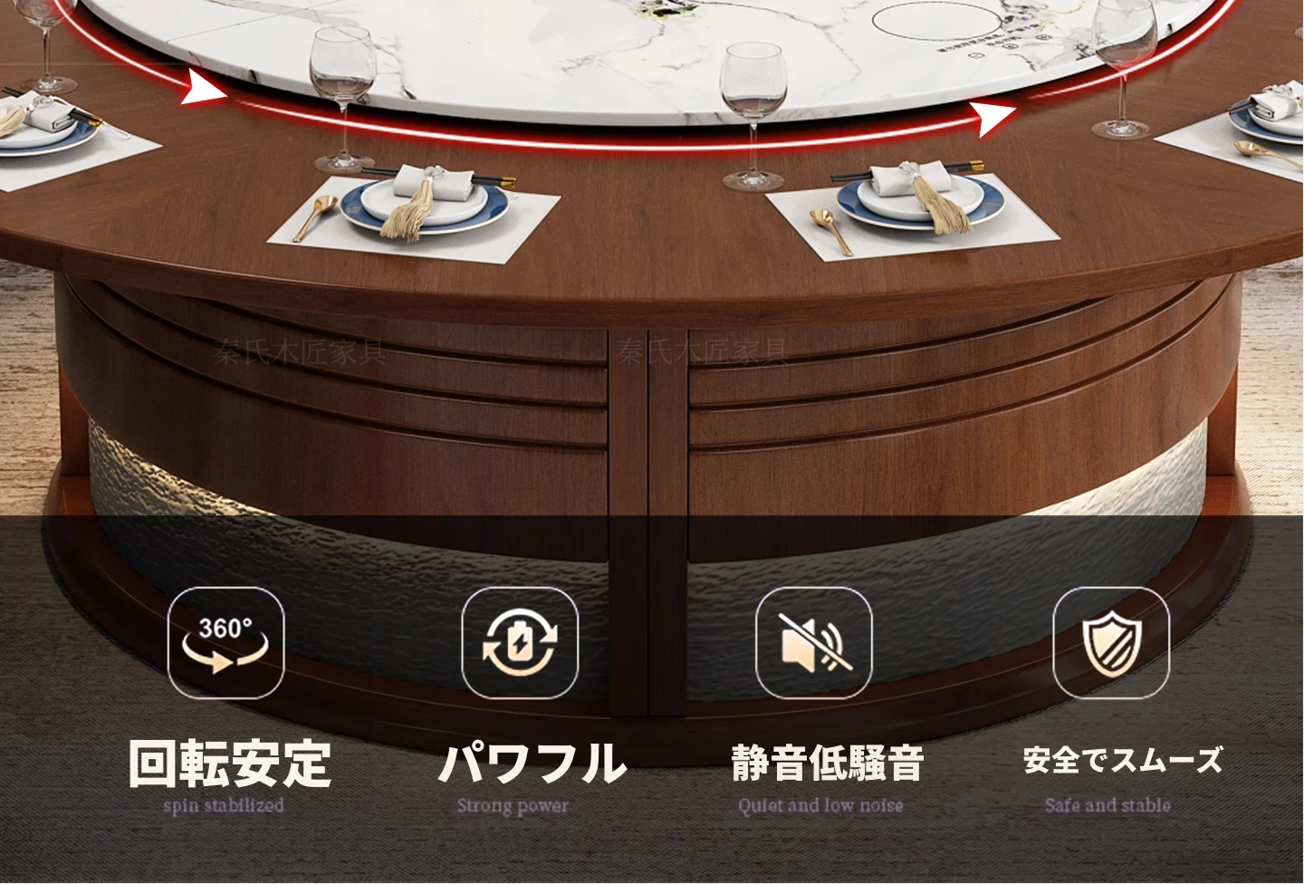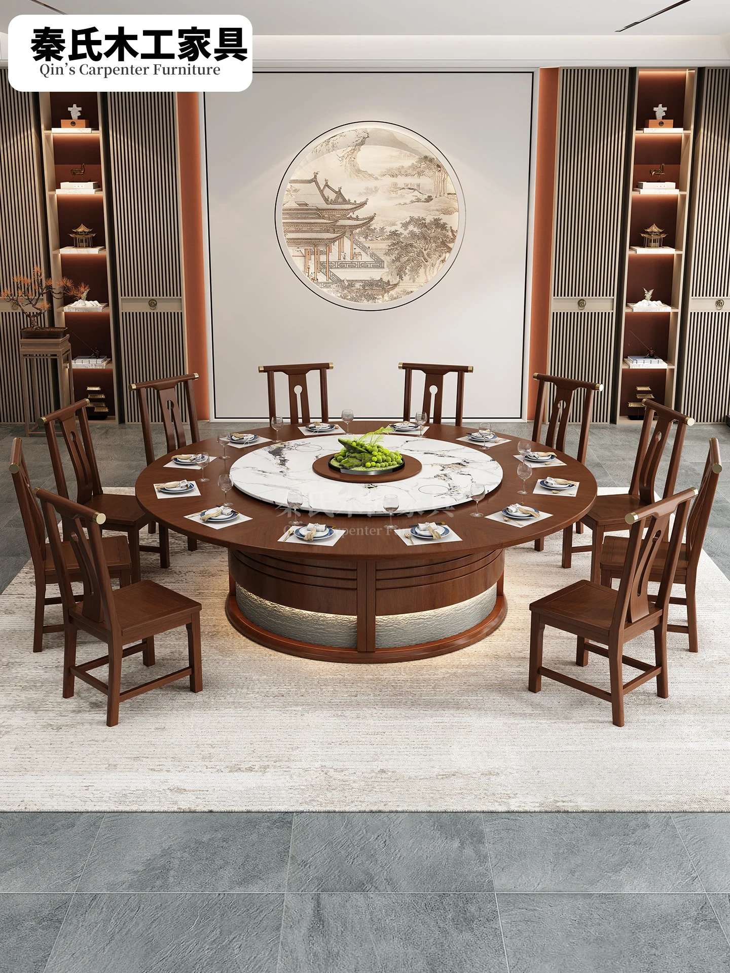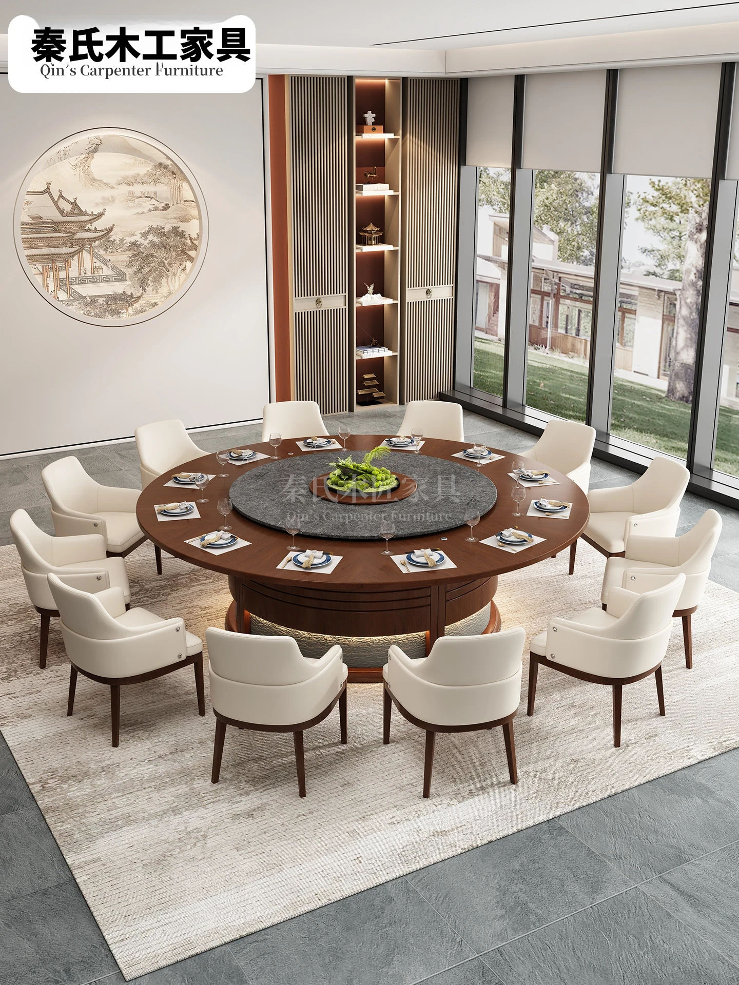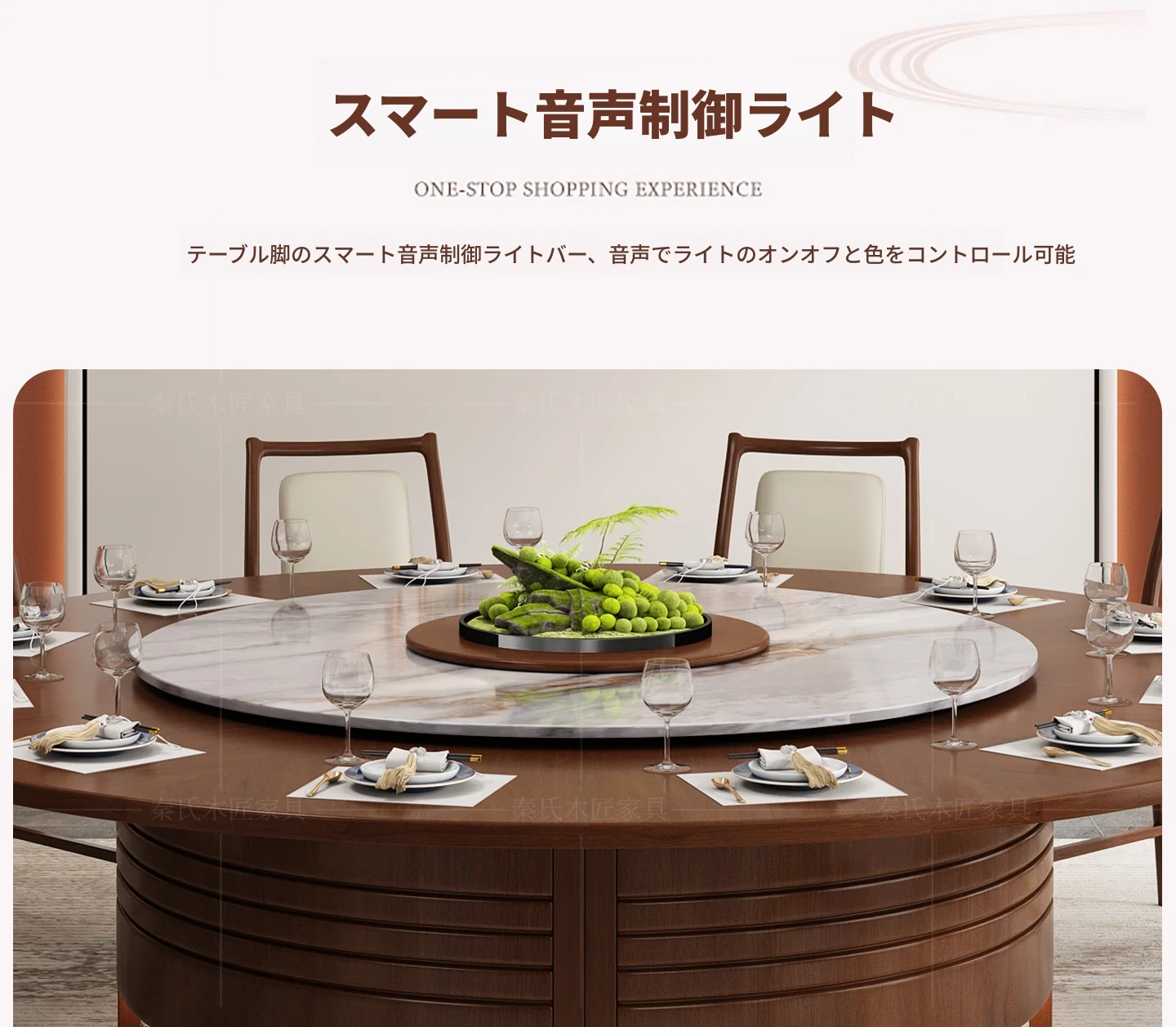 新中式軽奢ホテル用電動ダイニングテーブルセット - 高級感溢れる実木と岩板の組み合わせ、レストランや別荘に最適!自動回転プレート付きで便利さも追求。贅沢なひと時を演出します。