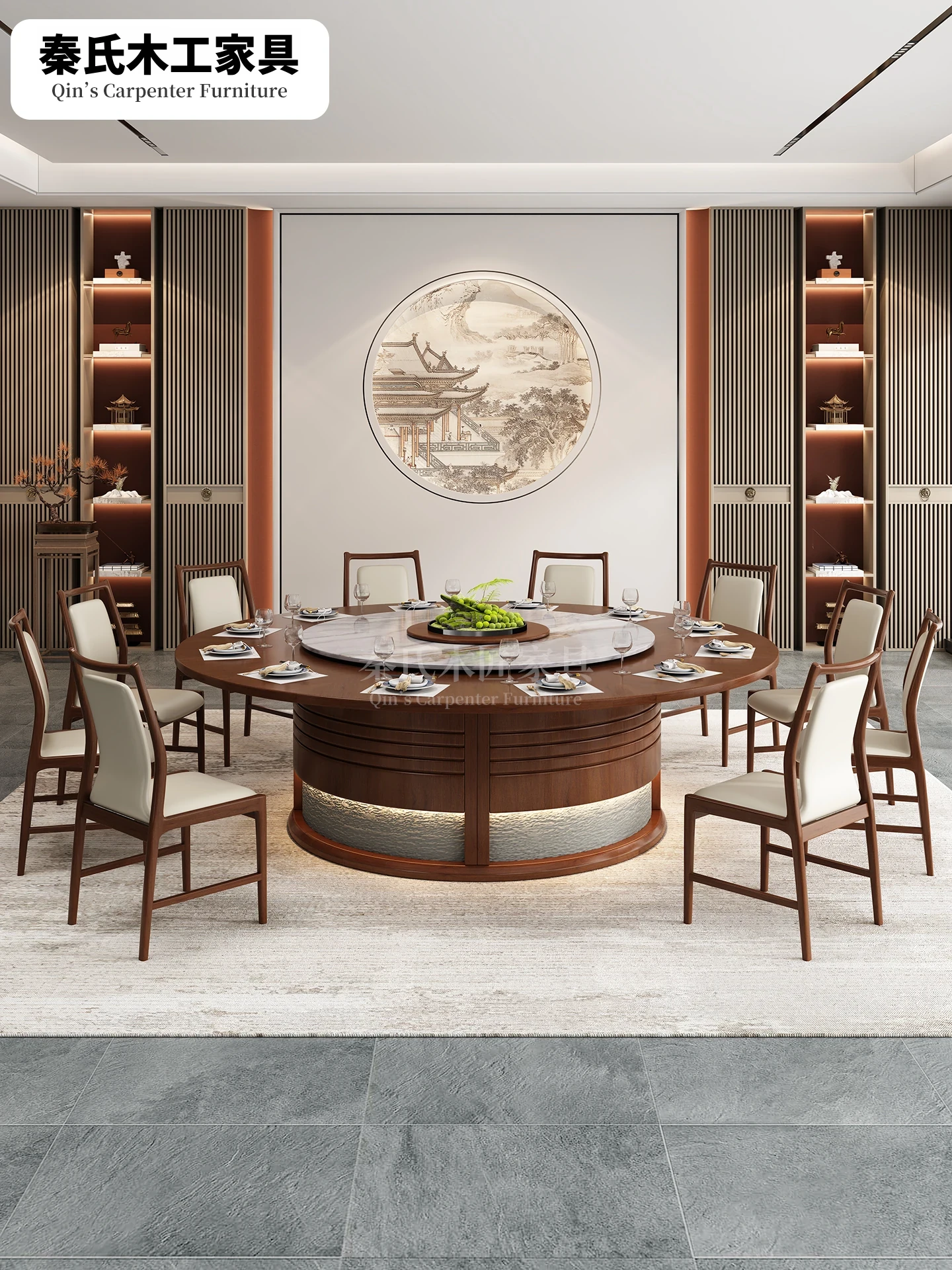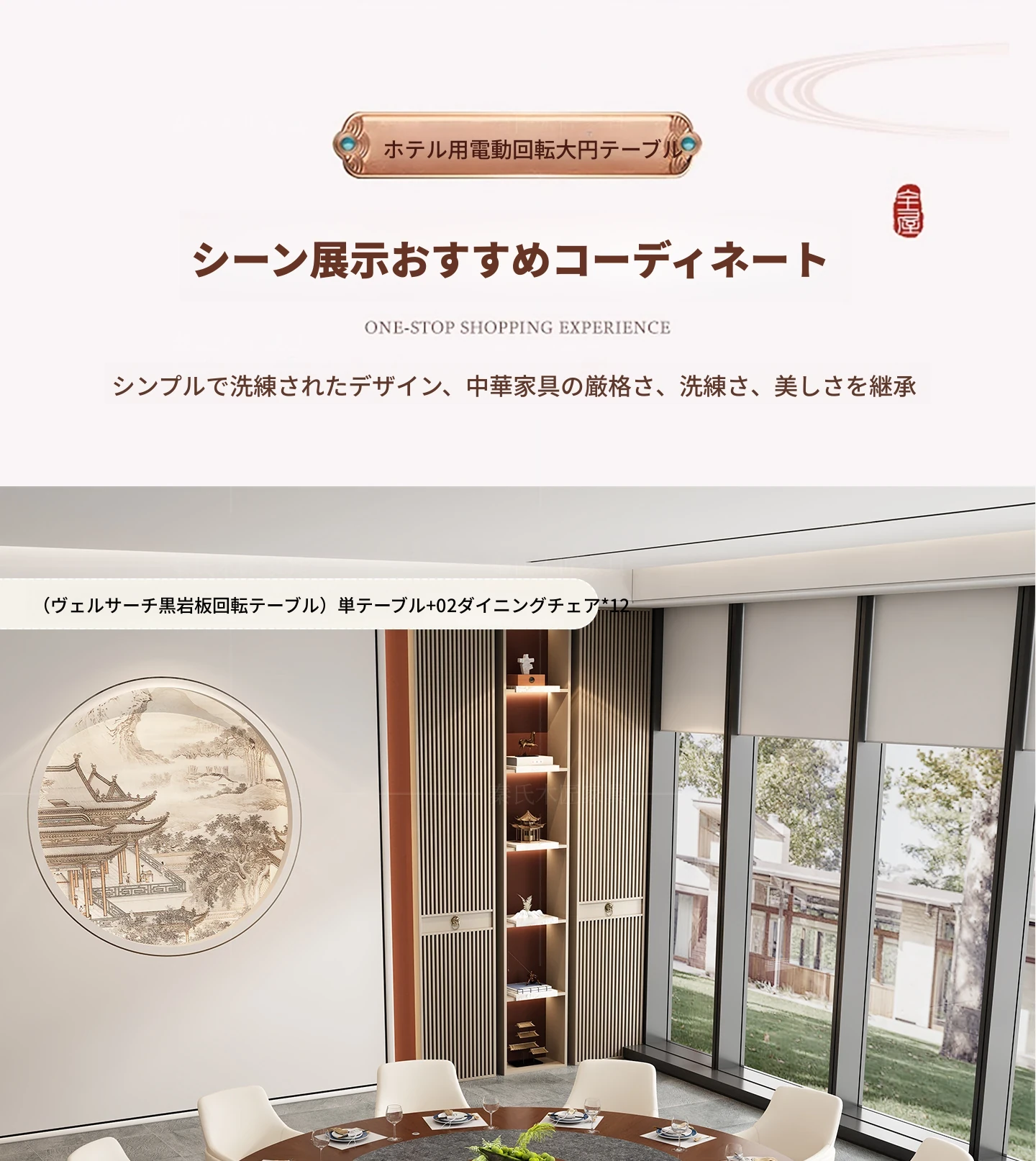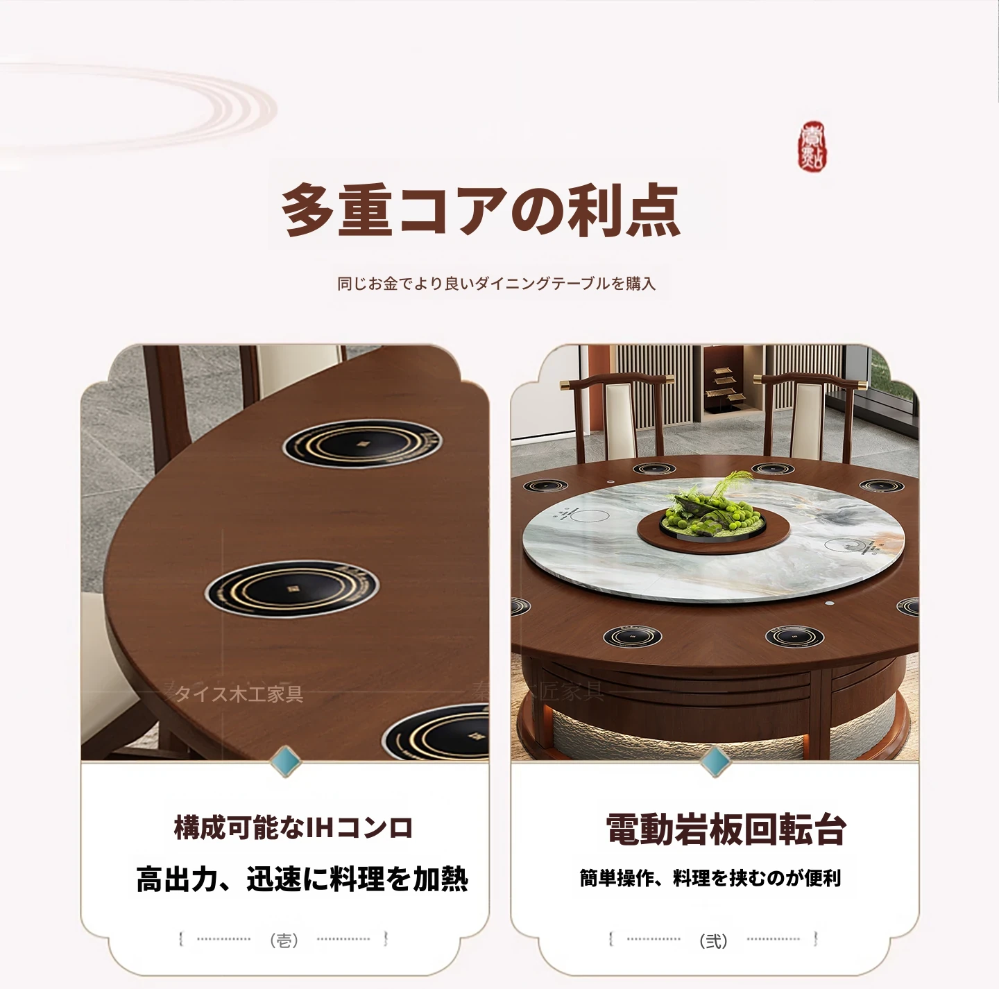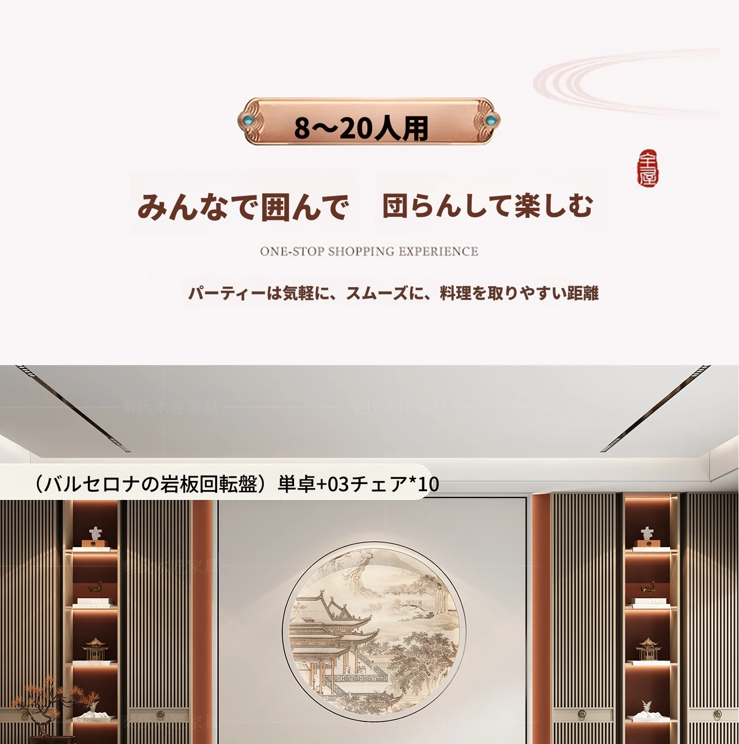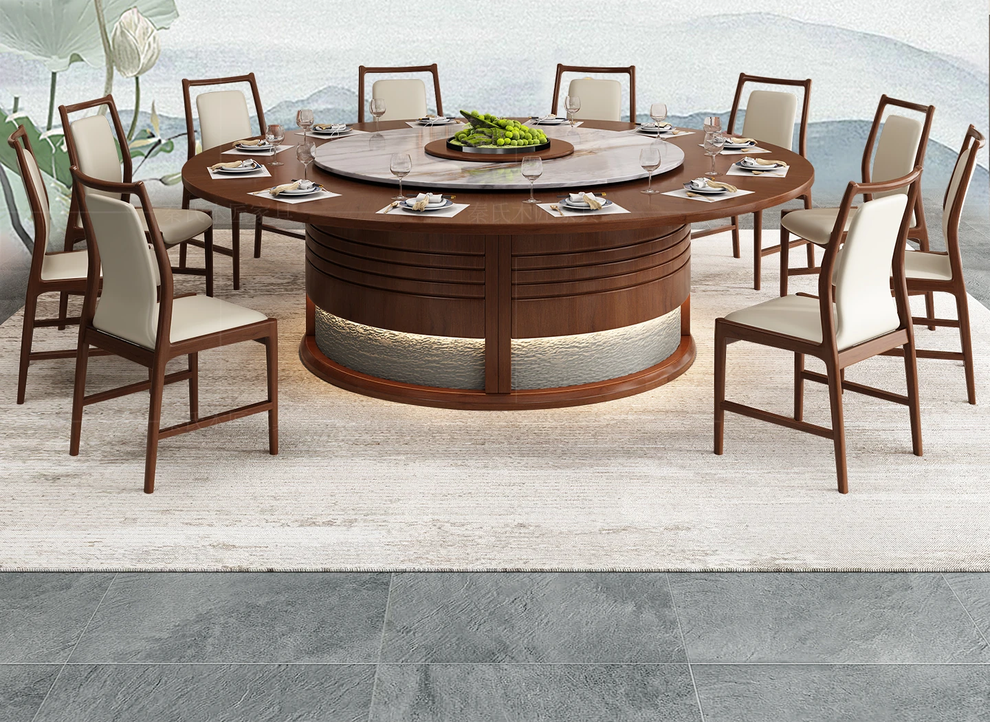 新中式軽奢ホテル用電動ダイニングテーブルセット - 高級感溢れる実木と岩板の組み合わせ、レストランや別荘に最適!自動回転プレート付きで便利さも追求。贅沢なひと時を演出します。