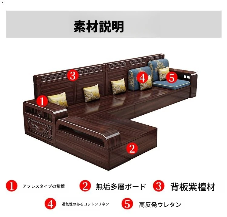 【紫金檀木】四人用ソファ+貴妃ソファ【貴妃ソファ長さ100cm】