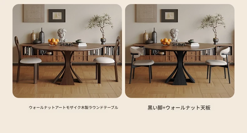 新作!ウォールナット色の無垢材ビンテージ風ラウンドダイニングテーブルセット - 小型住宅に最適な、おしゃれなリビングでの食事や商談にぴったり!