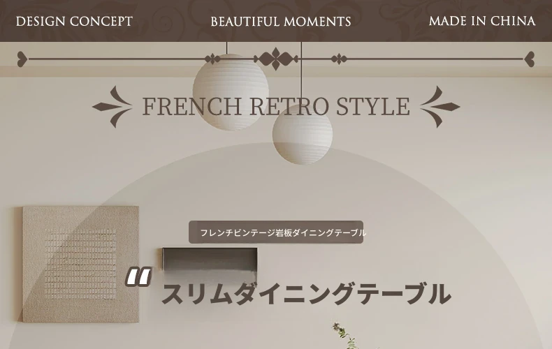 レトロな無垢材を使用したデリフォンデザインの長方形フランス風ヴィンテージダイニングテーブル。高級感あふれる家庭用岩板テーブルで、インテリアに華やかさをプラスします。