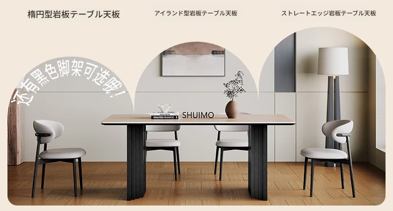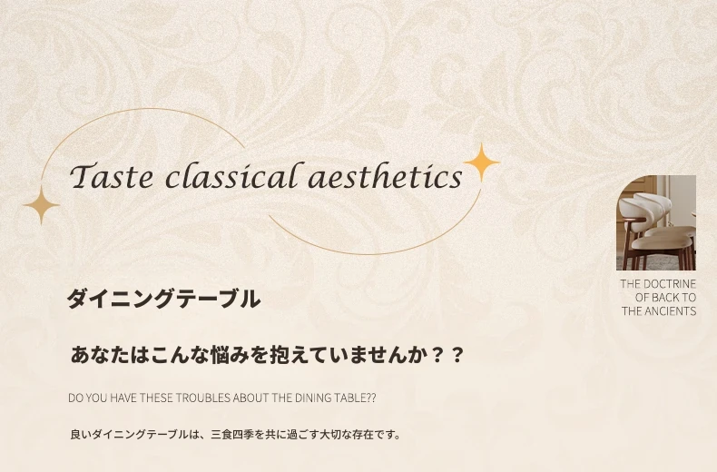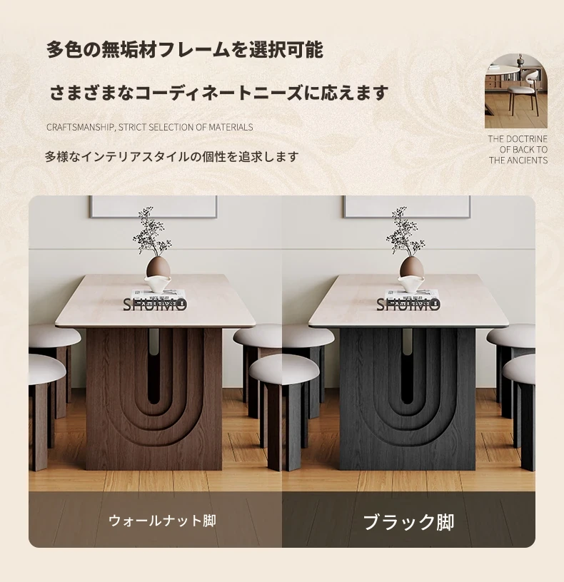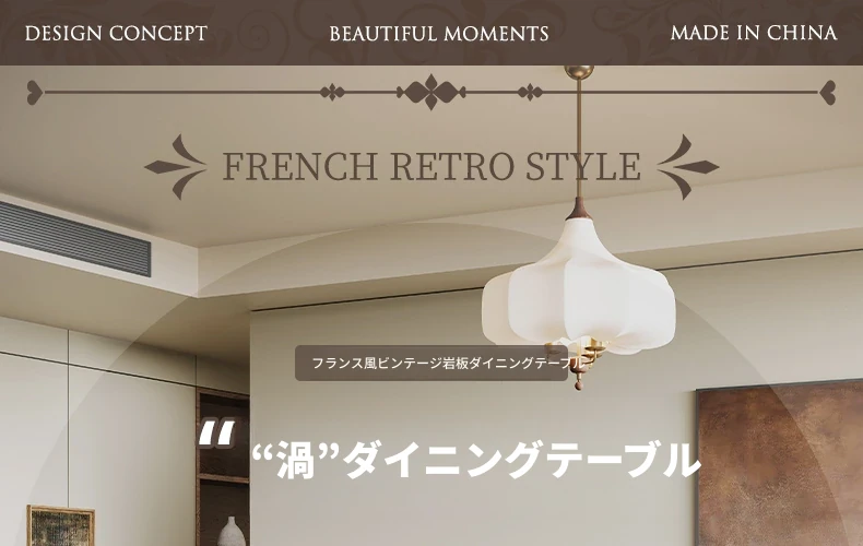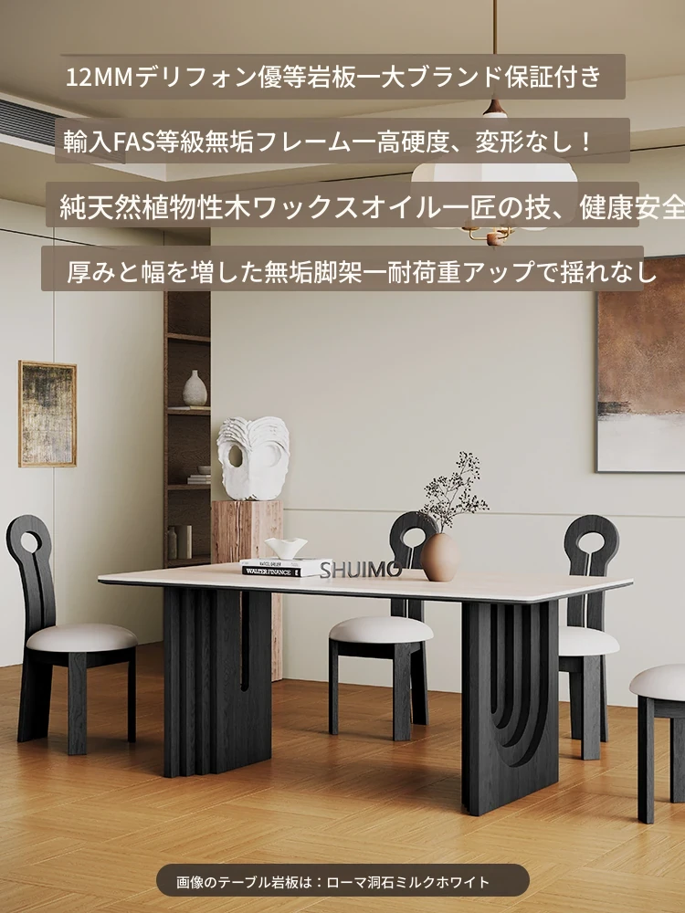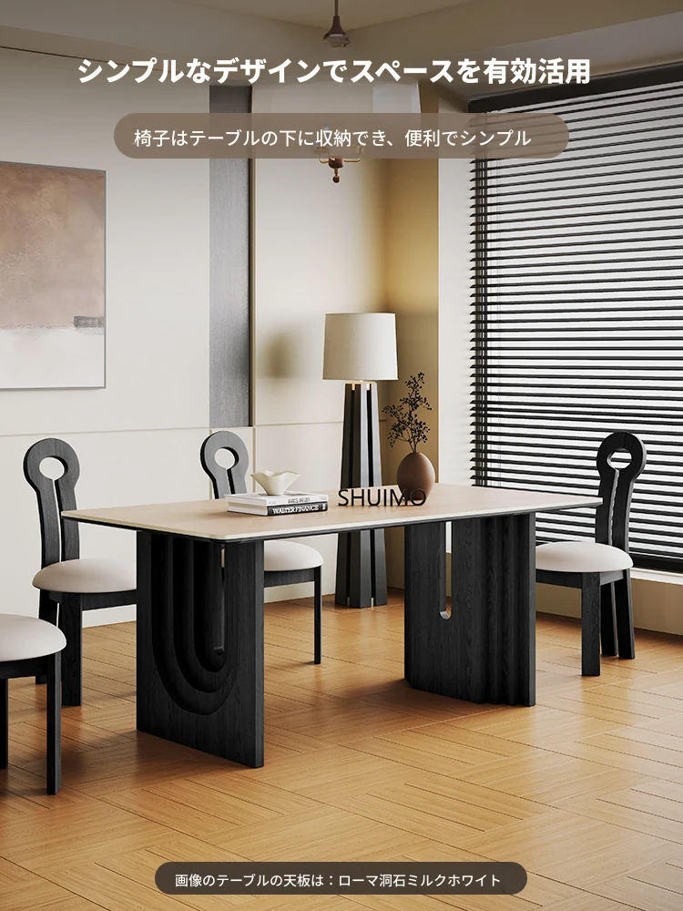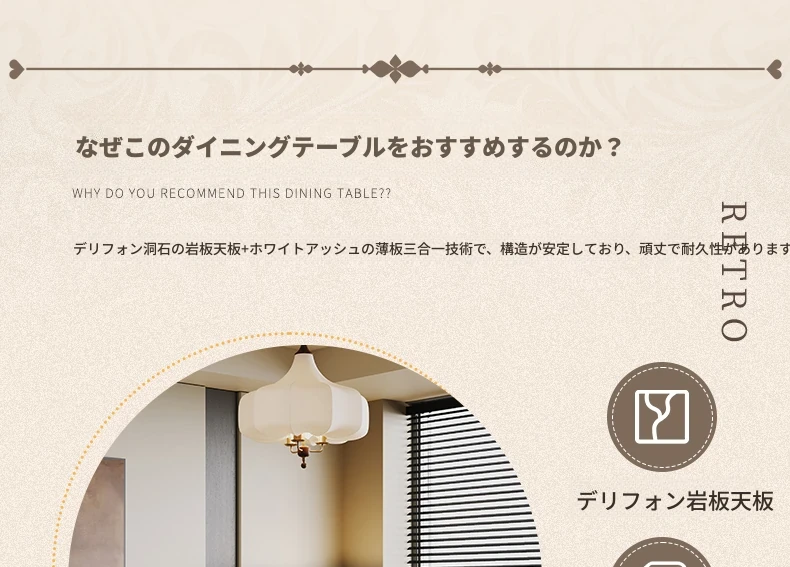 フレンチクリームのレトロスタイル!本格的な無垢材のデリフォン岩板使用、家庭にぴったりの黒い円形ダイニングテーブル。ウォールナット色の渦巻きデザインの椅子付きで、優雅な食卓を演出します!