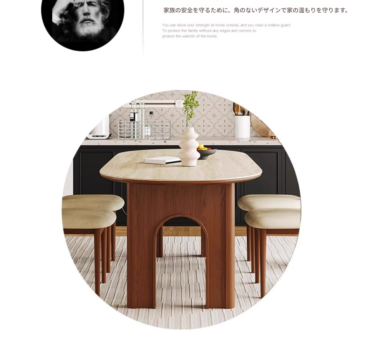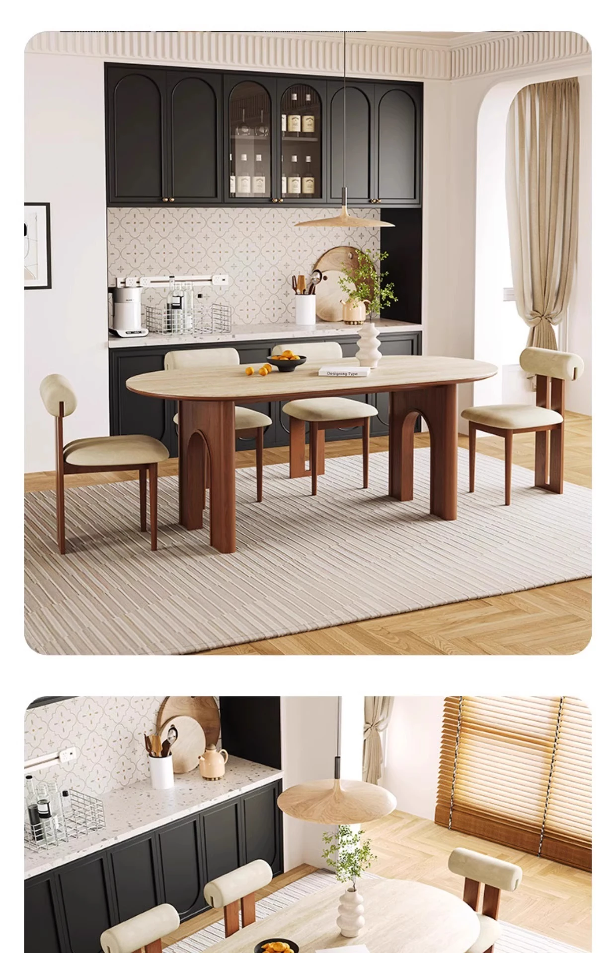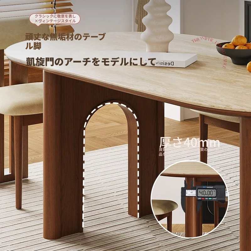 フレンチヴィンテージ風アーチ型ストーンテーブルセット|新作!コンパクトな家用に最適なオーバルデザインの無垢材ダイニングテーブル&チェアコンビネーション