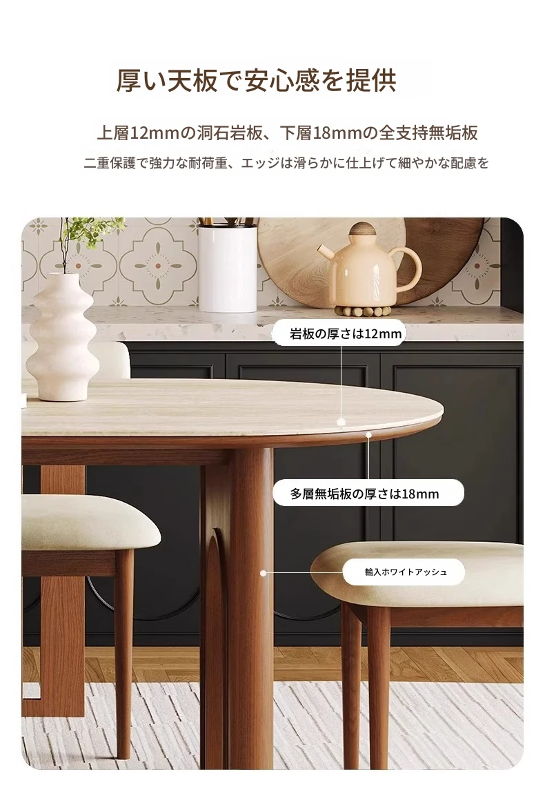 北欧デザインの伸縮式ラウンド岩板ダイニングテーブル - 小スペースに最適!角丸両用の折りたたみ可能な天然木製テーブルで、家族や友人との食事を楽しむための完璧なアイテムです。