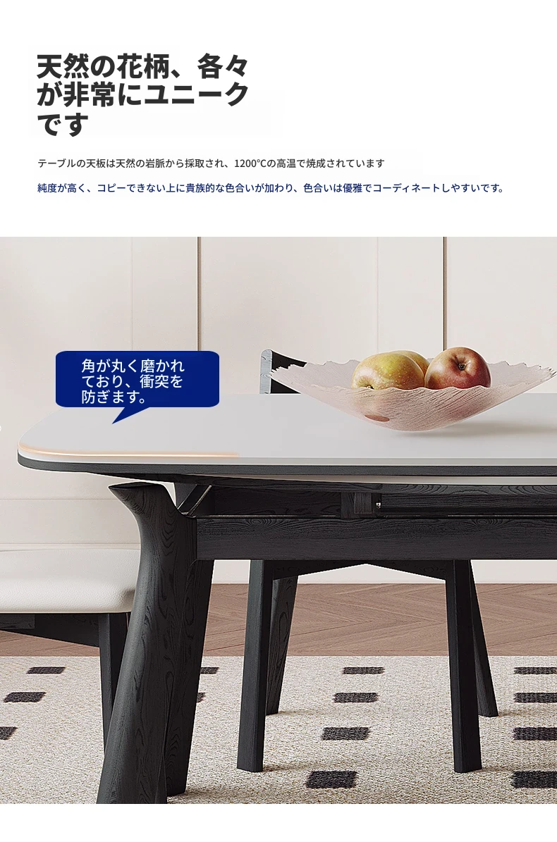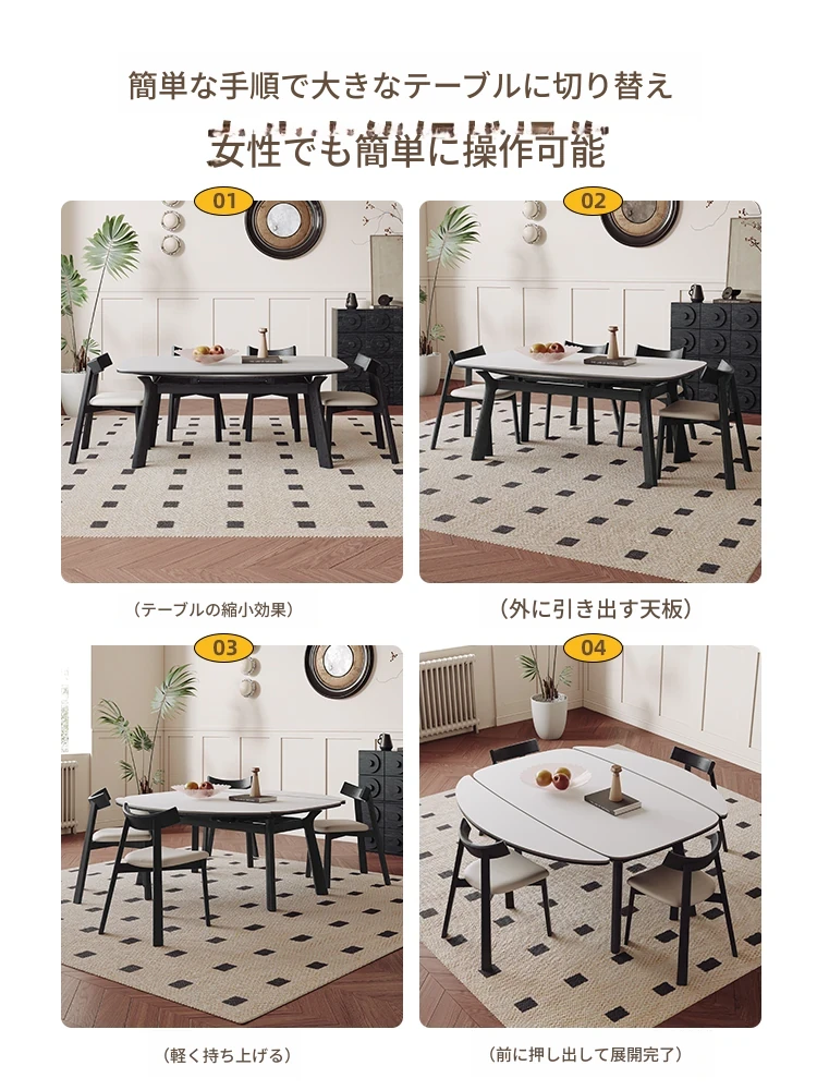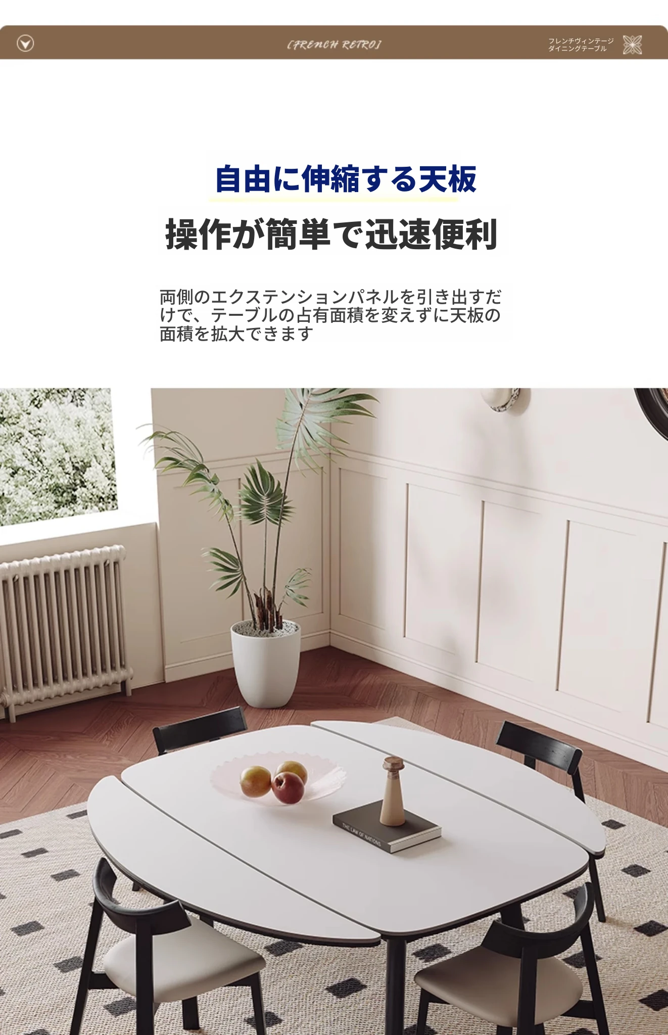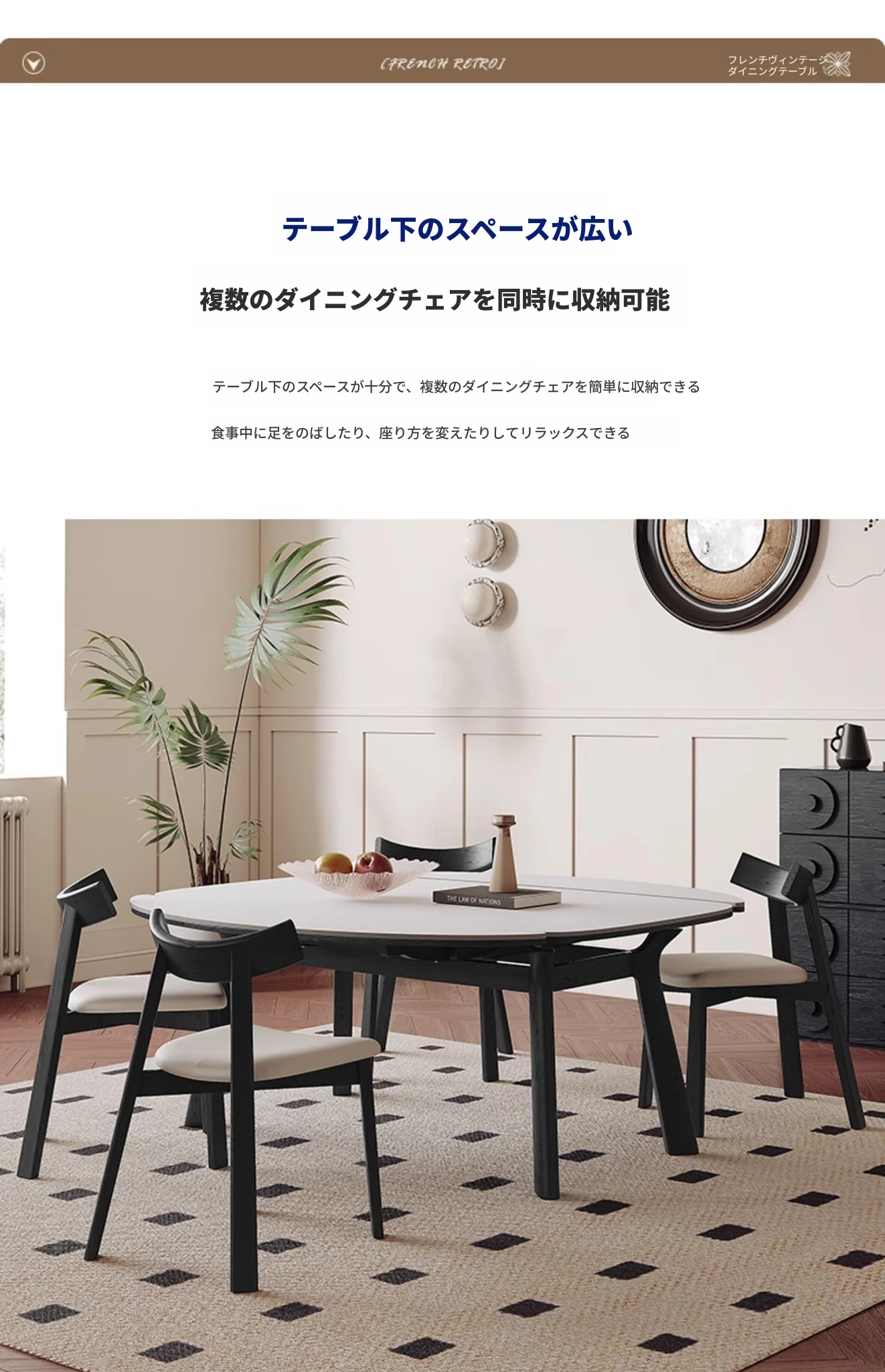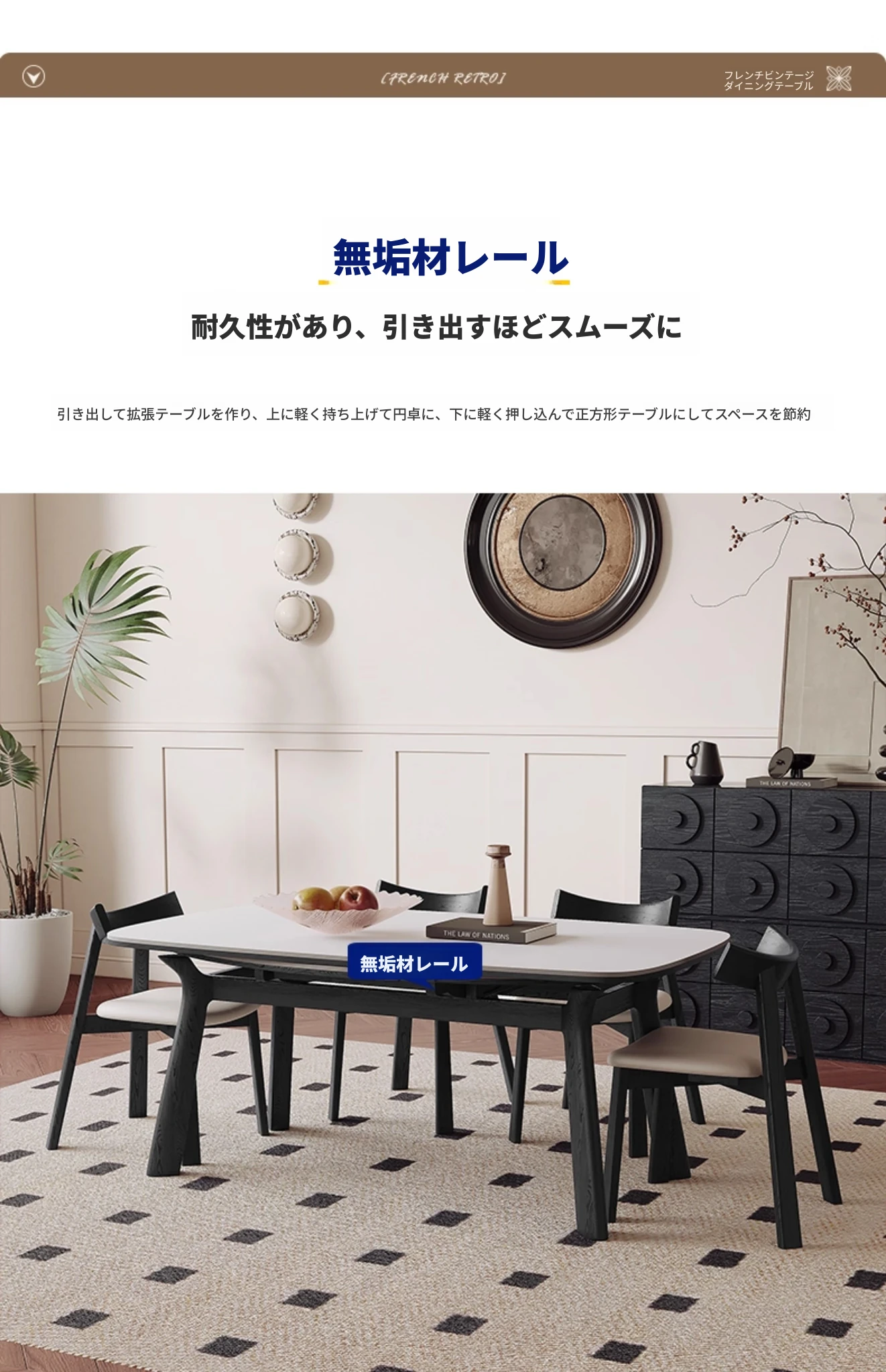 フレンチヴィンテージブラック伸縮岩板天然木ダイニングテーブル - 小型住宅に最適な折りたたみ式、ラグジュアリーな丸型と四角型の2WAYテーブル!エレガントなデザインで、限られたスペースを有効活用!
