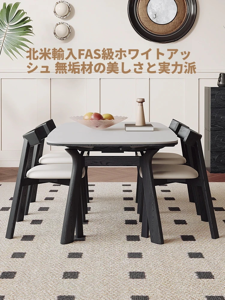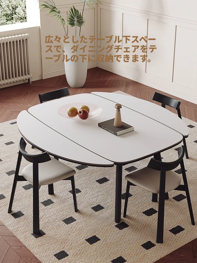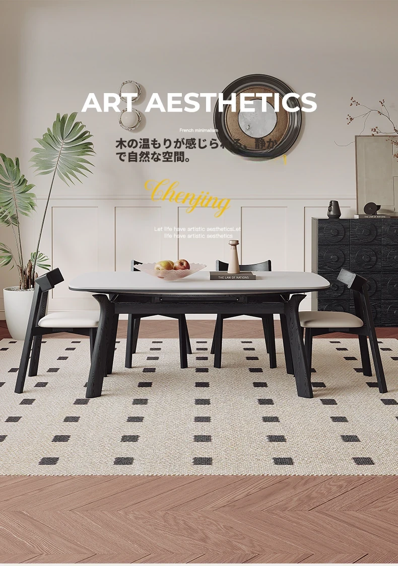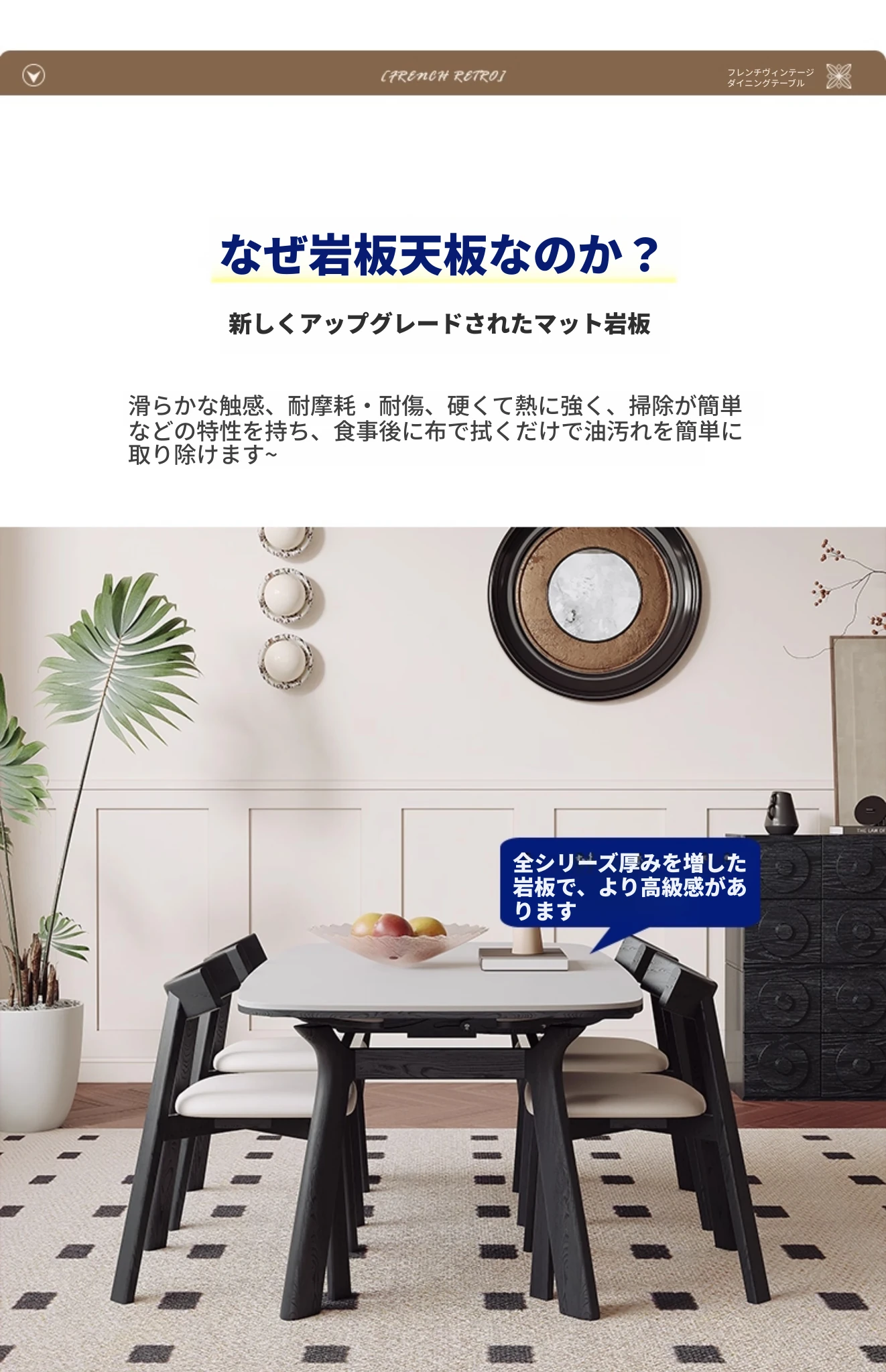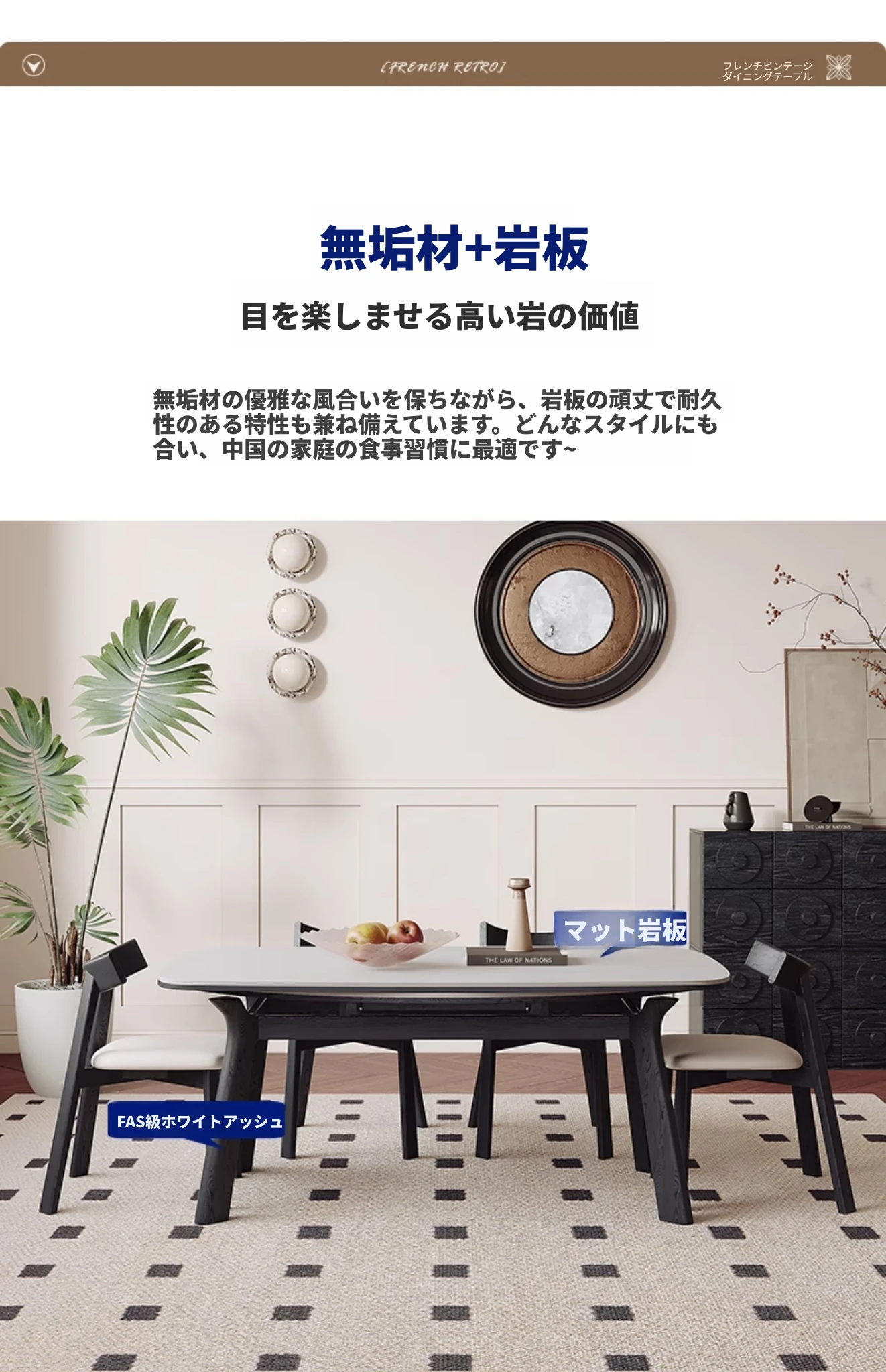 フレンチヴィンテージブラック伸縮岩板天然木ダイニングテーブル - 小型住宅に最適な折りたたみ式、ラグジュアリーな丸型と四角型の2WAYテーブル!エレガントなデザインで、限られたスペースを有効活用!