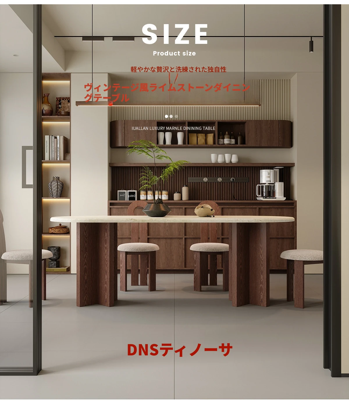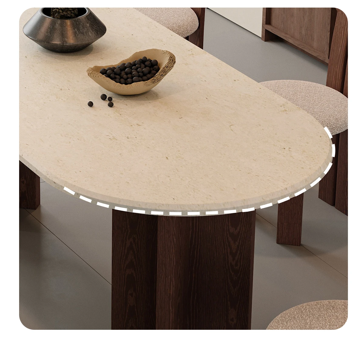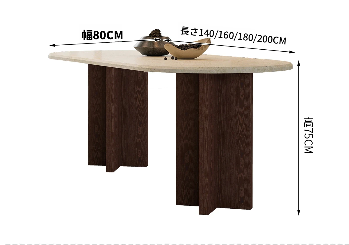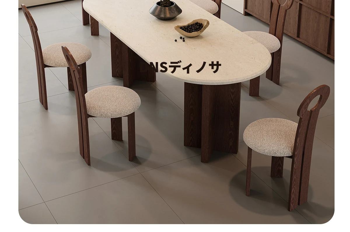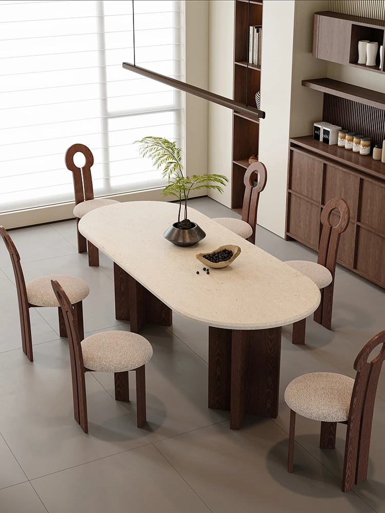 フランス風アンティークスタイルの楕円形ライム天然大理石ダイニングテーブル - 小型家族向けの特選無垢材使用!おしゃれな洞石デザインで、心地よい食卓空間を演出します。