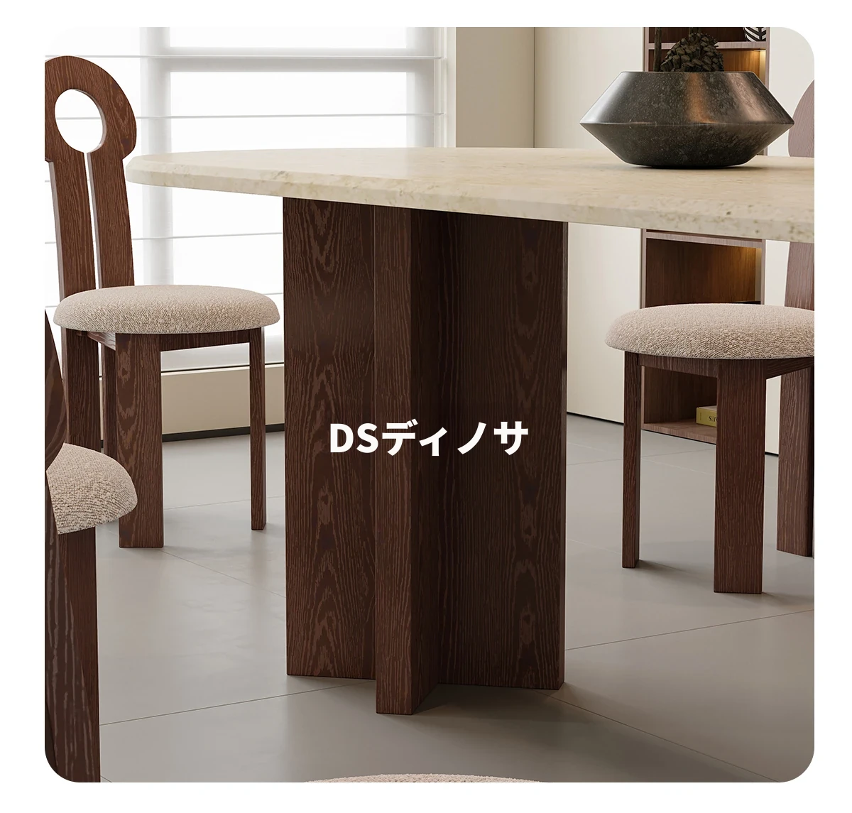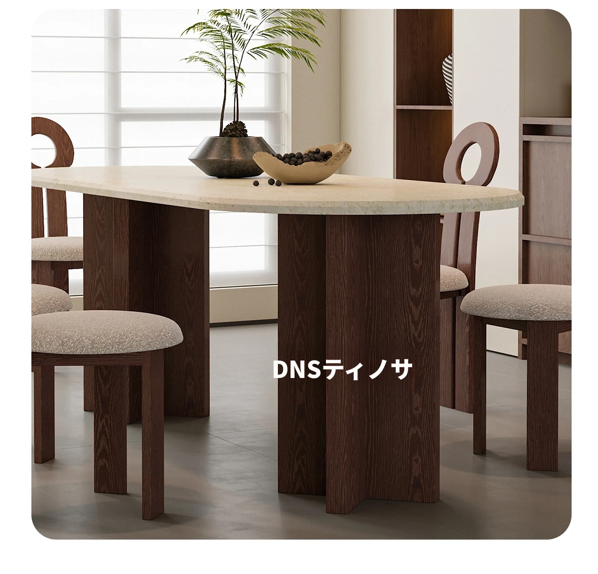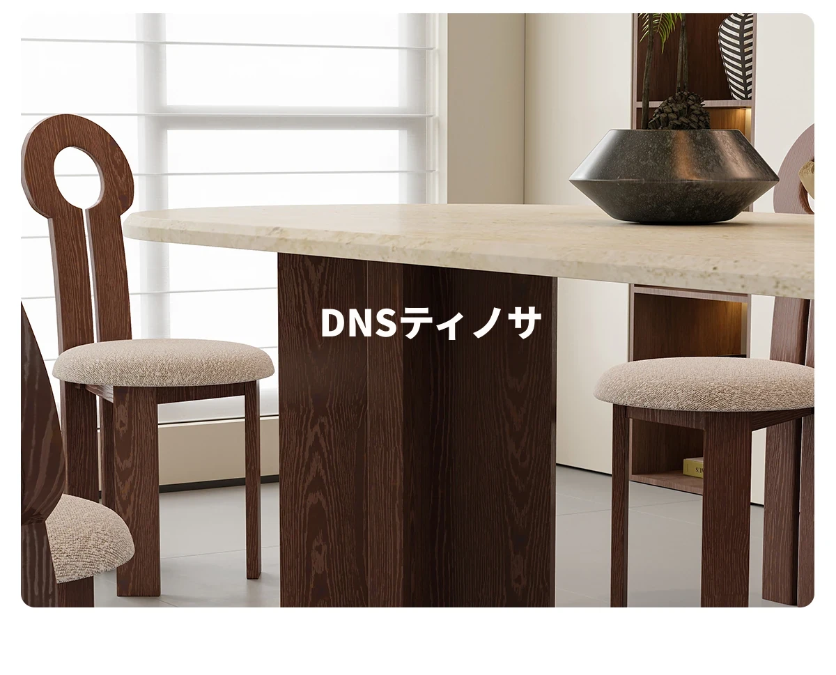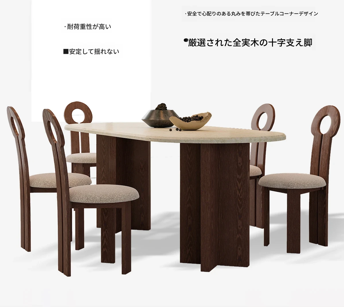 フランス風アンティークスタイルの楕円形ライム天然大理石ダイニングテーブル - 小型家族向けの特選無垢材使用!おしゃれな洞石デザインで、心地よい食卓空間を演出します。