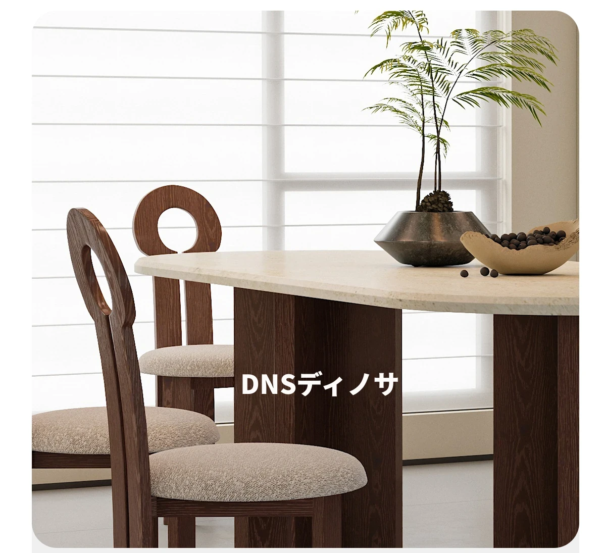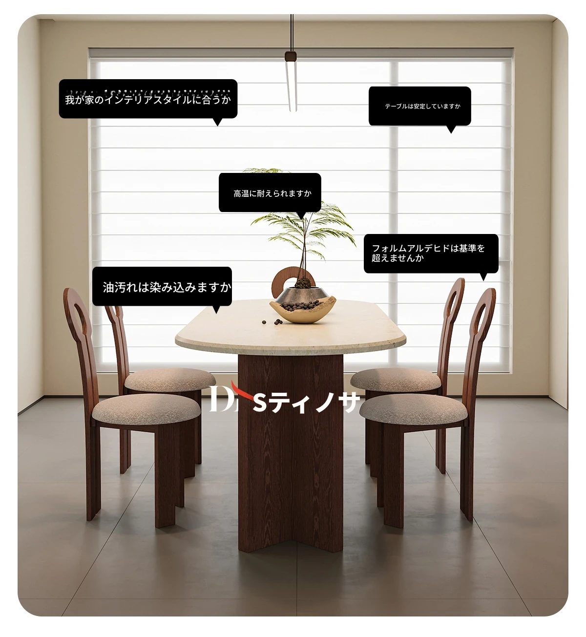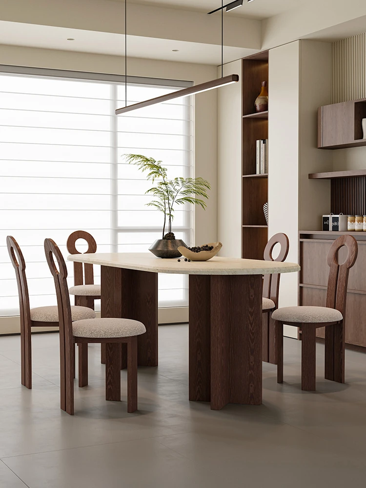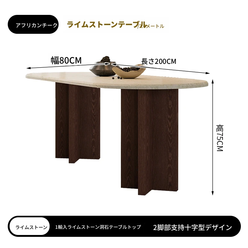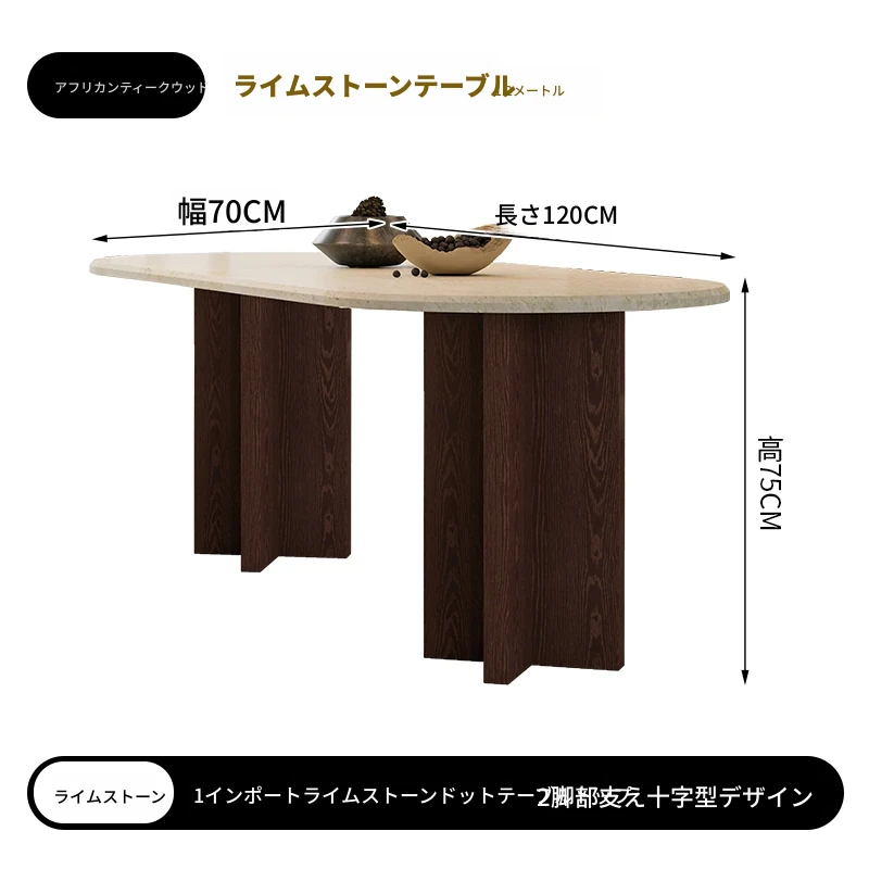 フランス風アンティークスタイルの楕円形ライム天然大理石ダイニングテーブル - 小型家族向けの特選無垢材使用!おしゃれな洞石デザインで、心地よい食卓空間を演出します。
