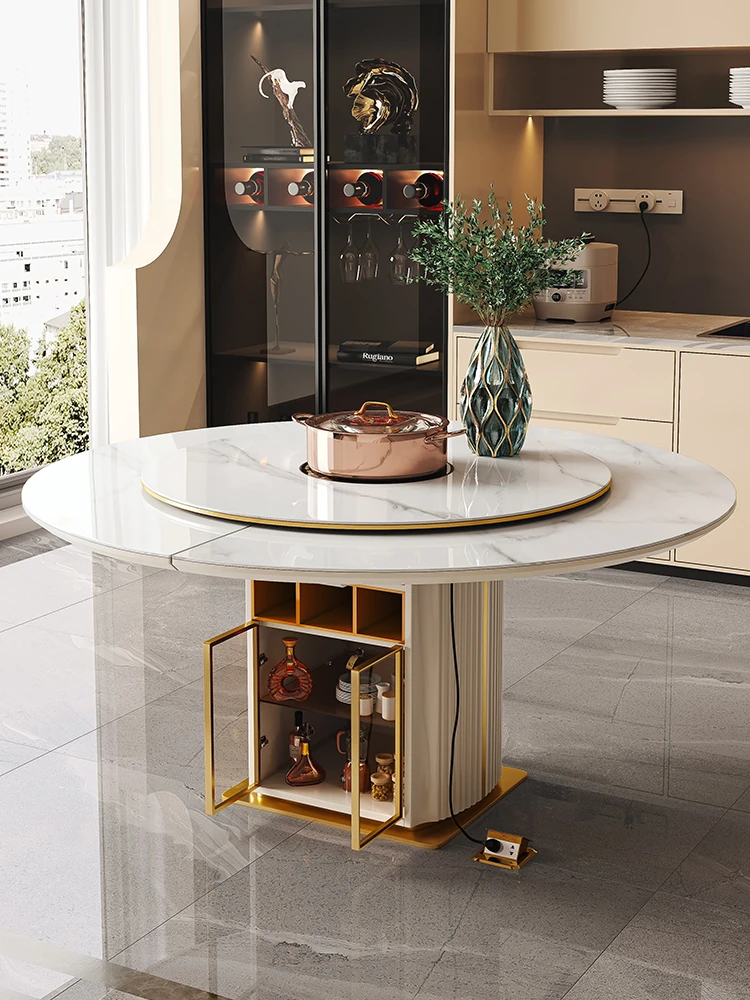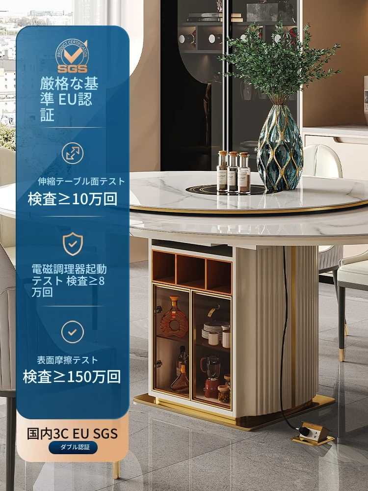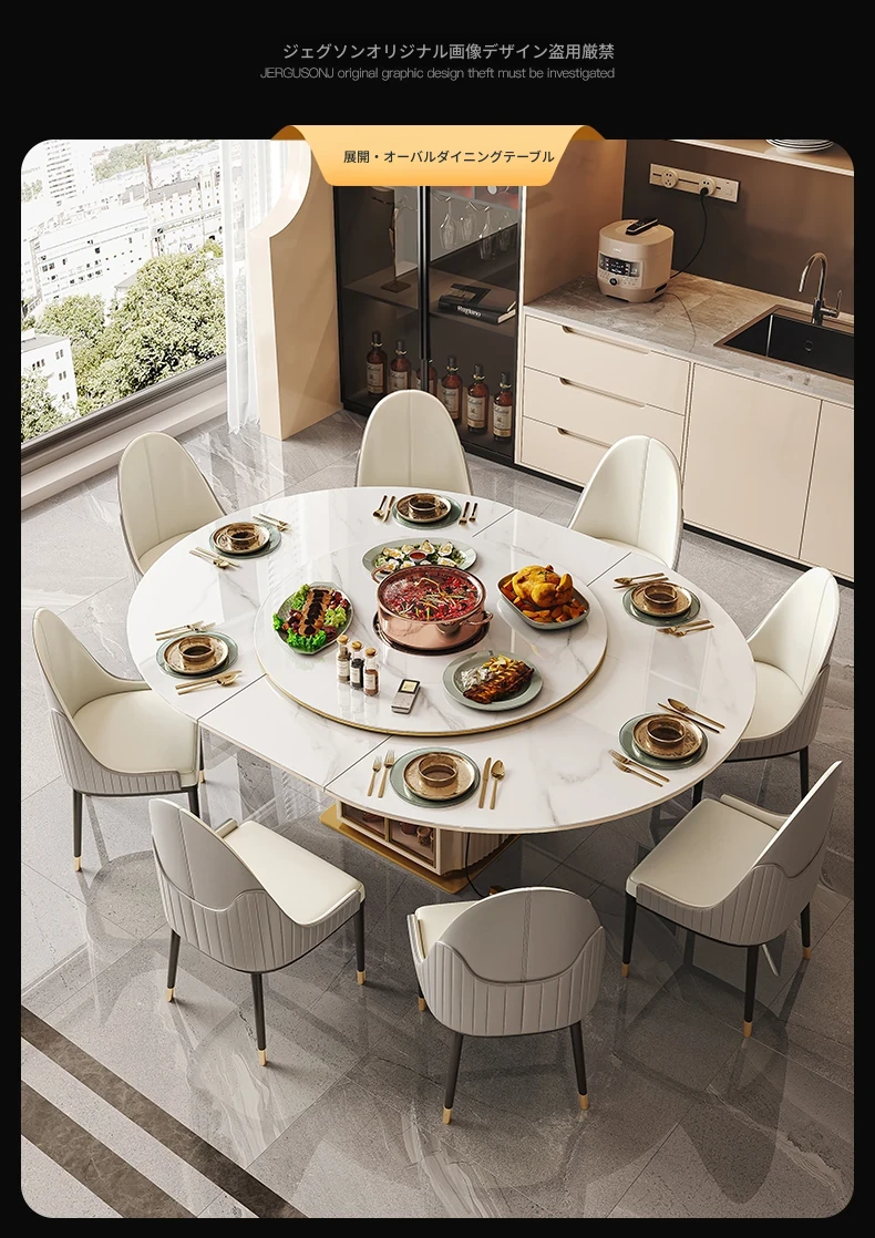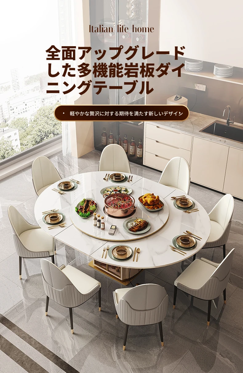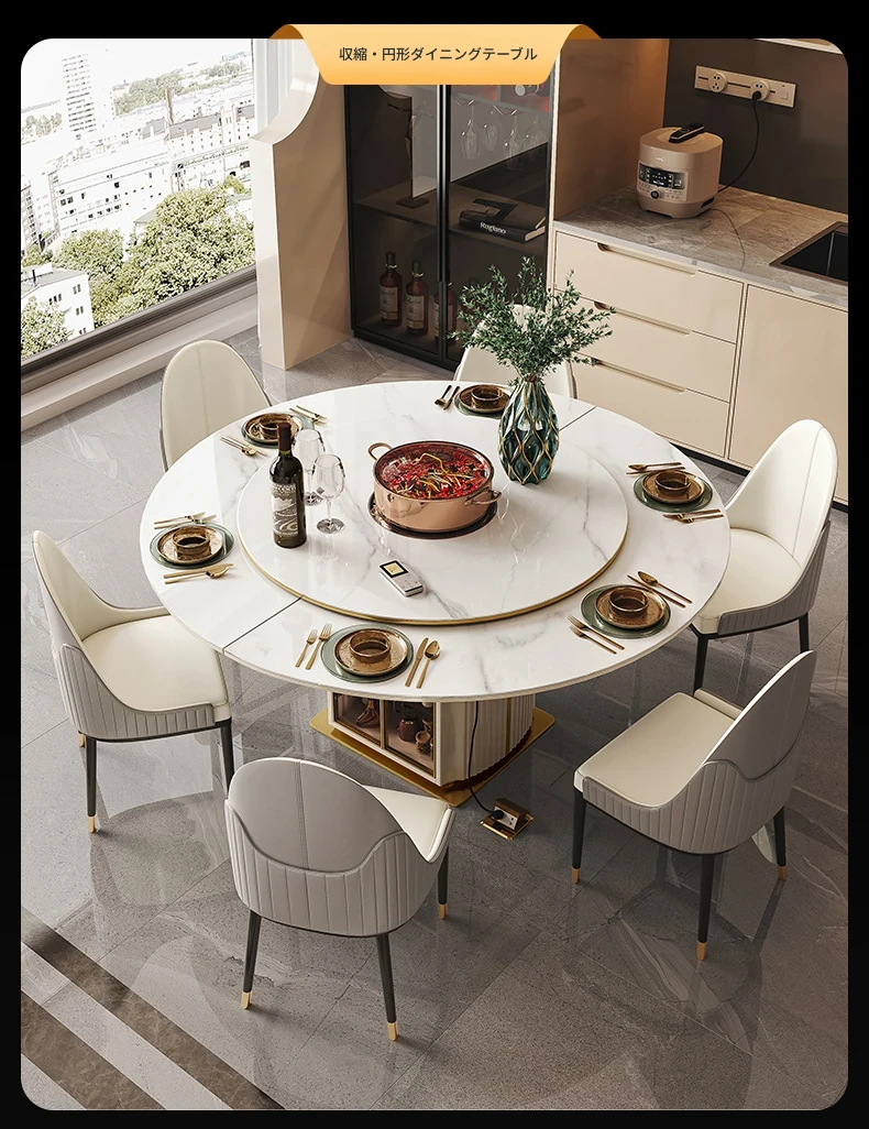 ジェグソンのラグジュアリー光沢岩板伸縮式ダイニングテーブル - 多機能電磁鍋付きモダンな円形食卓で、家族や友人との特別なひとときを演出します!