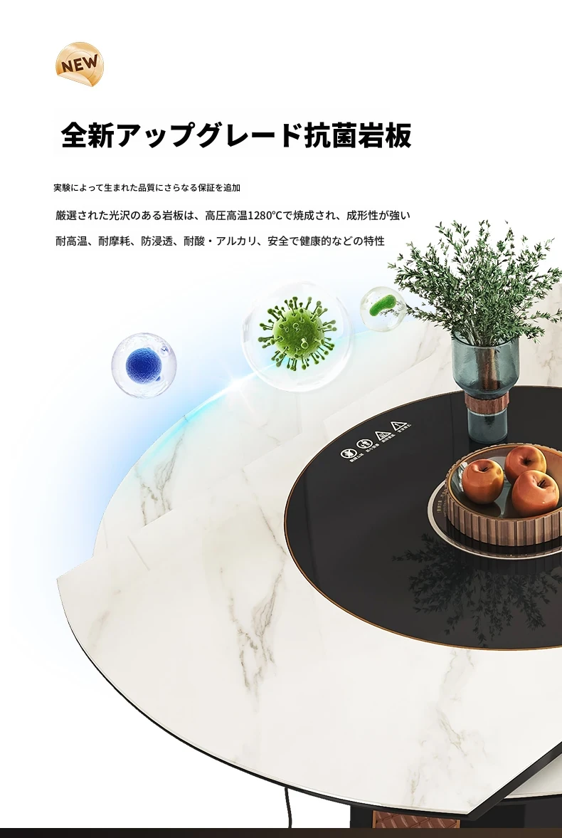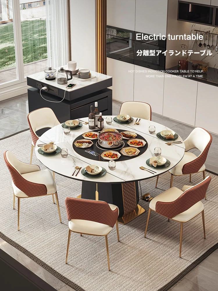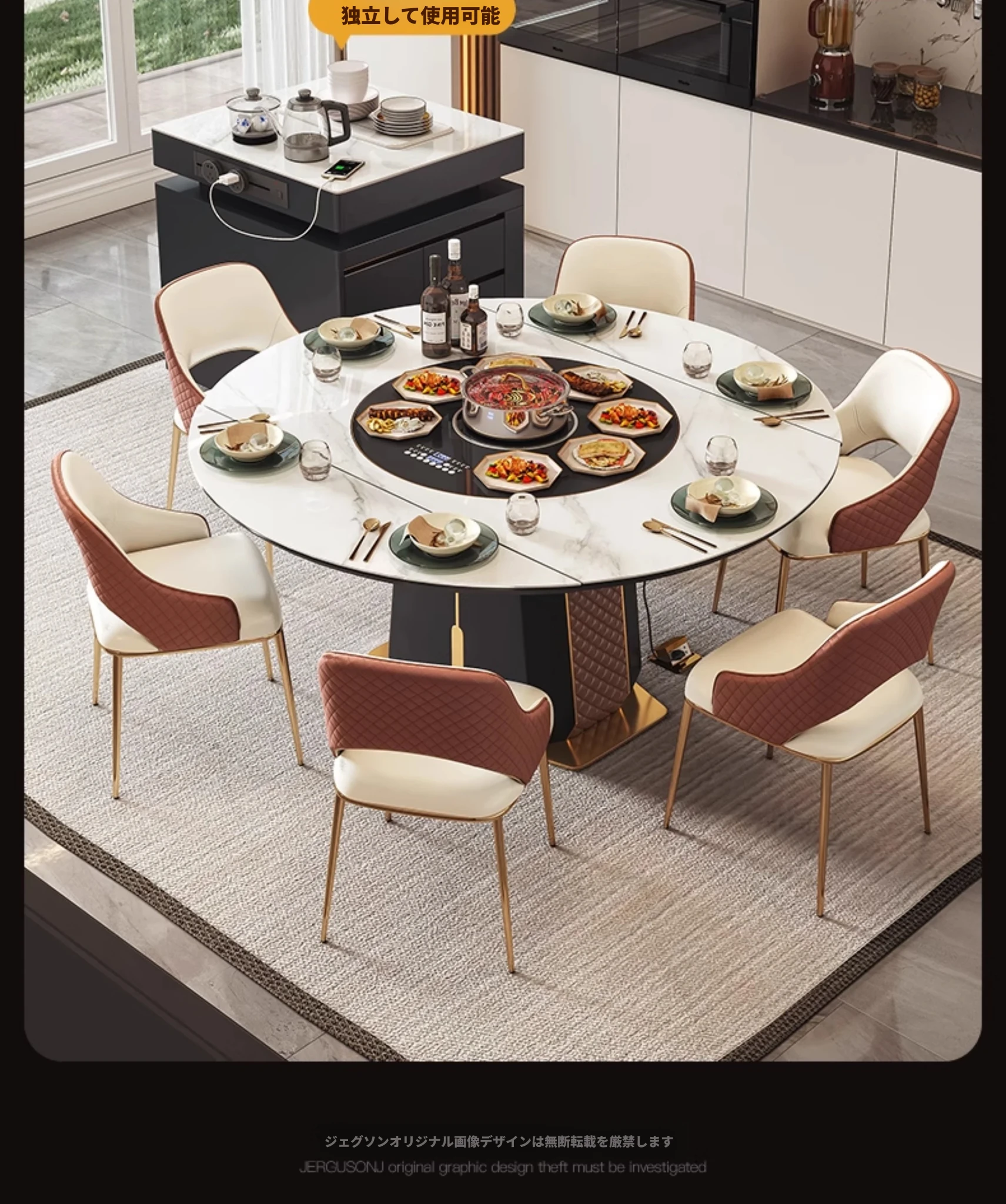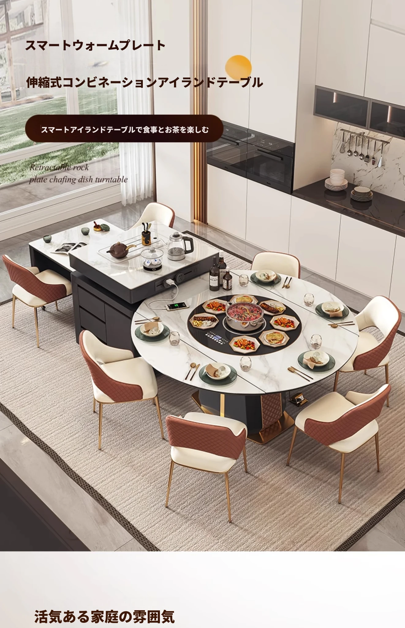電磁調理器付き伸縮式岩板テーブル - 中古クリーム風デザインの多機能円形ダイニングテーブル、火鍋も楽しめる!家族や友人との食事に最適!