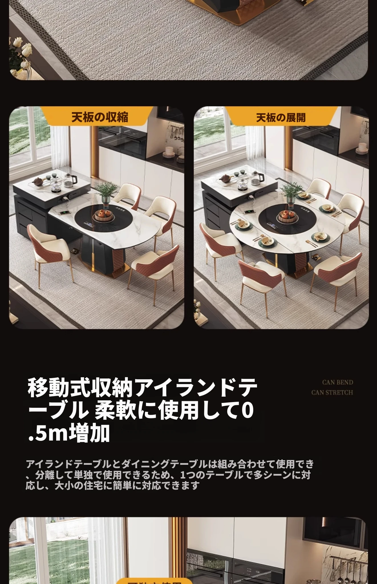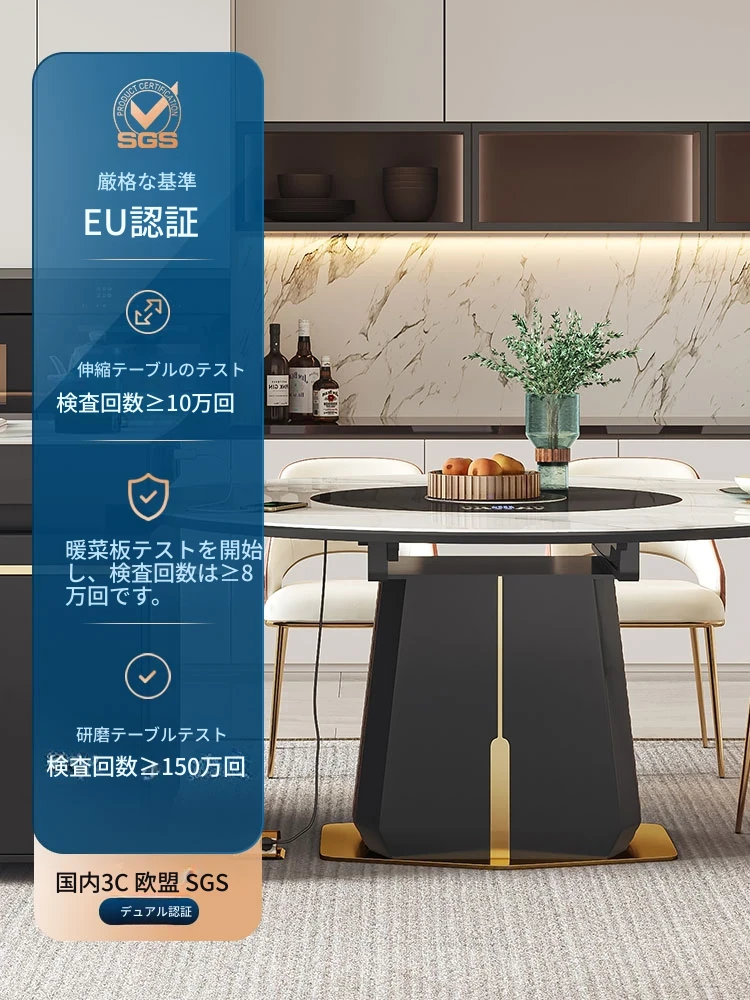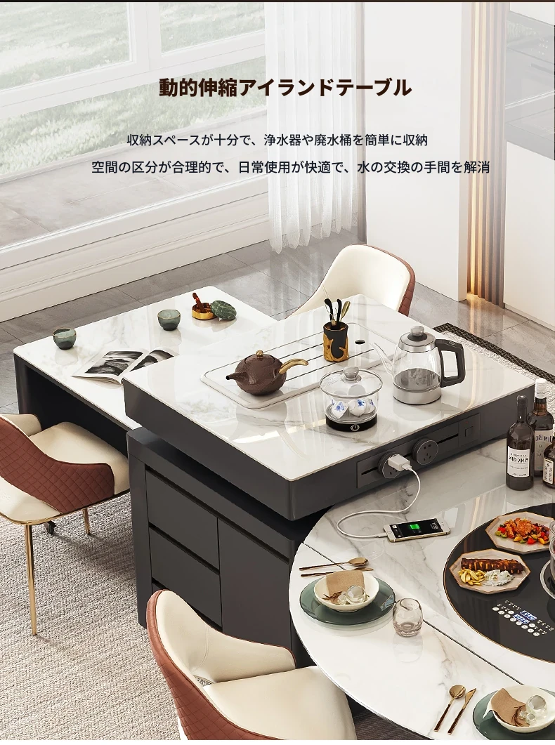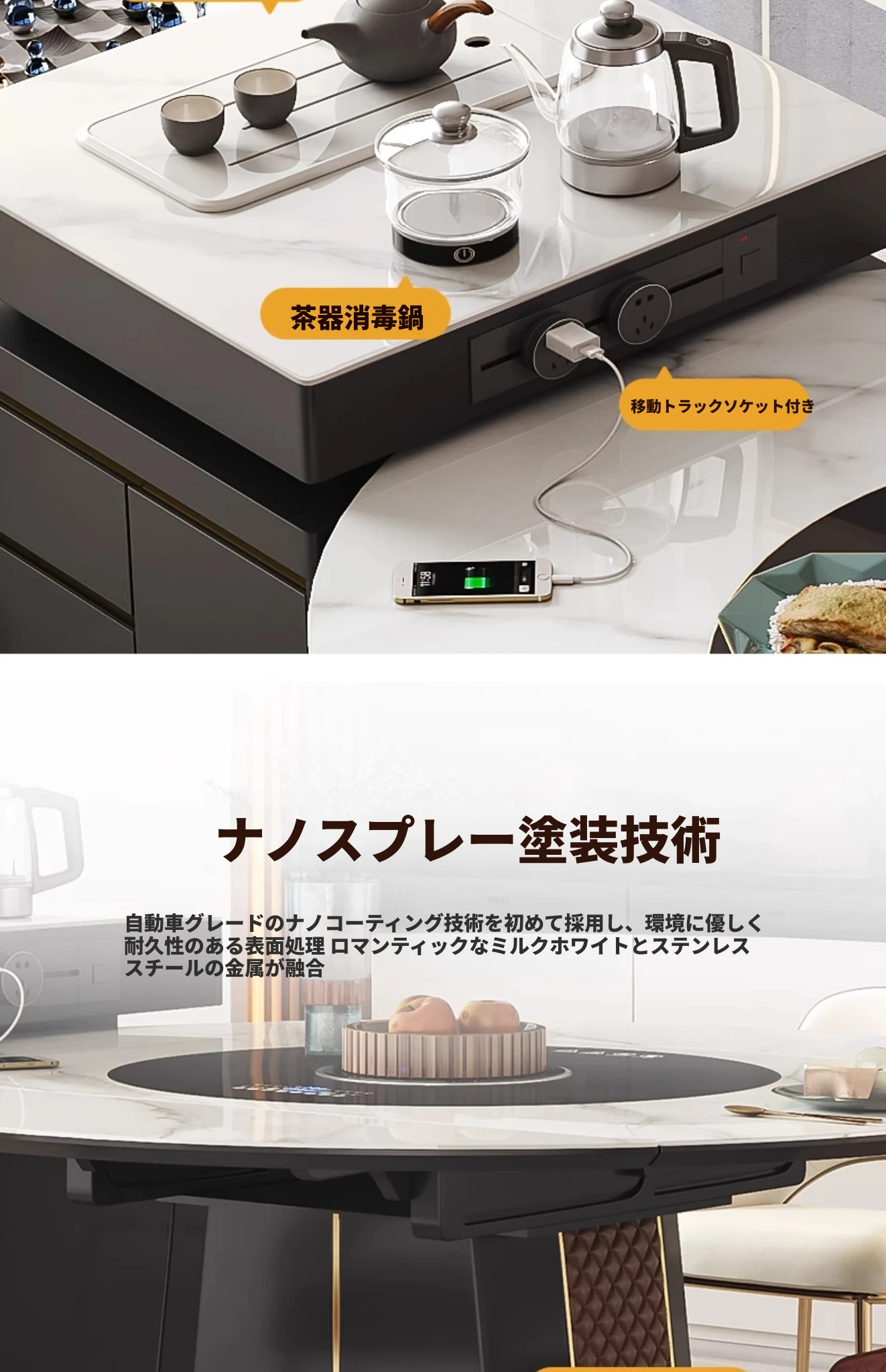 電磁調理器付き伸縮式岩板テーブル - 中古クリーム風デザインの多機能円形ダイニングテーブル、火鍋も楽しめる!家族や友人との食事に最適!