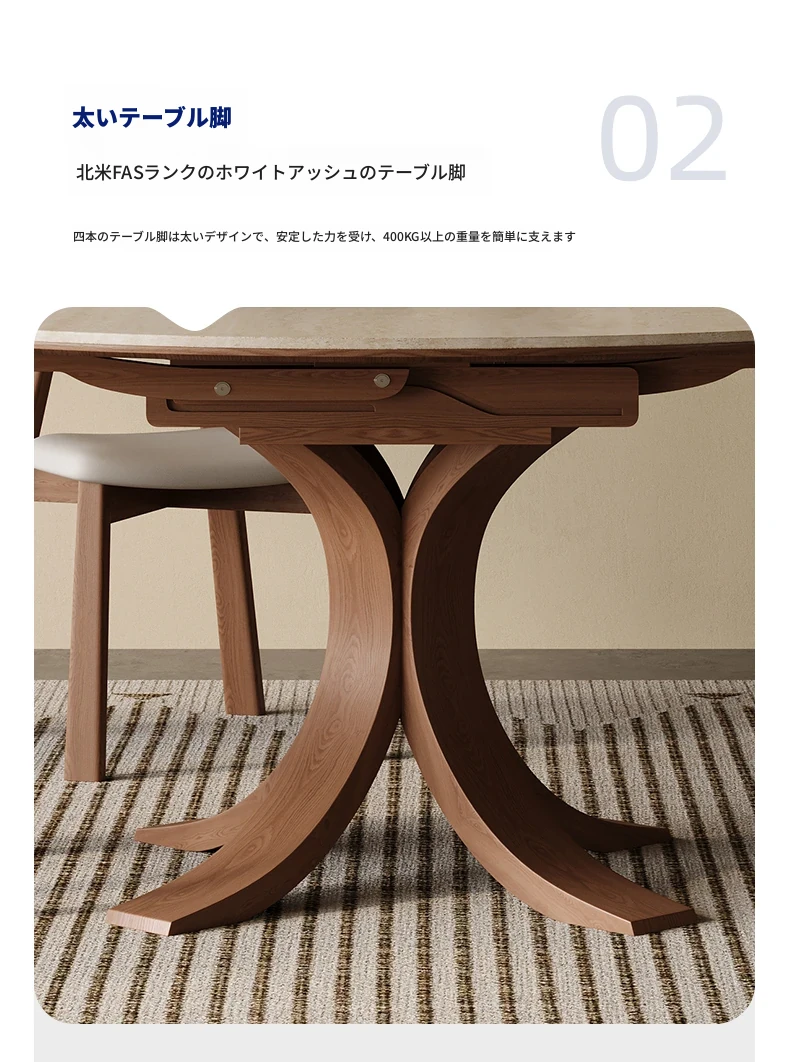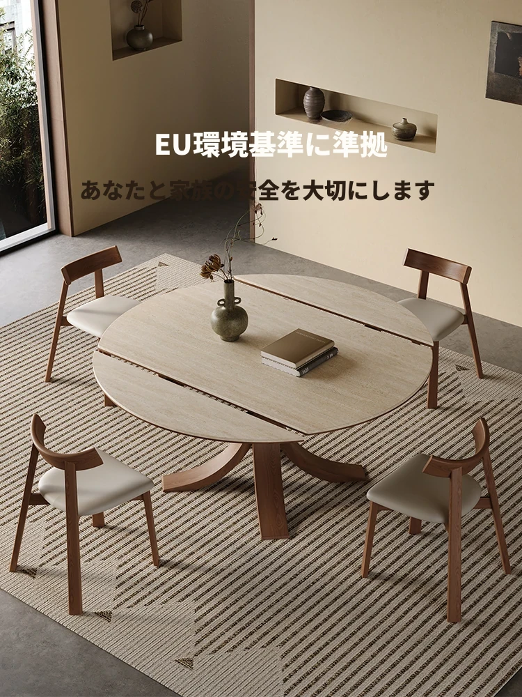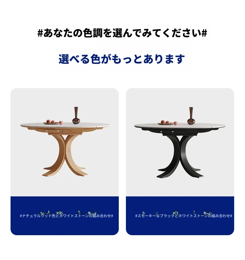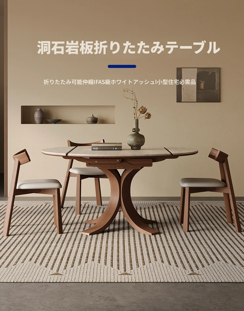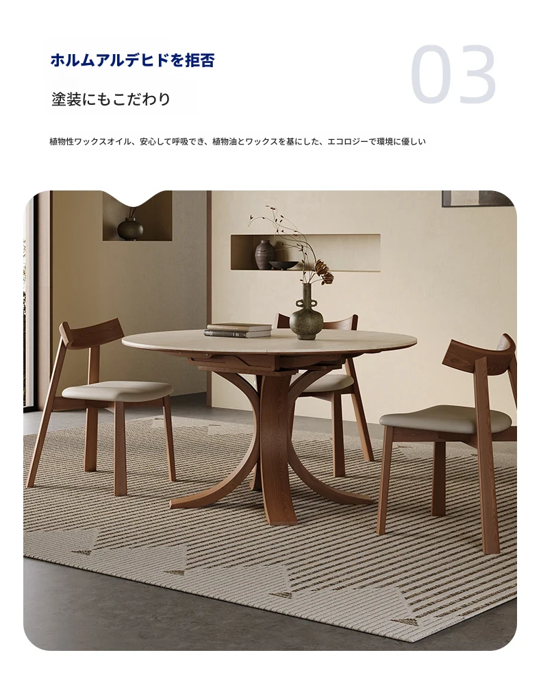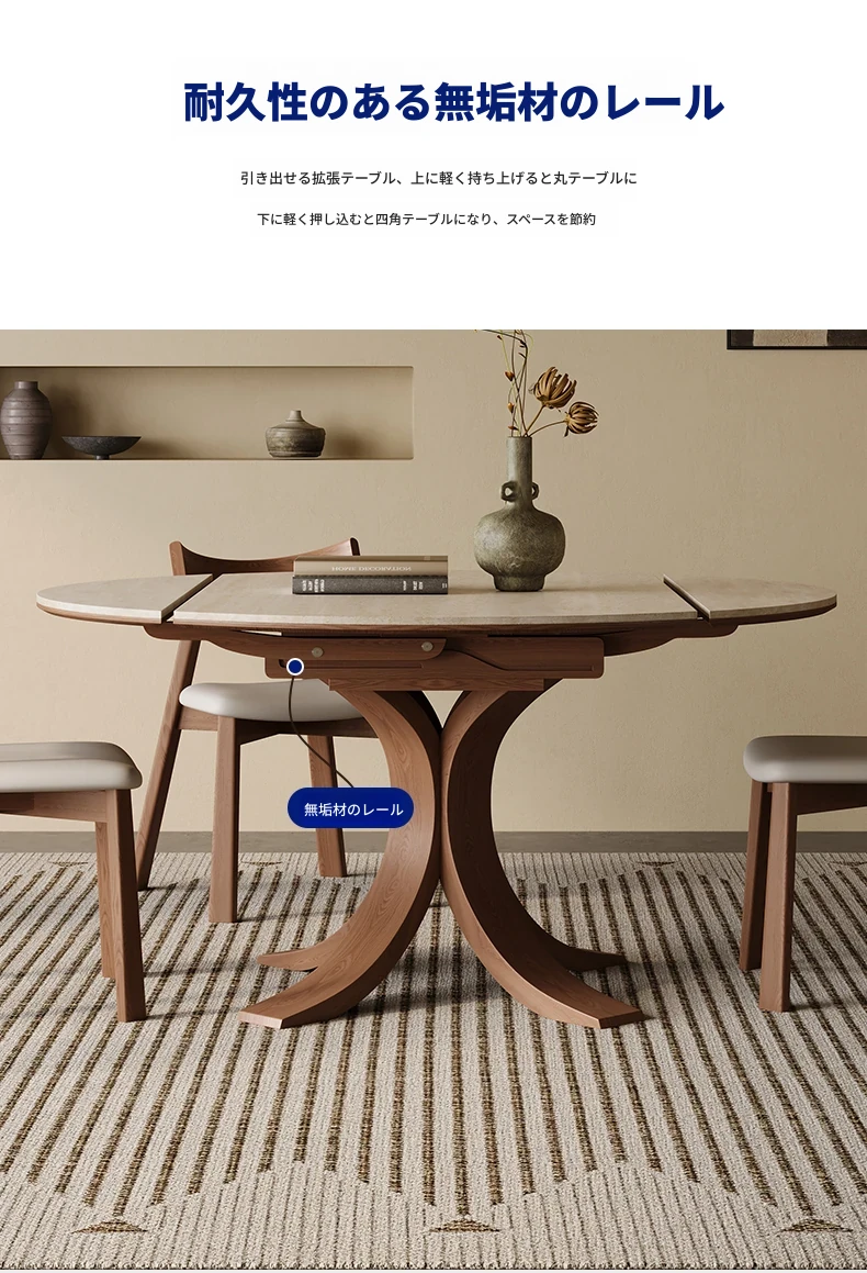 スタイリッシュな小蛮腰デザインの無垢材伸縮式ダイニングテーブル - コンパクトな家族向け、折りたたみ可能な現代的な丸型・四角型両用テーブル!おしゃれで機能的な空間を演出します。