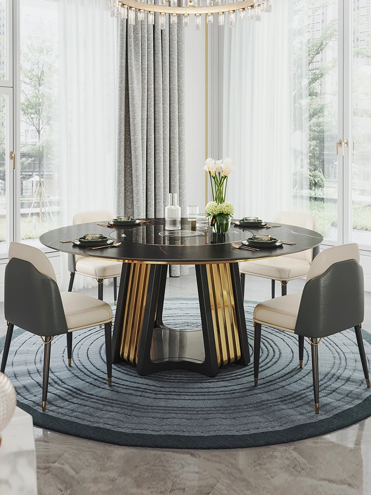 モダンな軽奢料理スタイルの1.5m円形木製テーブル - 電磁炉付き回転式、シンプルなデザインで最大6人まで対応!スタイリッシュな黒色のダイニングテーブルで、優雅な食事空間を演出します。