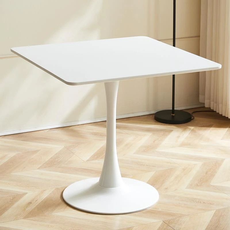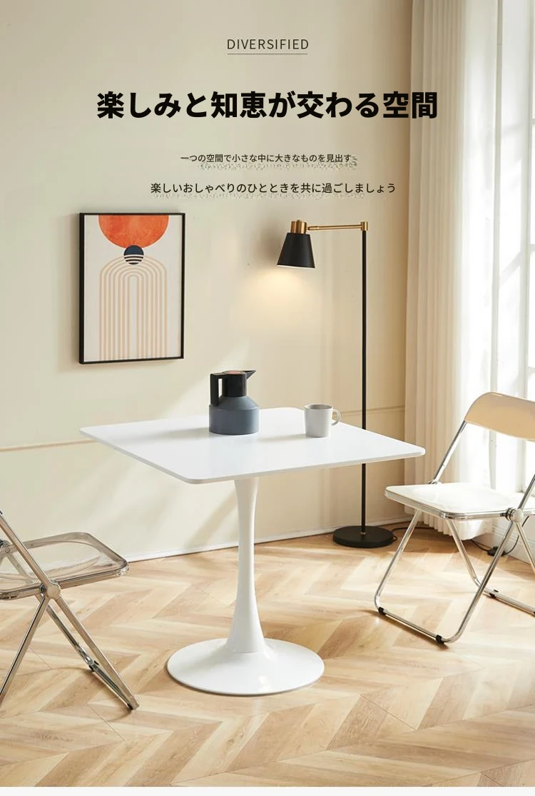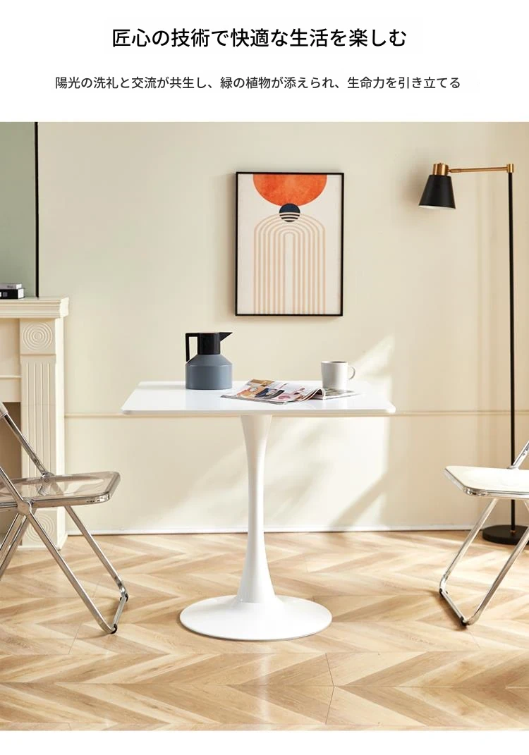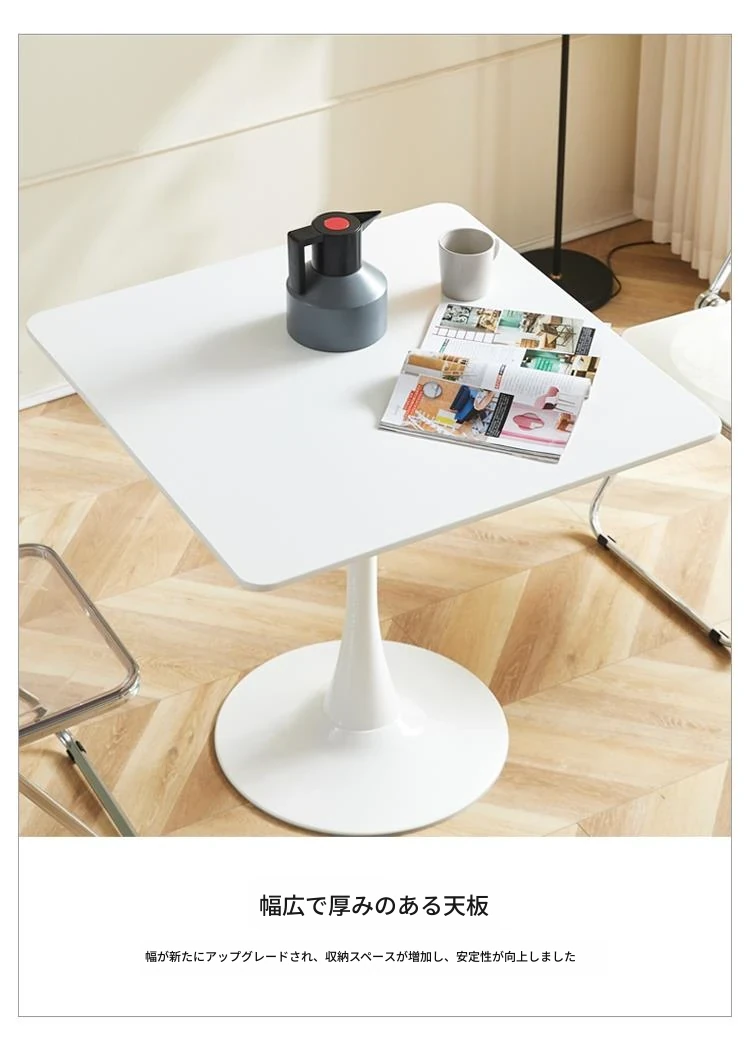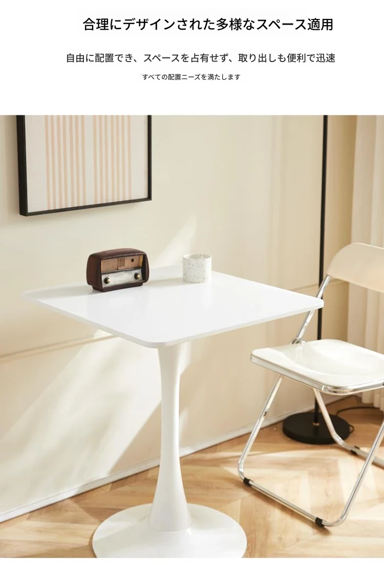 シンプルでモダンなホワイトスクエアダイニングテーブル - 小型住宅に最適!カフェやティールーム、バルコニーの会話を楽しむための完璧な選択。おしゃれで機能的、どんなインテリアにもぴったりです!