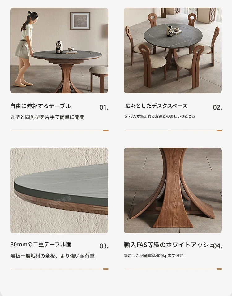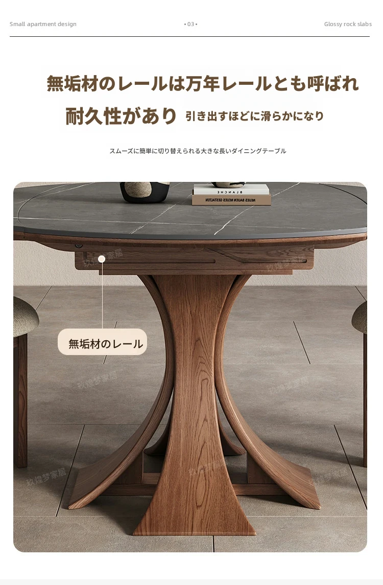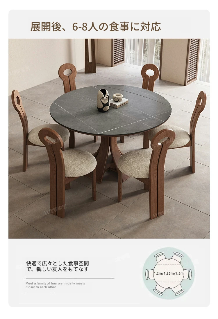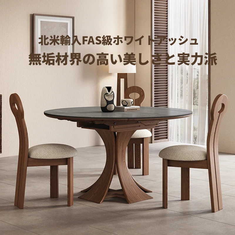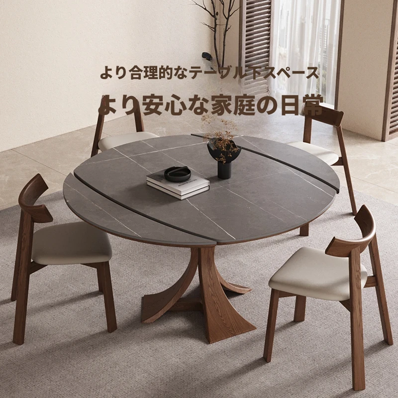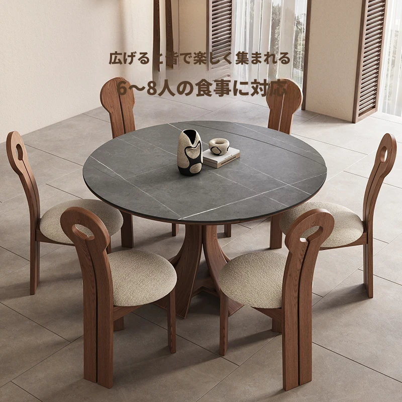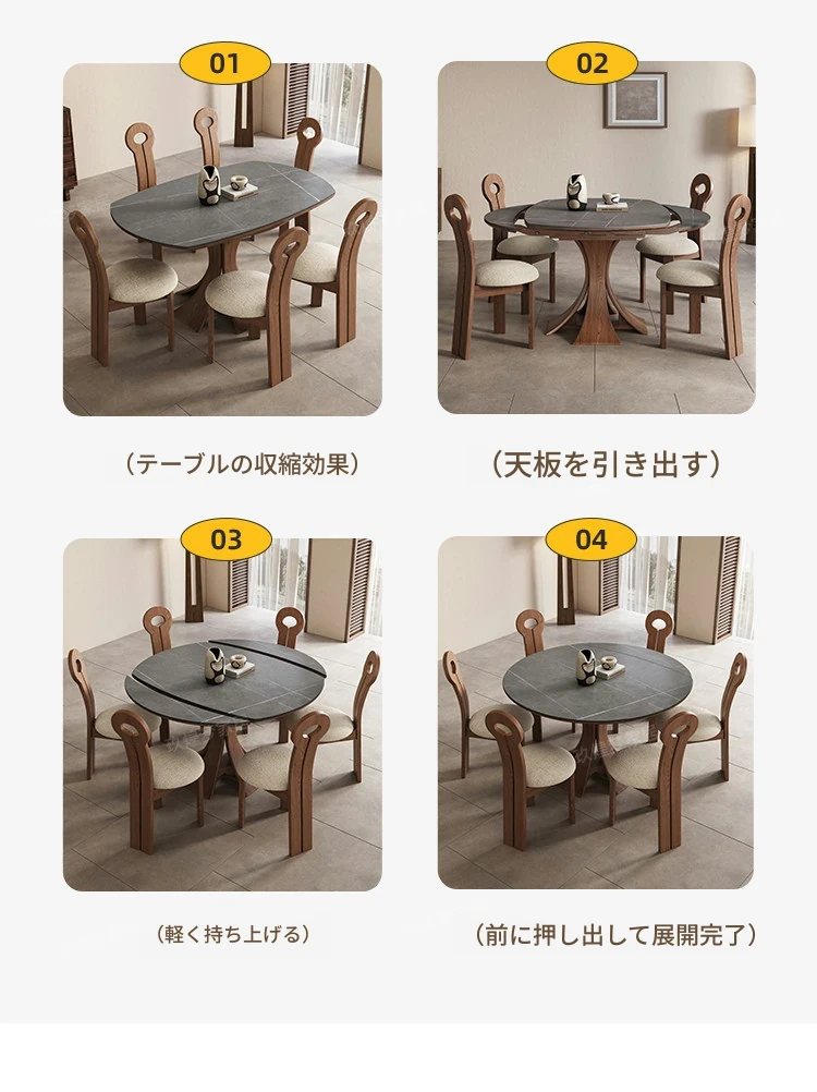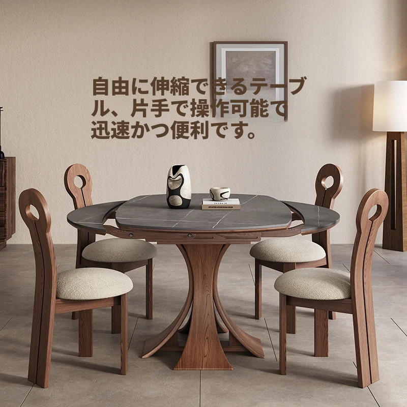 北欧デザインの伸縮式ラウンド岩板ダイニングテーブル - 小スペースに最適!角丸両用の折りたたみ可能な天然木製テーブルで、家族や友人との食事を楽しむための完璧なアイテムです。