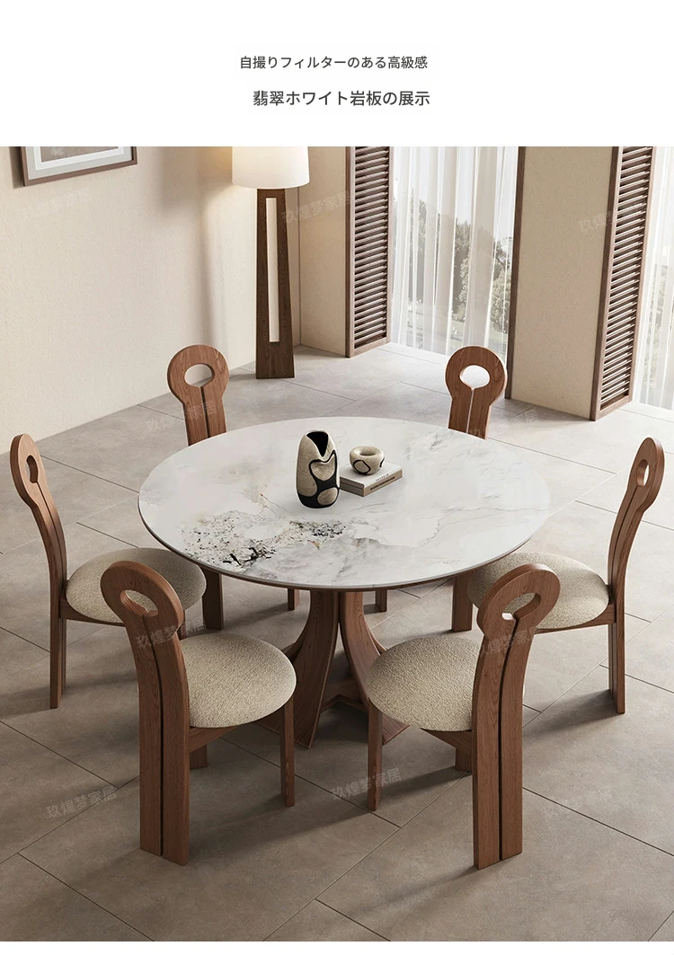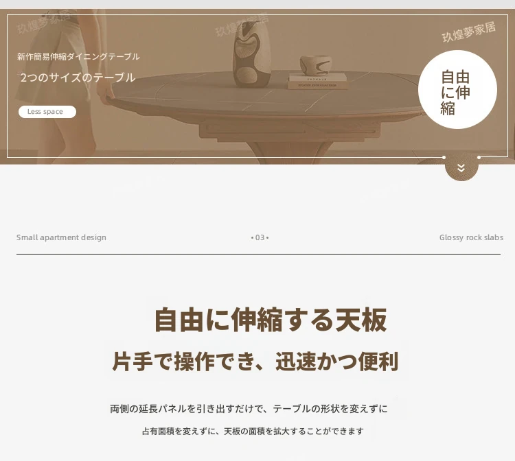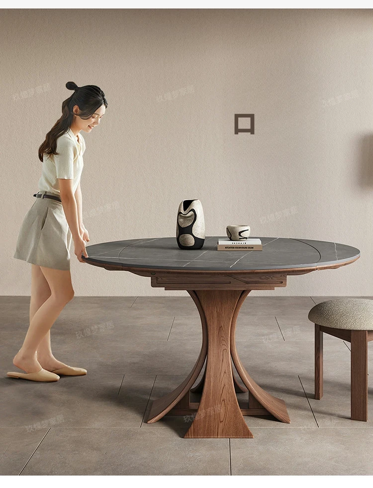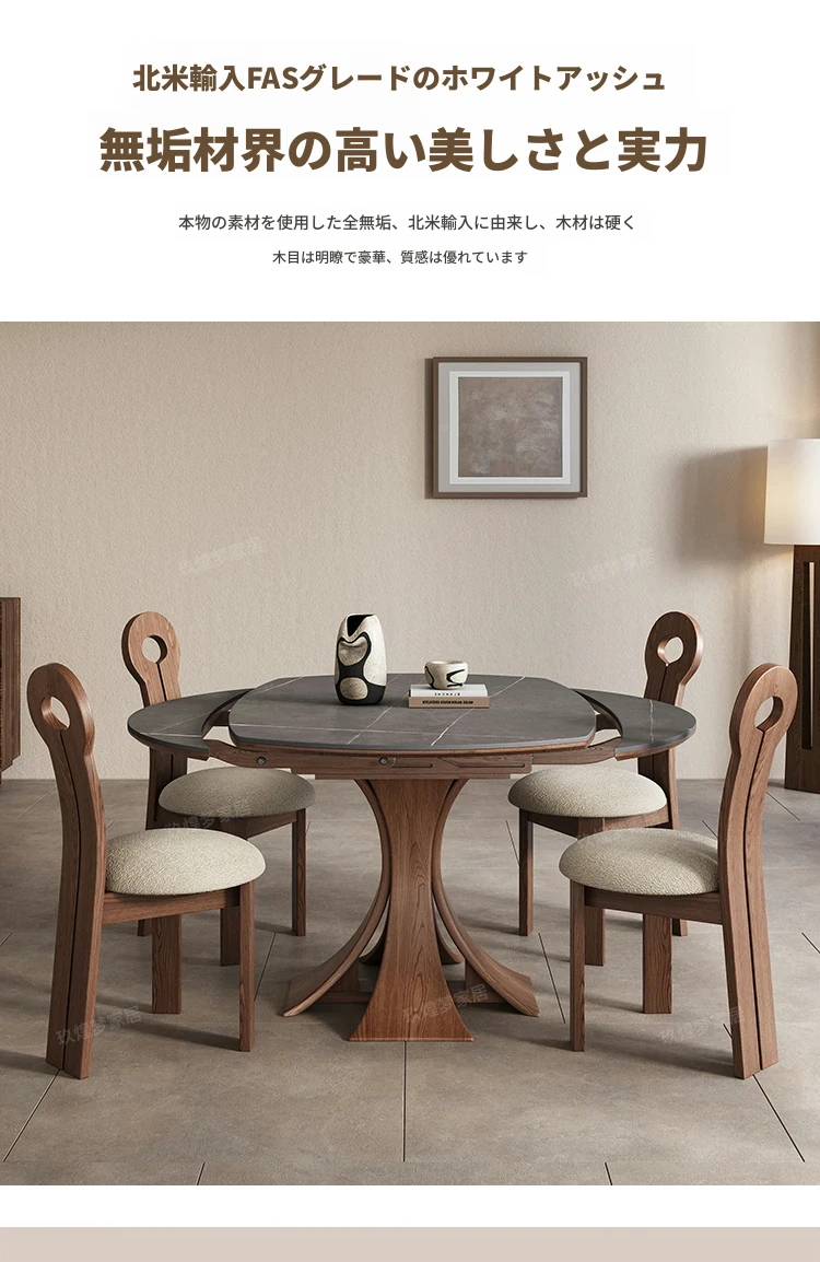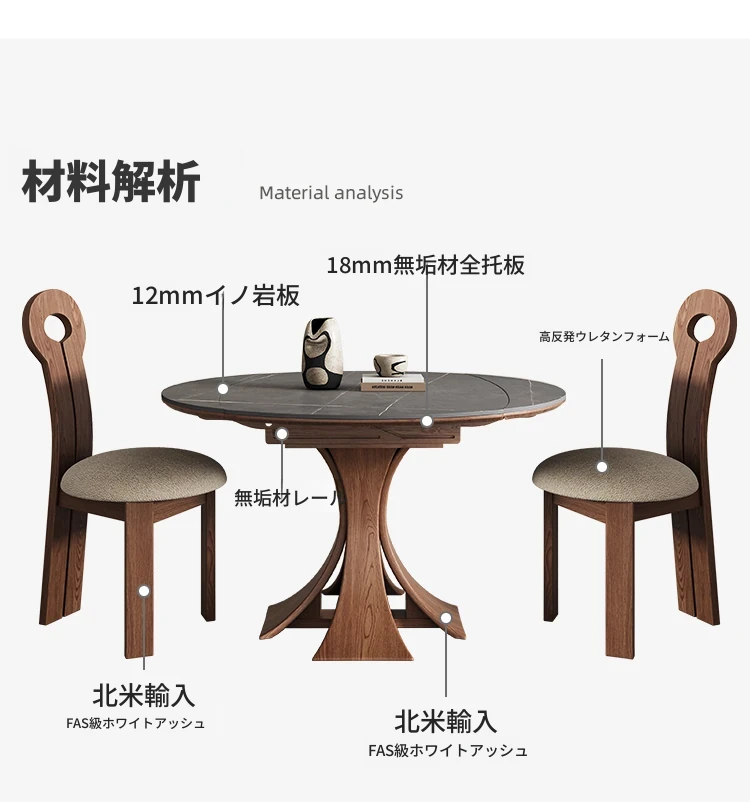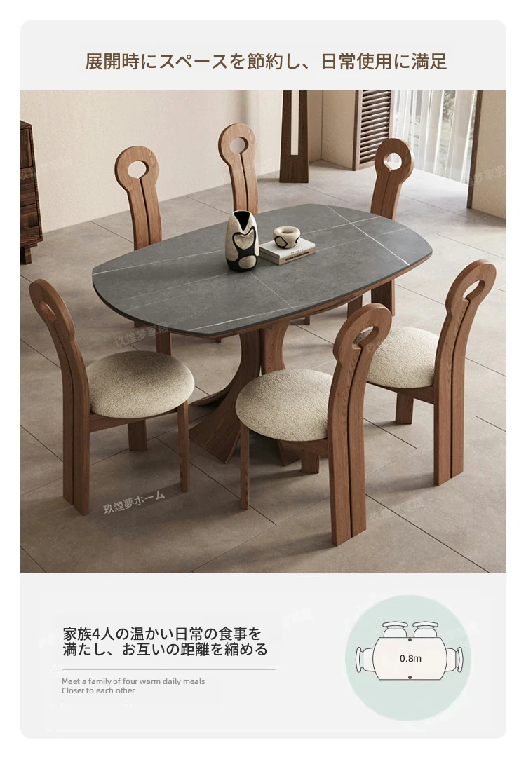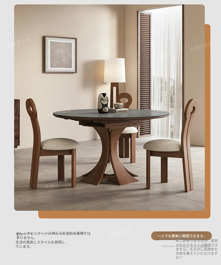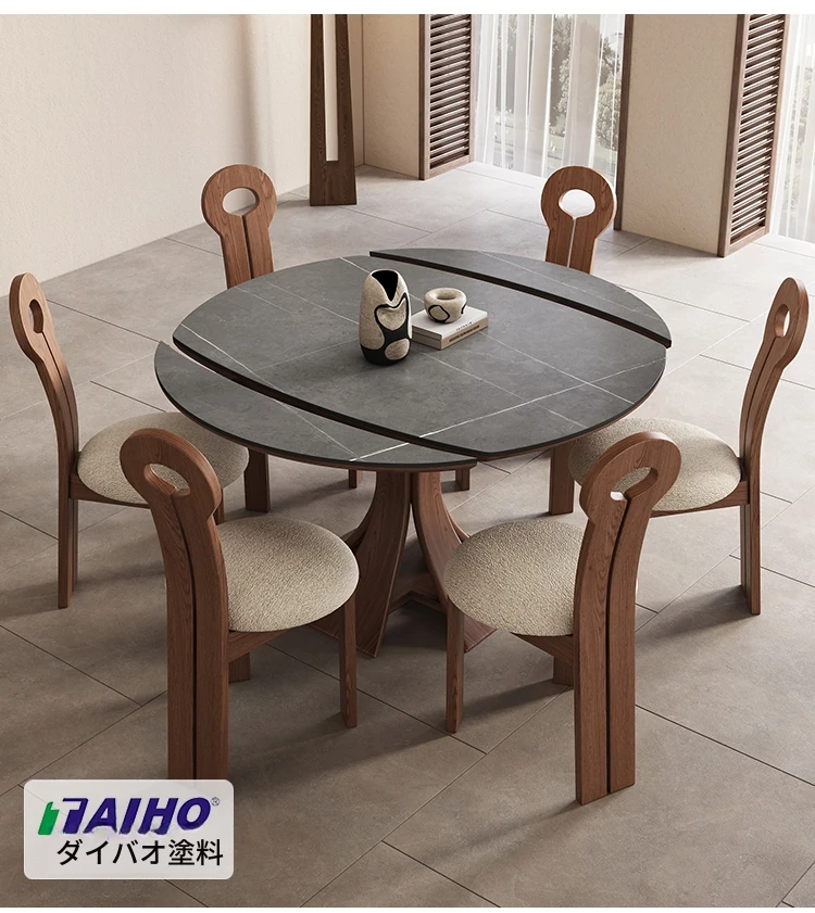 北欧デザインの伸縮式ラウンド岩板ダイニングテーブル - 小スペースに最適!角丸両用の折りたたみ可能な天然木製テーブルで、家族や友人との食事を楽しむための完璧なアイテムです。