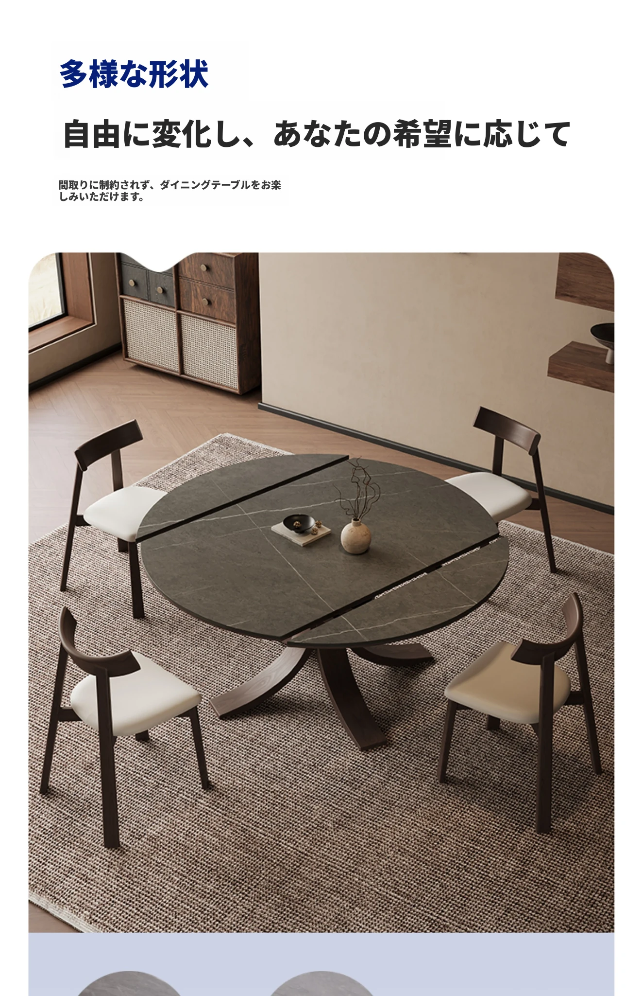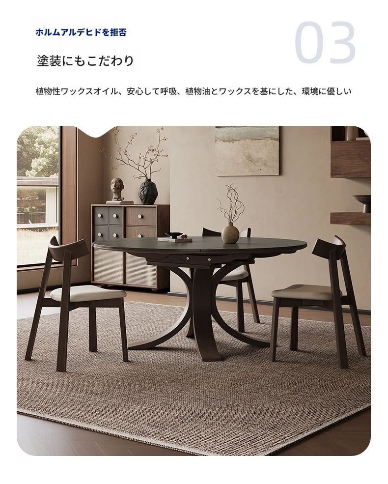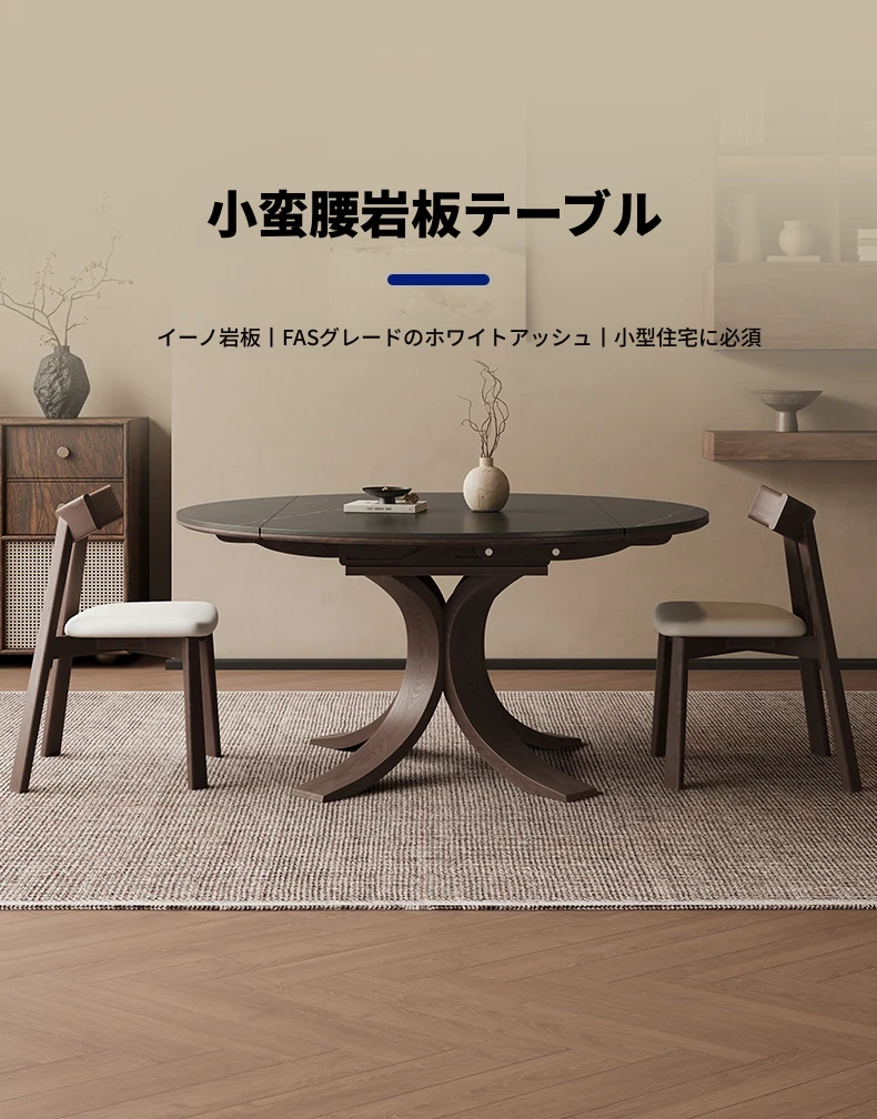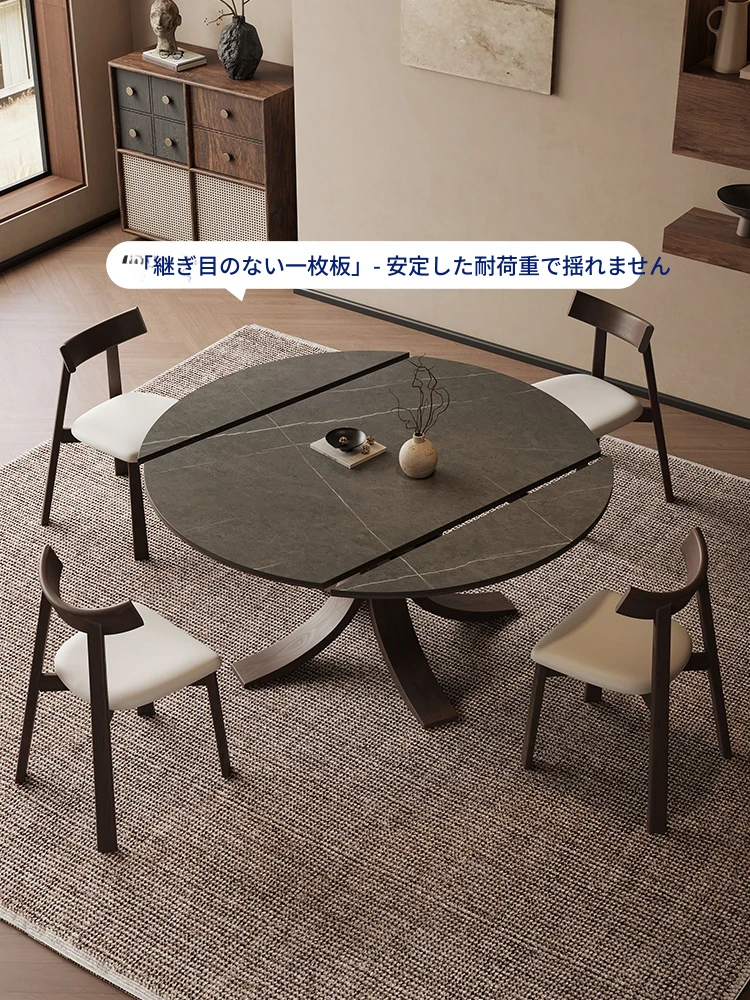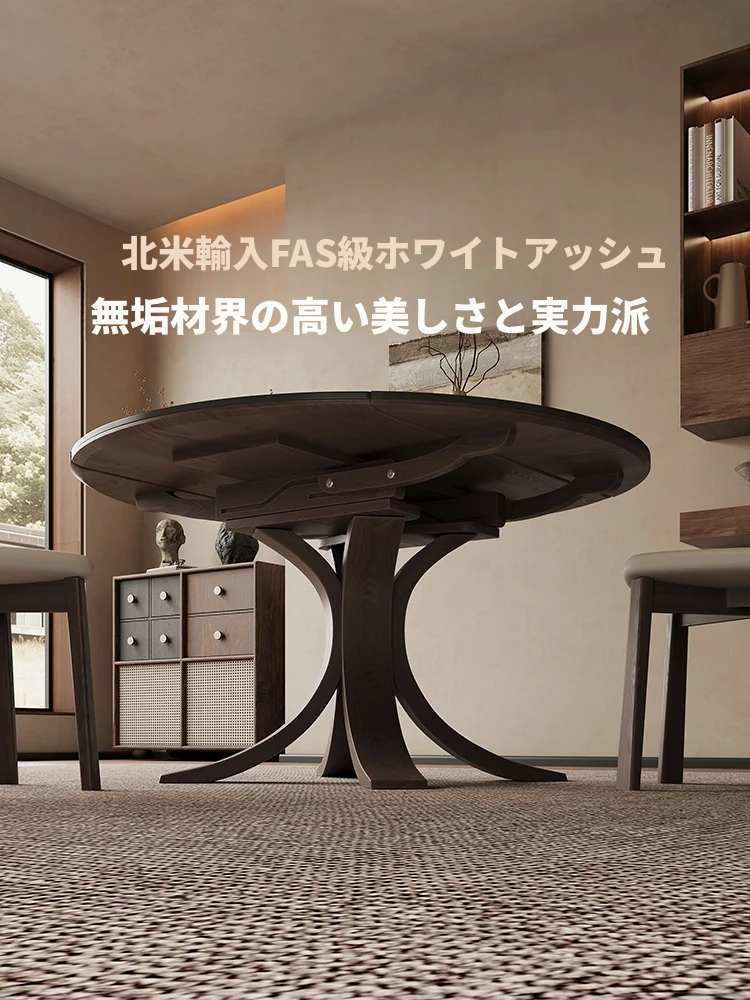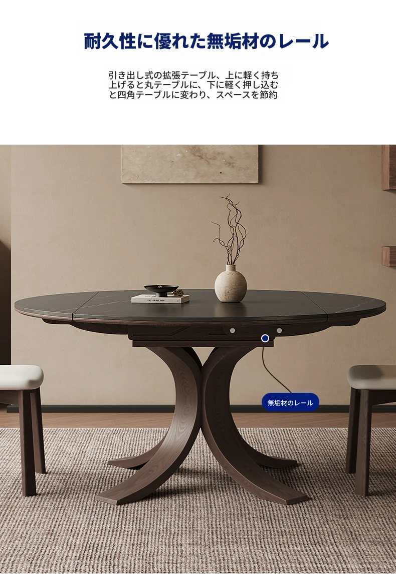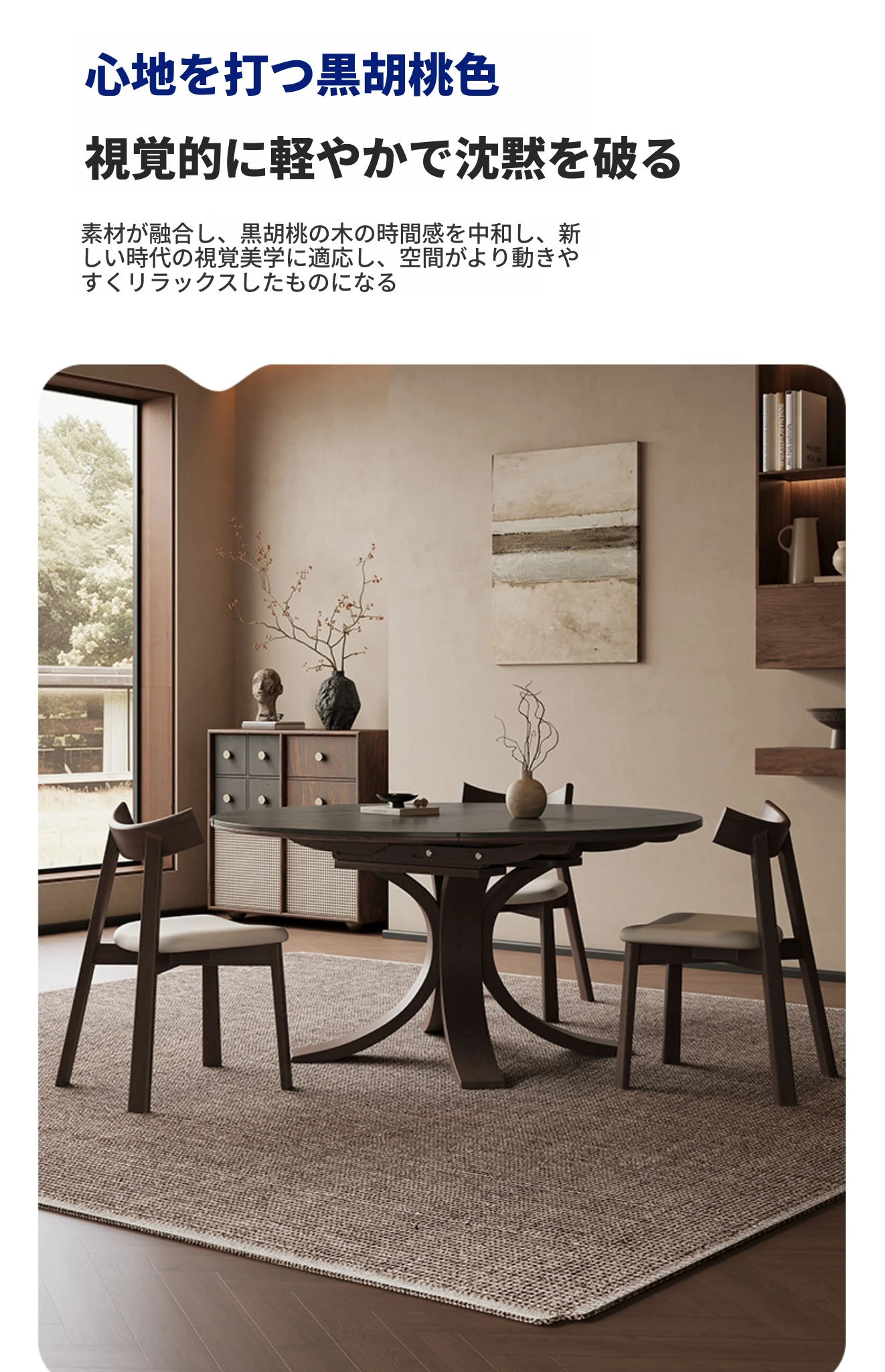 ブラックウォールナット色のスリムな無垢材ロックボード伸縮式丸型ダイニングテーブル - 小型住宅に最適!四角形と丸形の2通りで折りたためる便利なデザイン。おしゃれで機能的な空間を演出します。