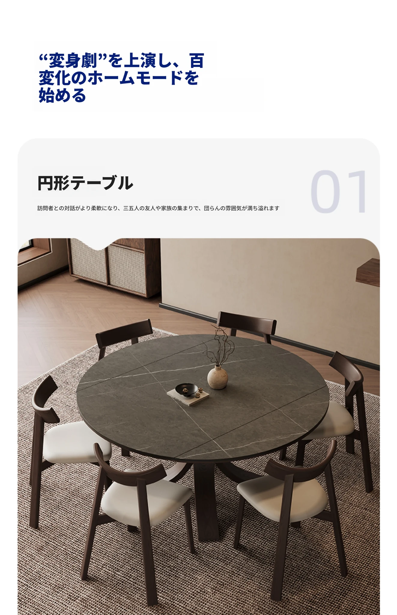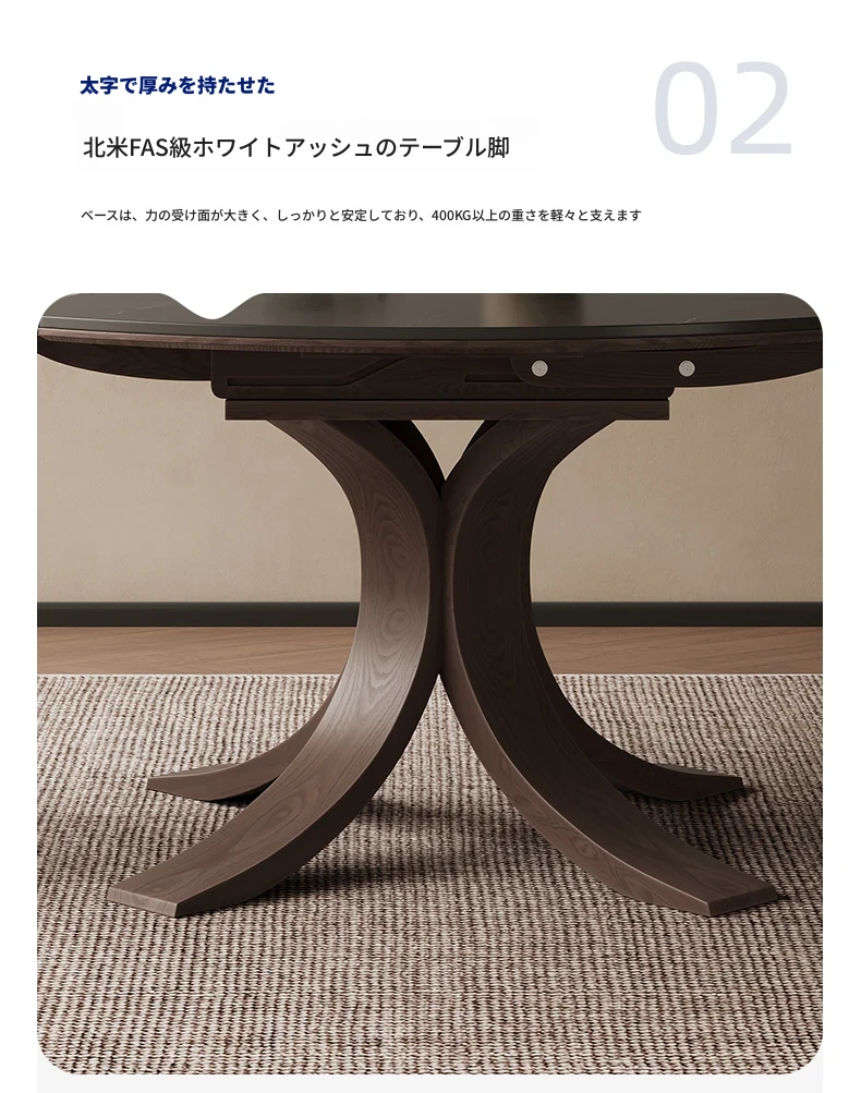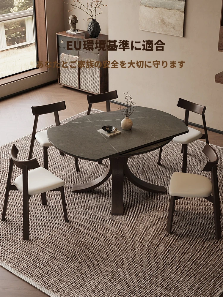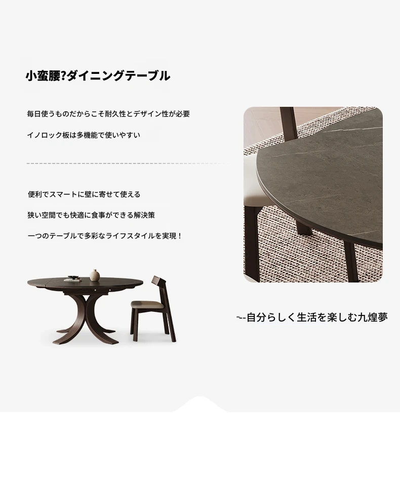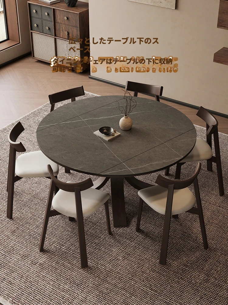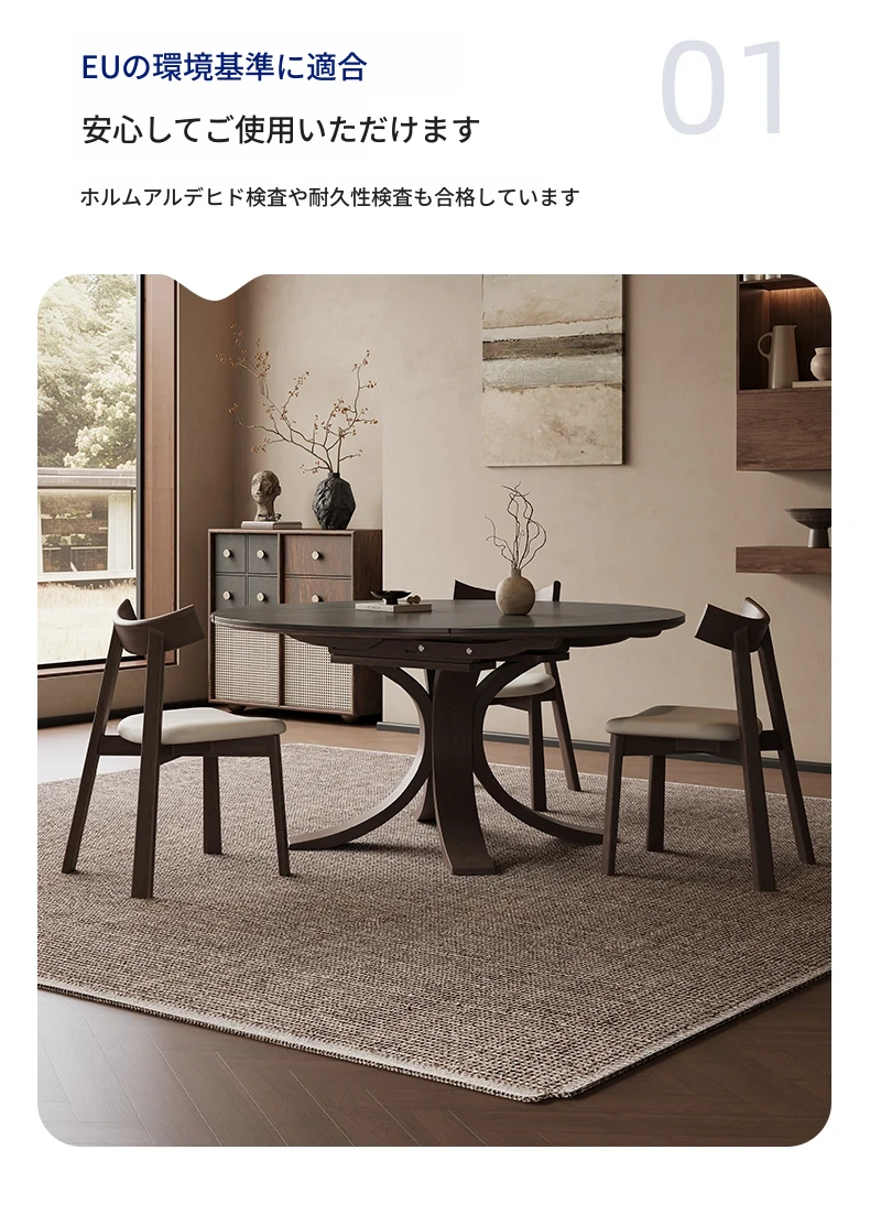 ブラックウォールナット色のスリムな無垢材ロックボード伸縮式丸型ダイニングテーブル - 小型住宅に最適!四角形と丸形の2通りで折りたためる便利なデザイン。おしゃれで機能的な空間を演出します。