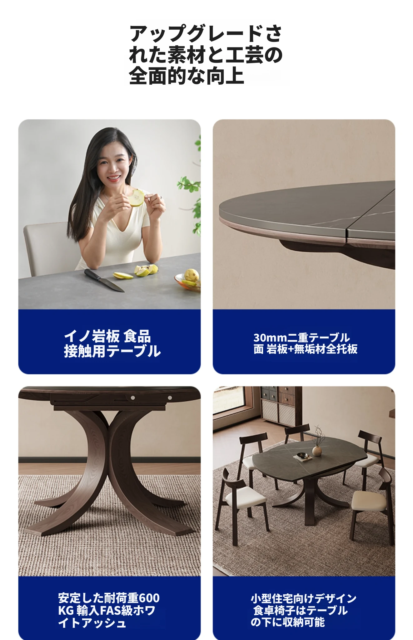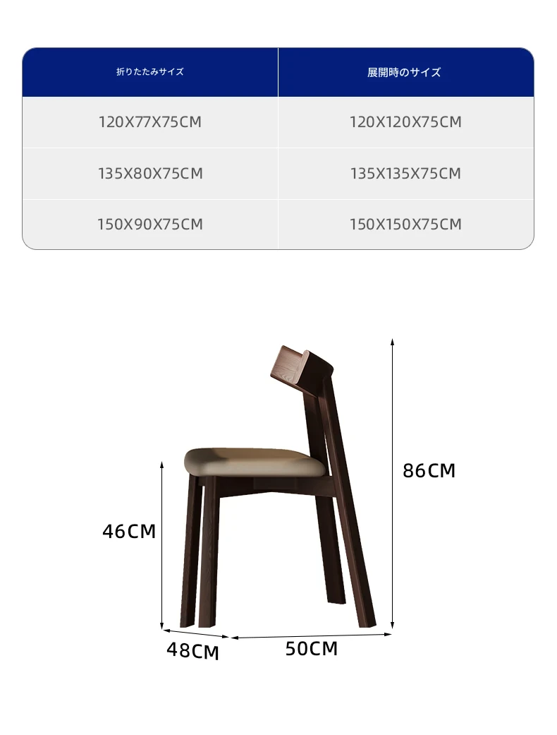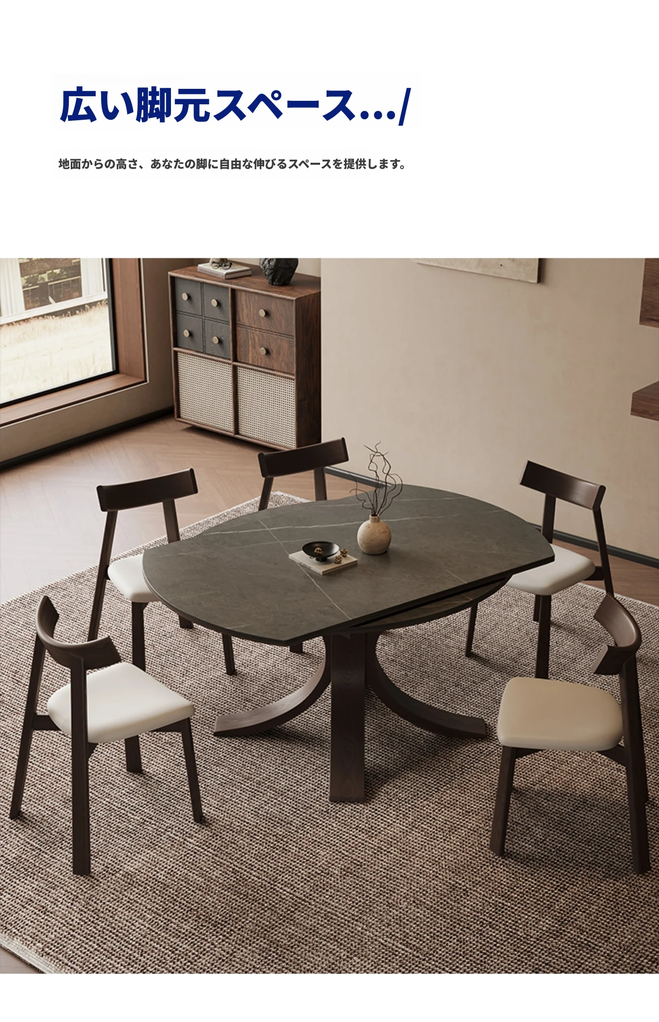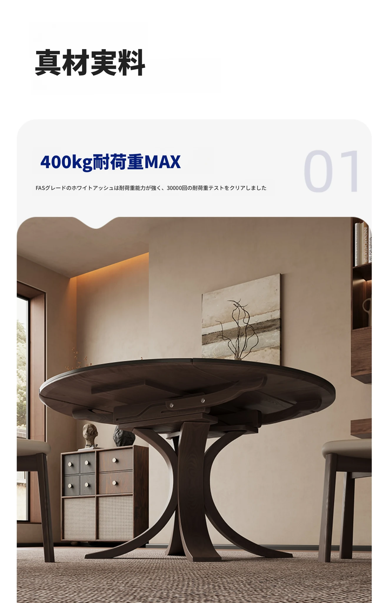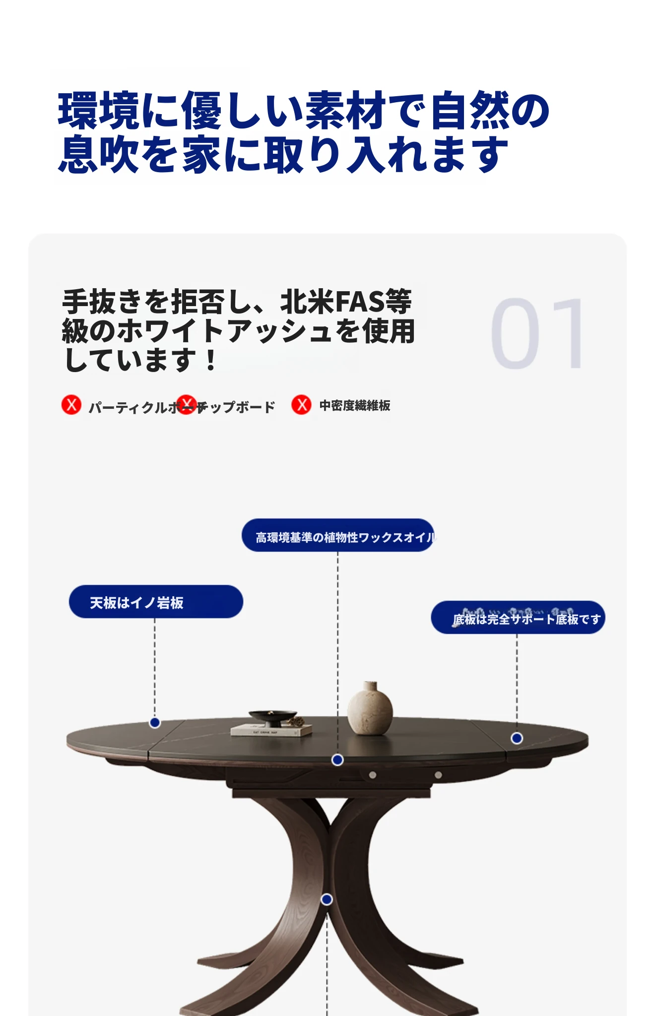 ブラックウォールナット色のスリムな無垢材ロックボード伸縮式丸型ダイニングテーブル - 小型住宅に最適!四角形と丸形の2通りで折りたためる便利なデザイン。おしゃれで機能的な空間を演出します。